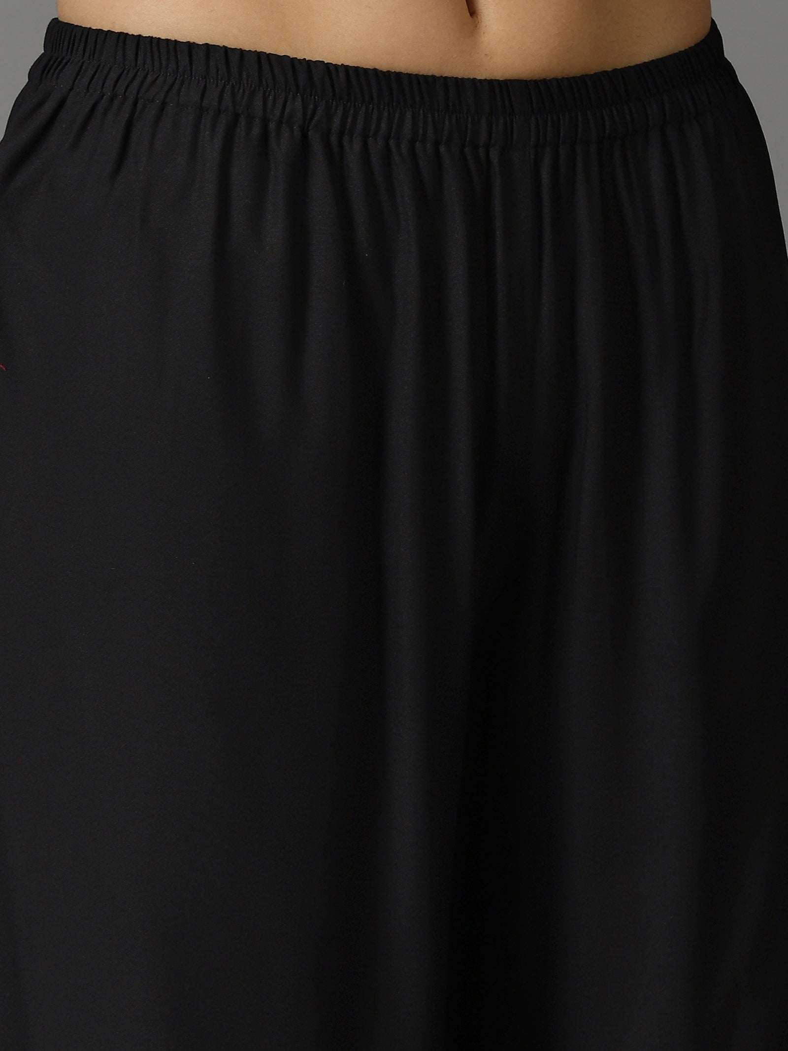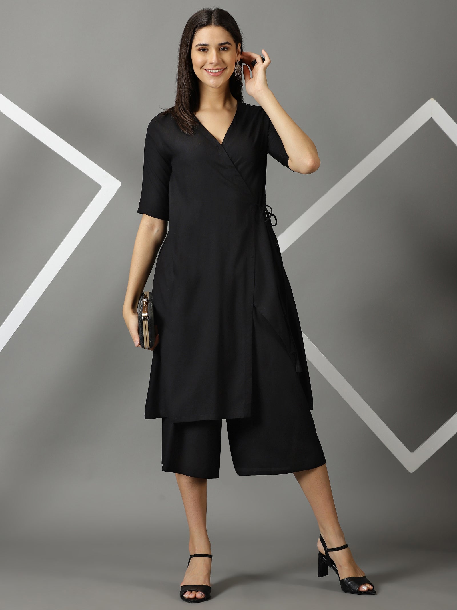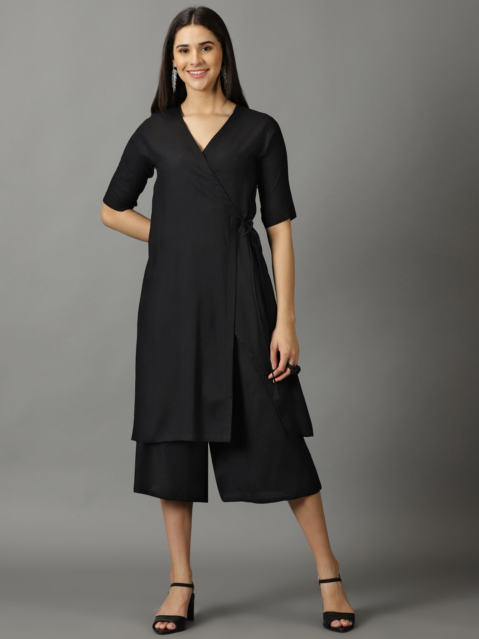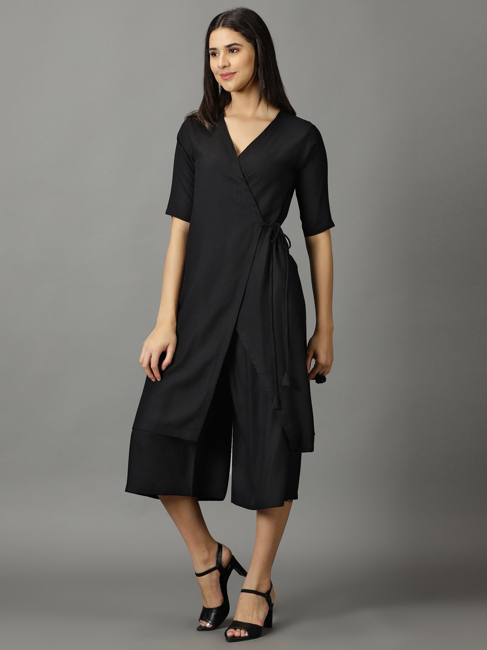 Our 2-piece black rayon solid angrakha suit set features a wrap kurta with a v-neckline and three-quarter sleeves. Complemented with short palazzos with partially elasticated waistband . This style is perfect for outing with friends.