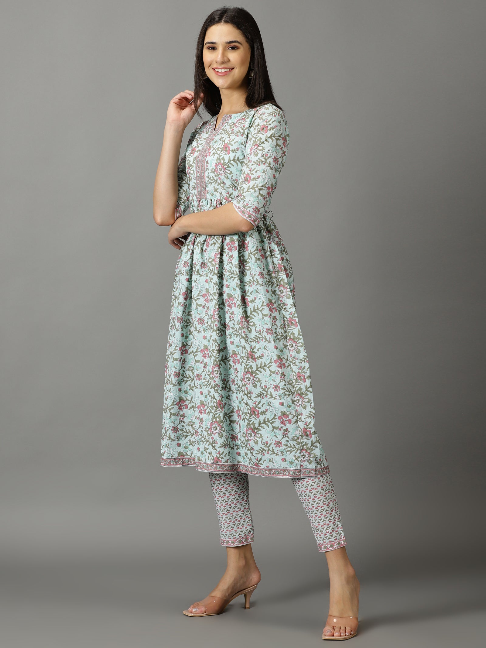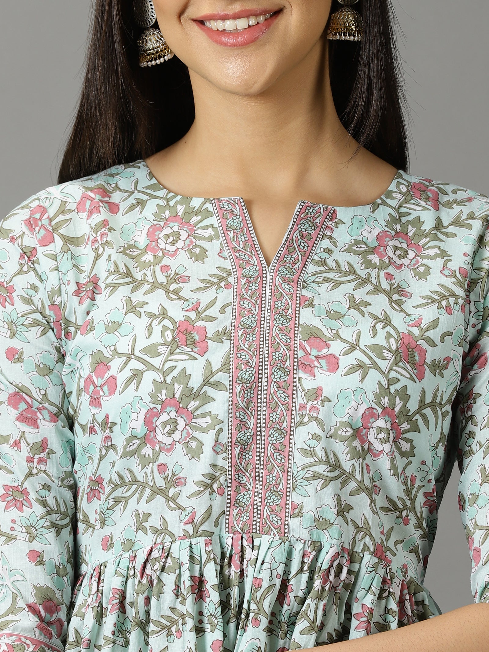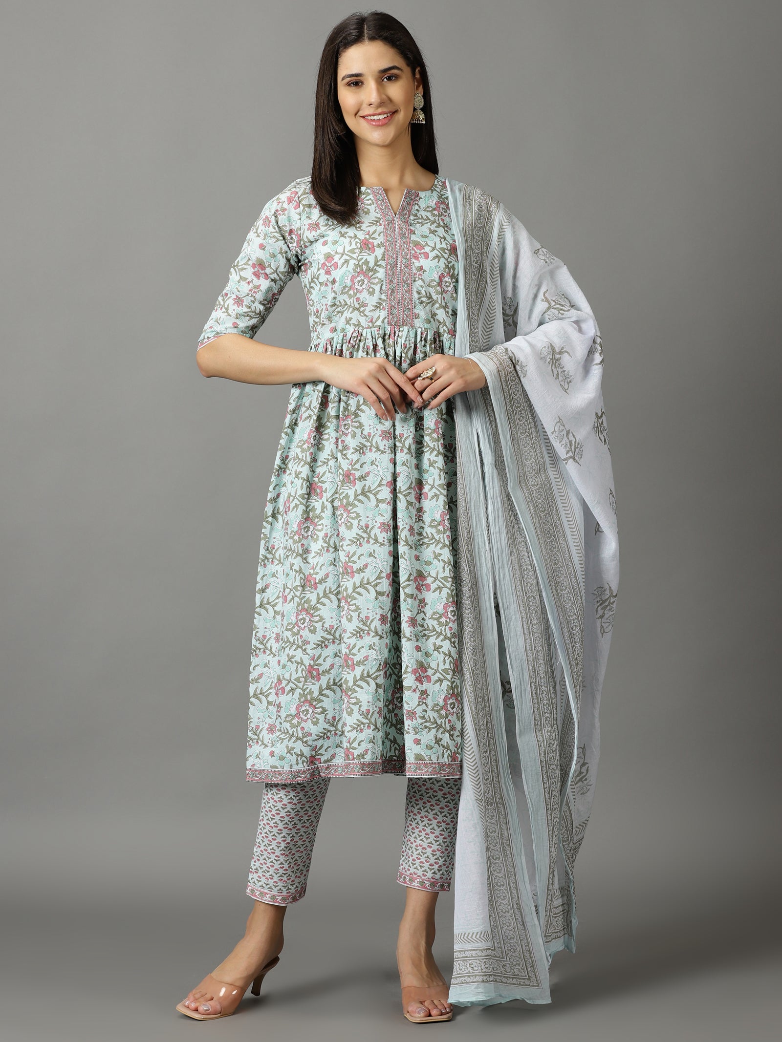 Our 3-piece blue printed cotton suit set features an Anarkali floral print kurta with a notched neckline and three-quarter sleeves. Complemented with straight pants with a fully elasticated waistband, and a dupatta. Adorned with captivating floral print and border look , this style is perfect for casual outings.