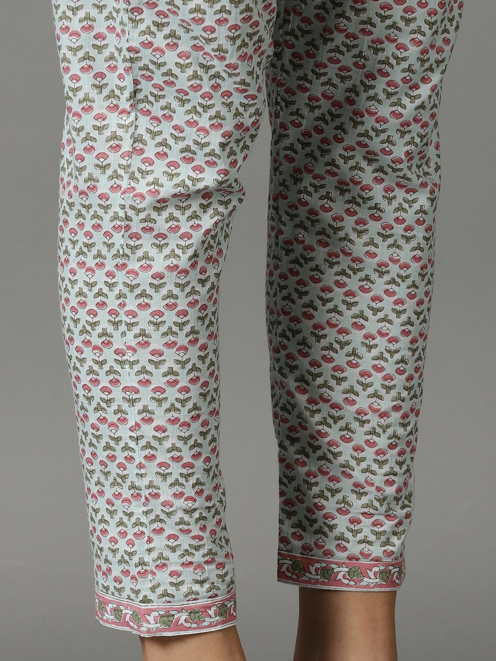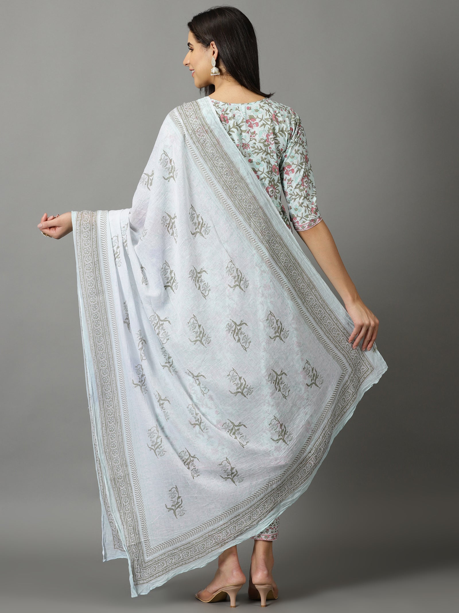 Blue Printed A-Line Cotton Kurta With Trouser & Dupatta