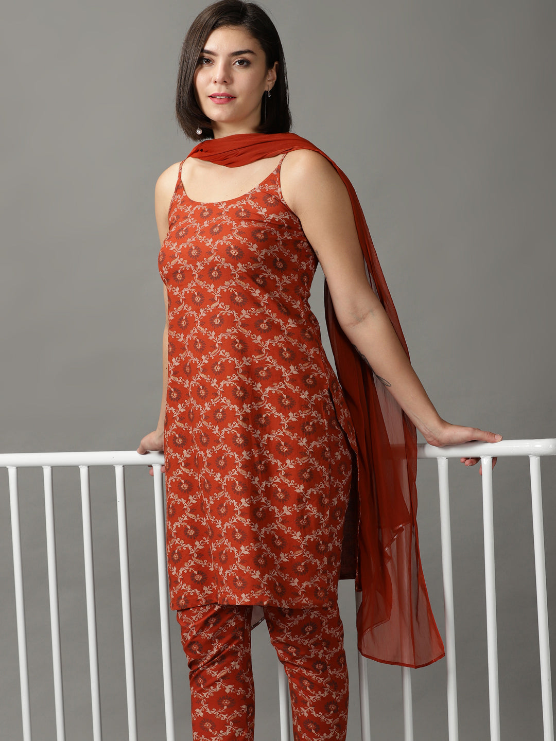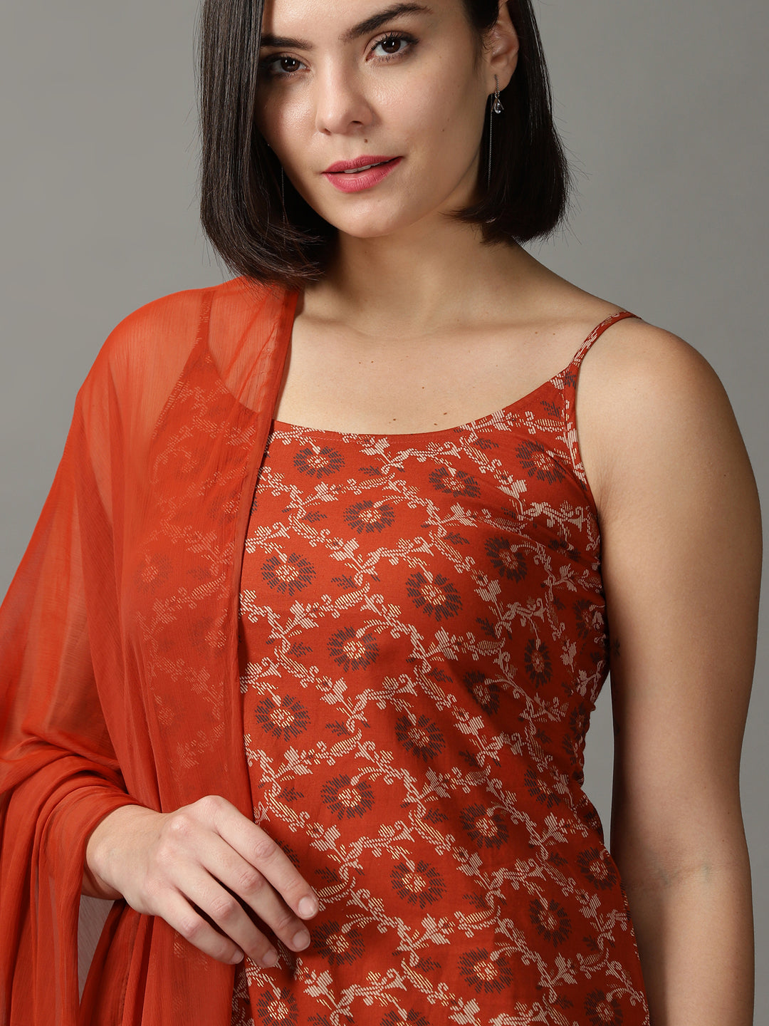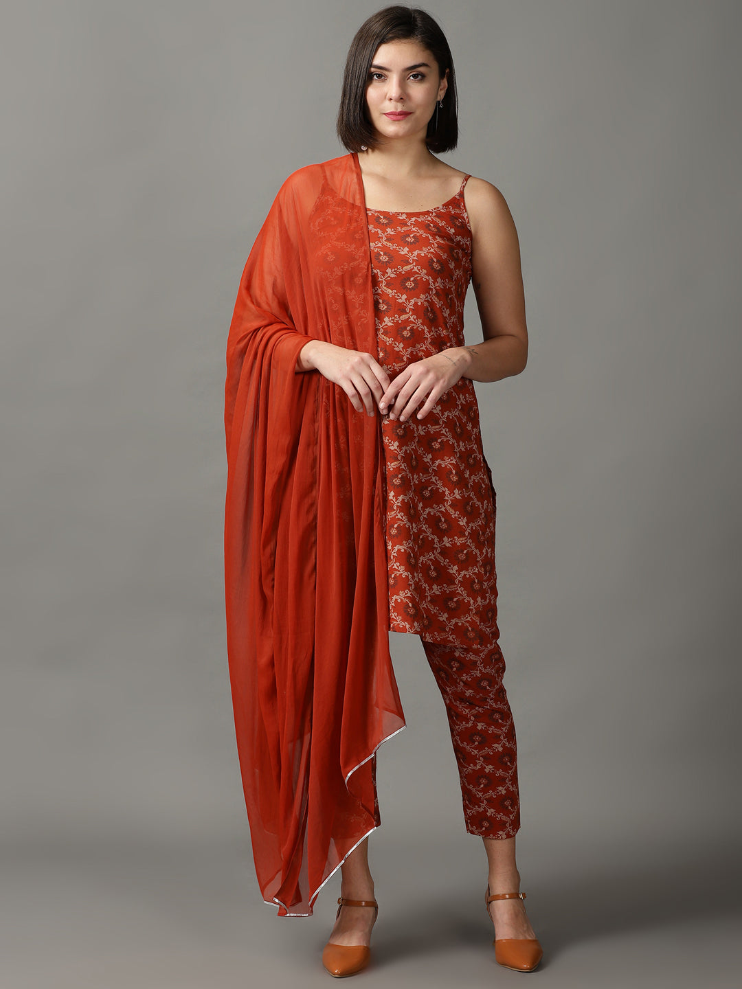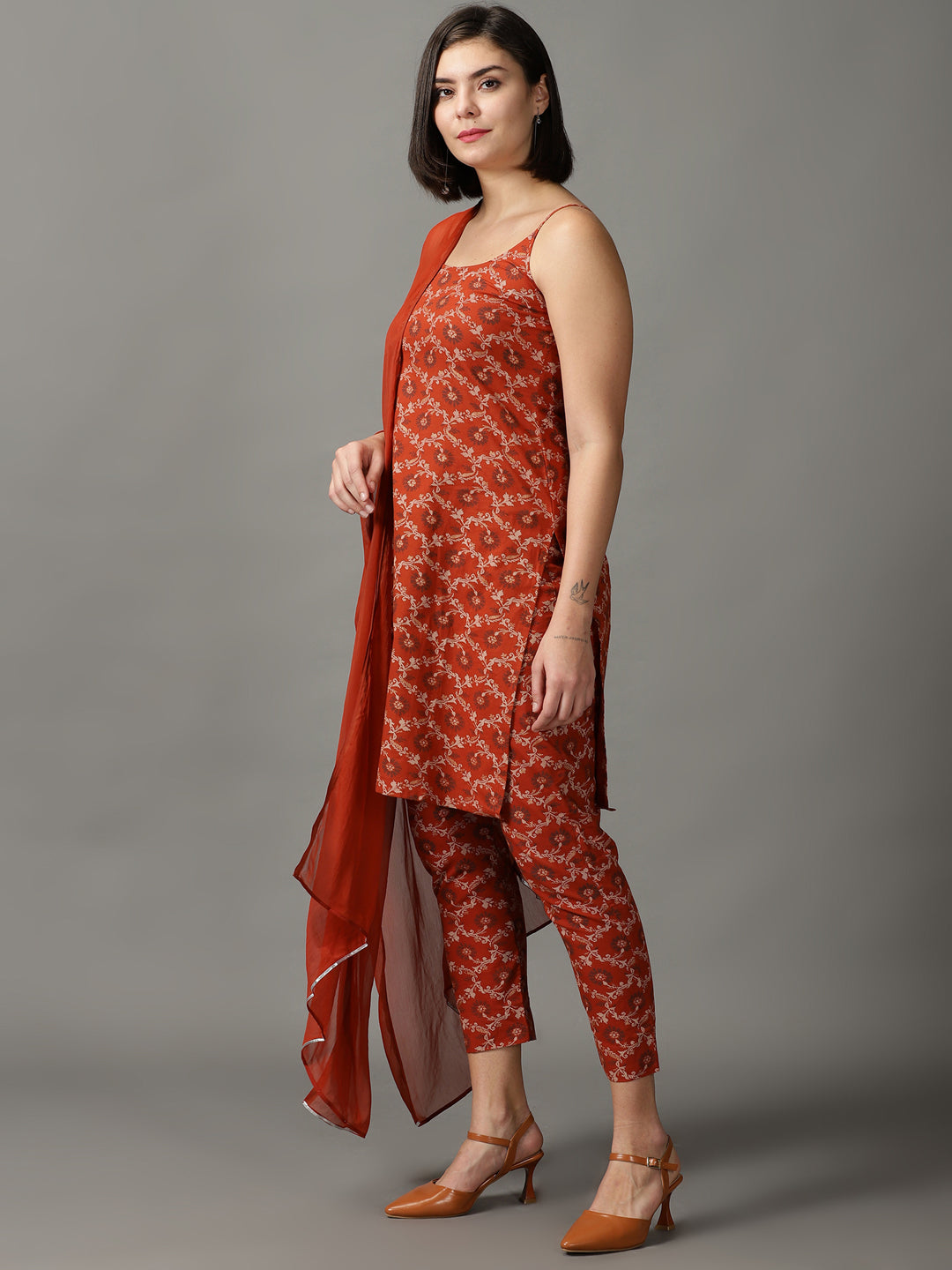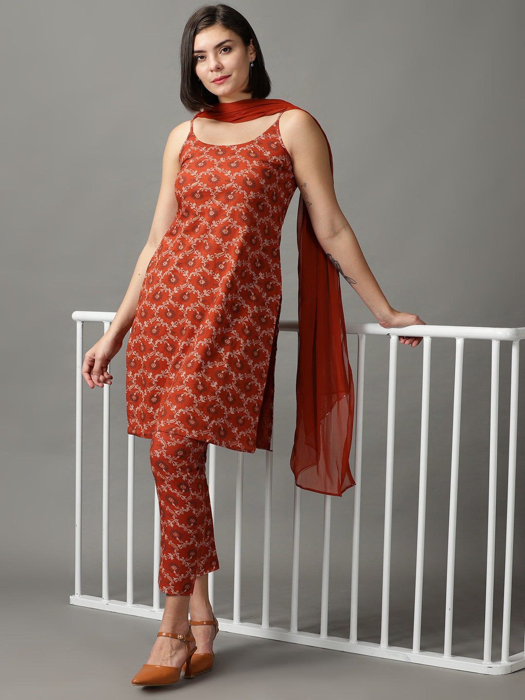 Our 3-piece brown printed cotton suit set features a floral print straight-fit kurta with a round neckline,sleevless style. Complemented with straight pant with a partially elasticated waistband with pocket , and a dupatta. this style is perfect for elevated everyday wear.