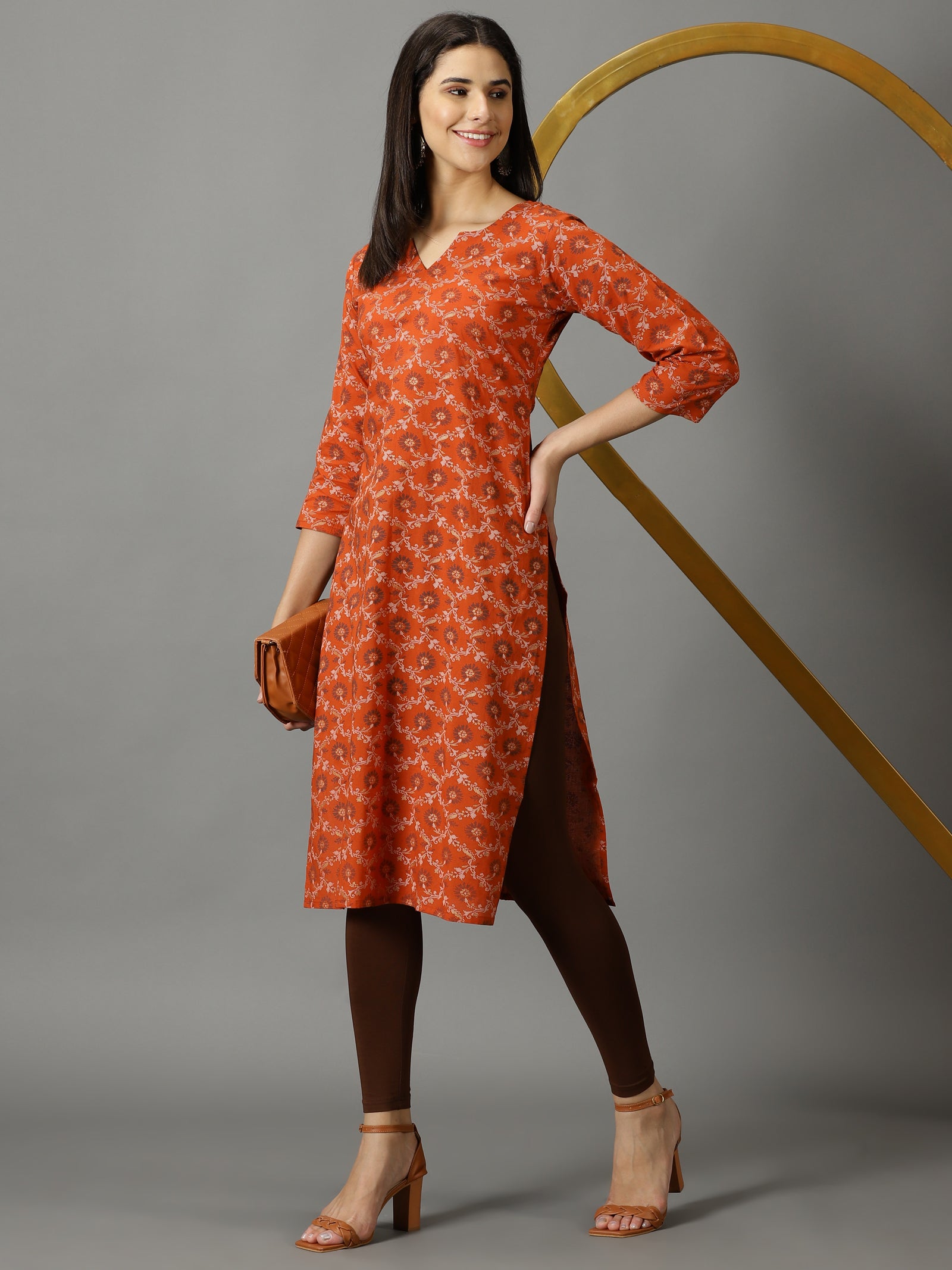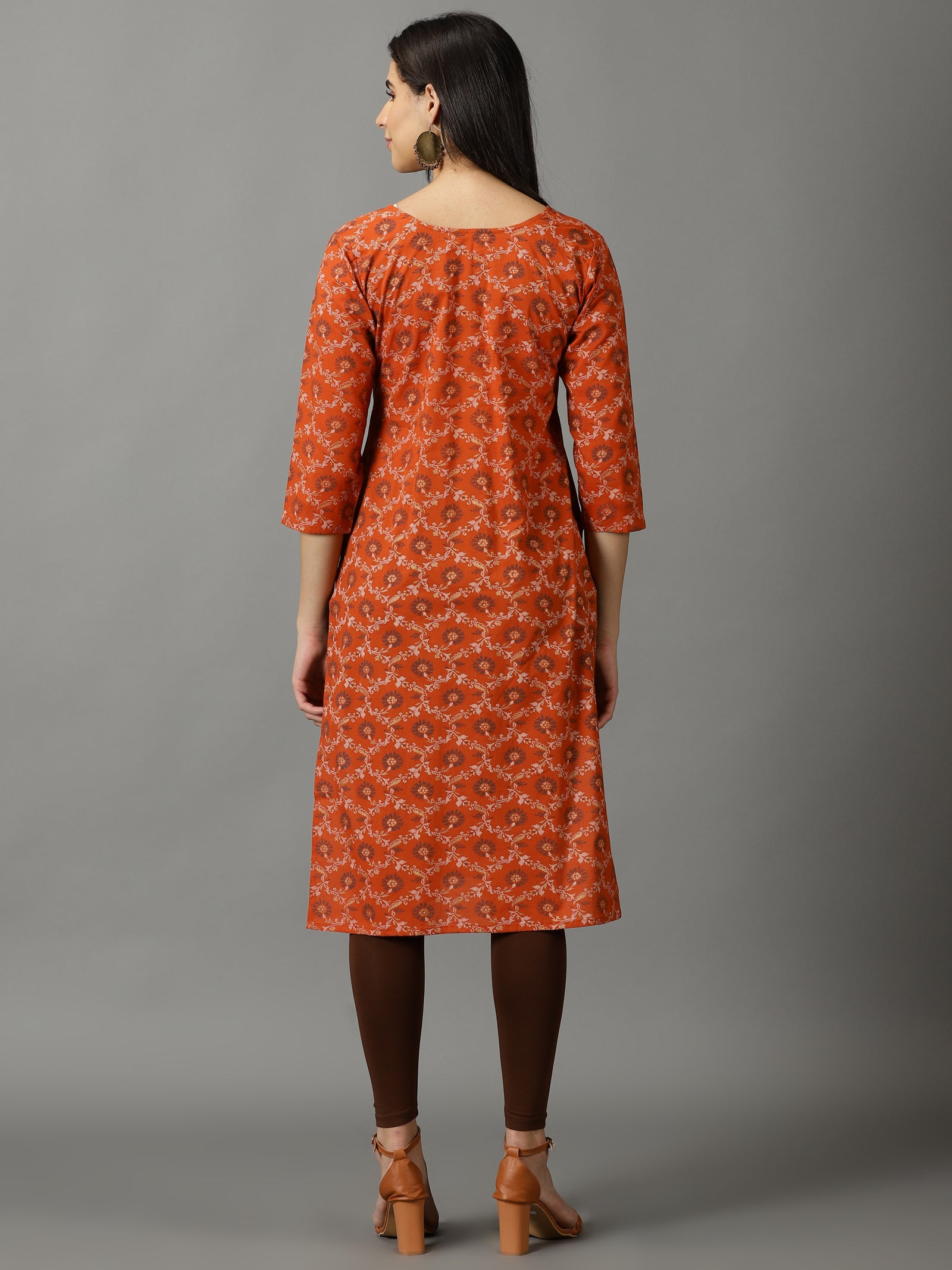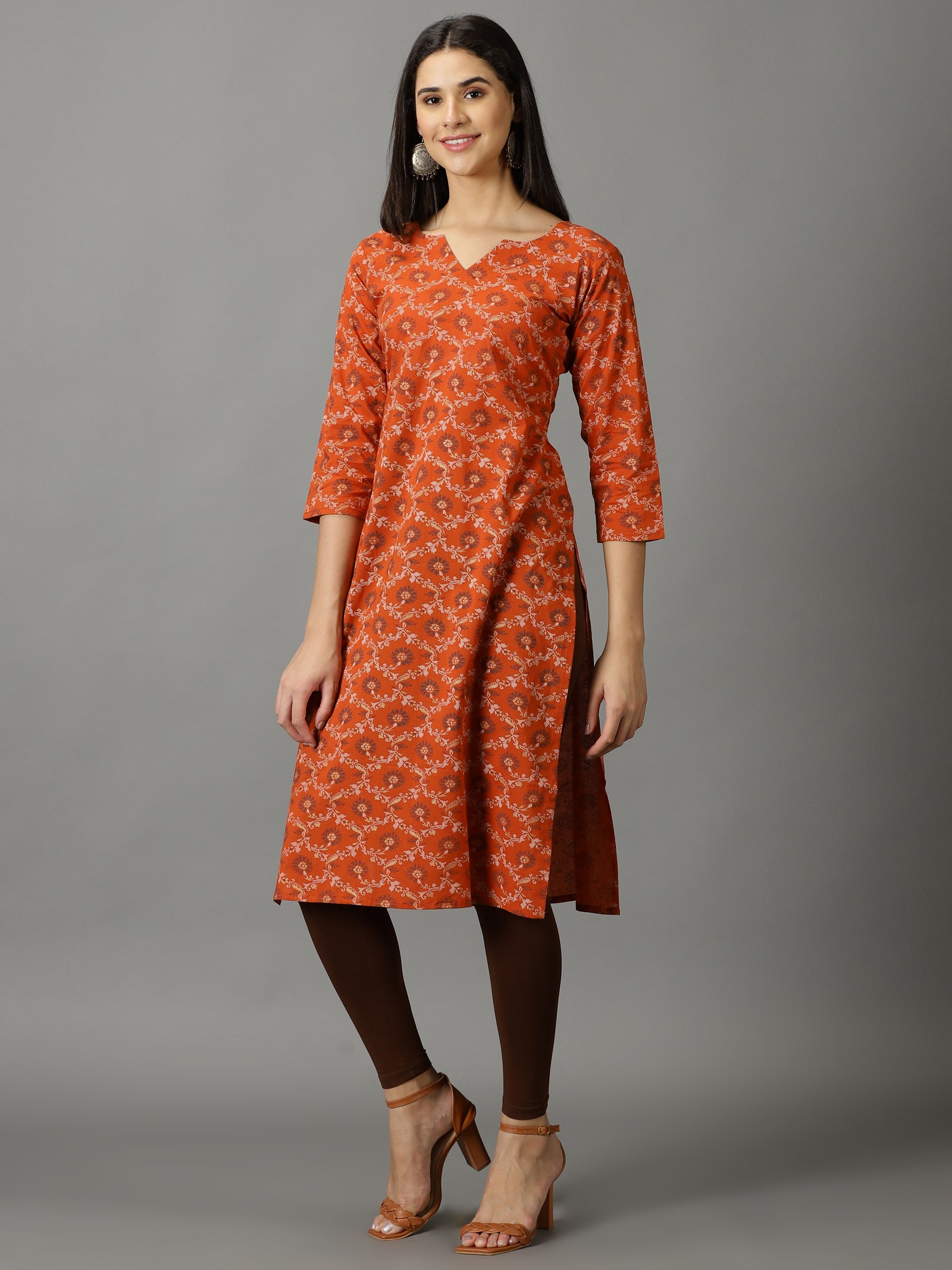 Our brown printed kurta, crafted in cotton fabric, features a round neckline, three-quarter sleeves, this style is perfect for casual daylook.