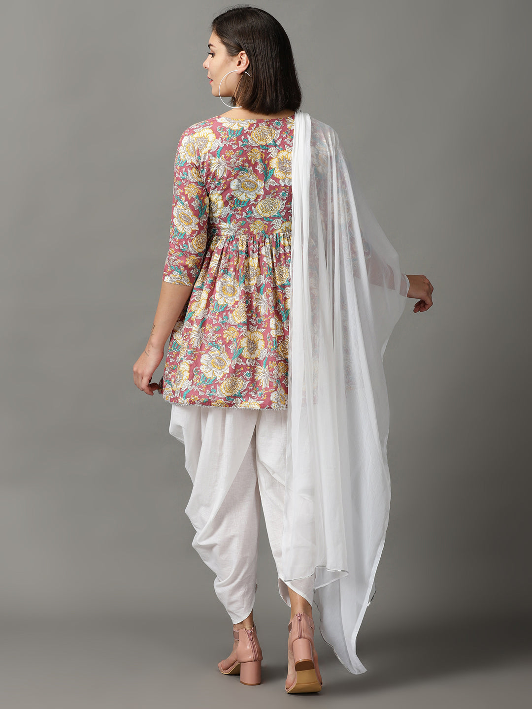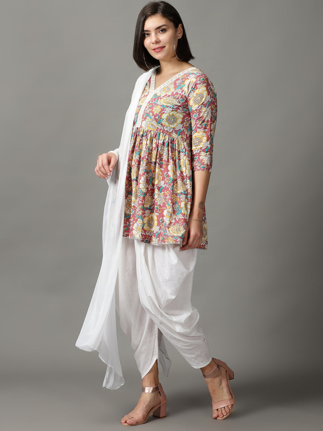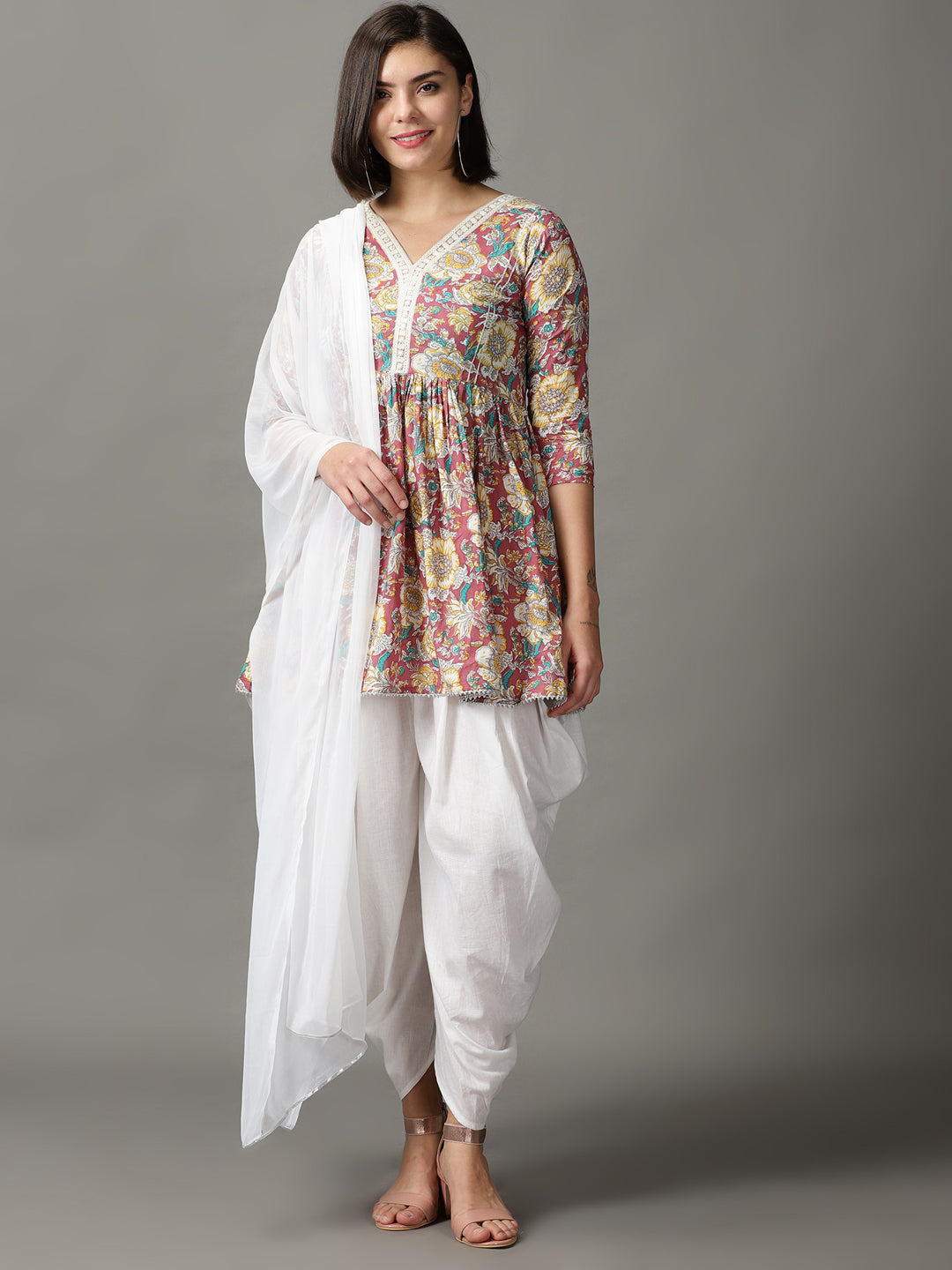Our 3-piece brown cotton dhoti set features an A-line embellished kurti with a round neckline and three-quarter sleeves. Complemented with dhoti with a partially elasticated waistband, and a chiffon dupatta. Adorned with lace work, sequins accents, this style is perfect for light festivities.