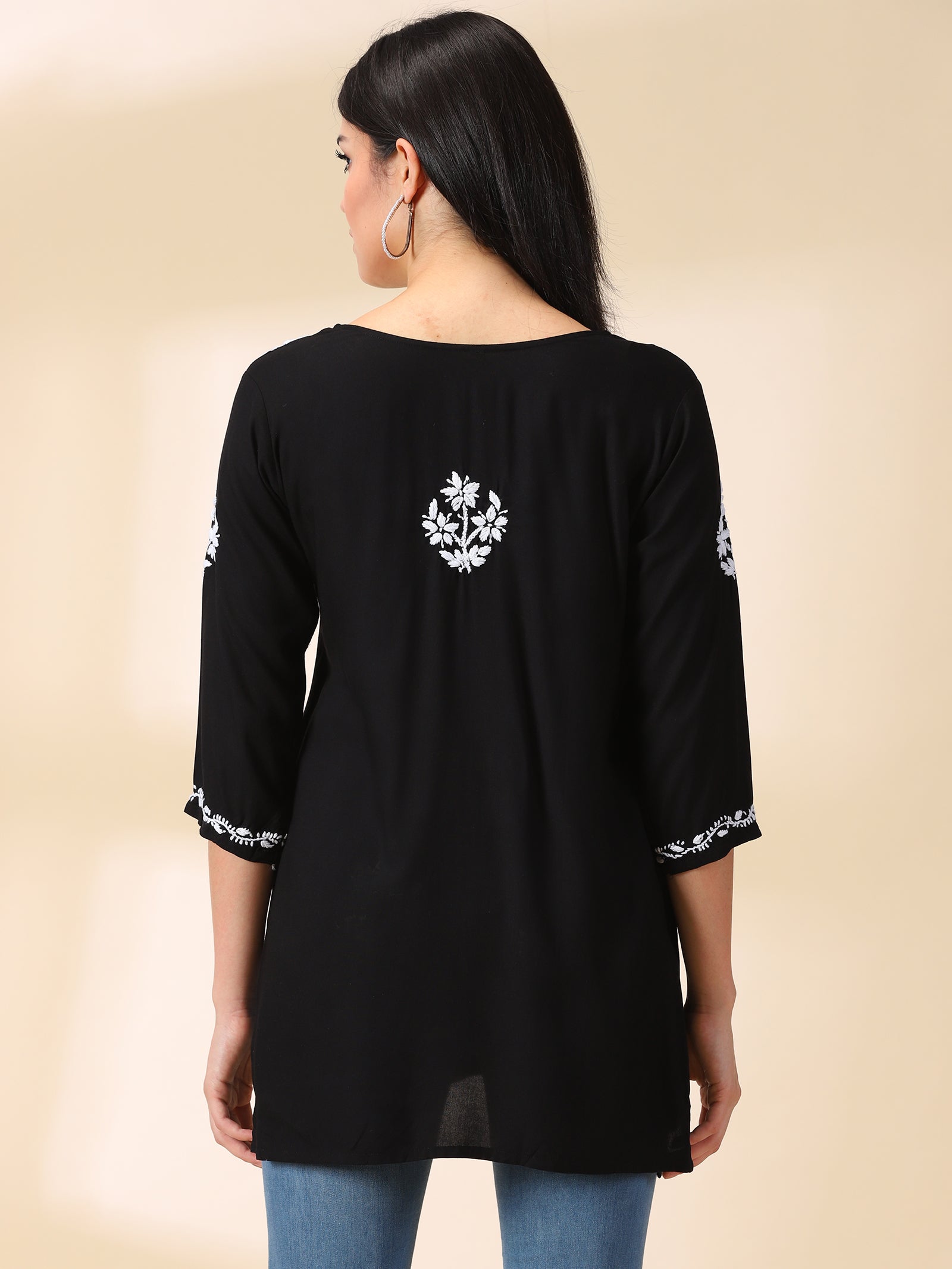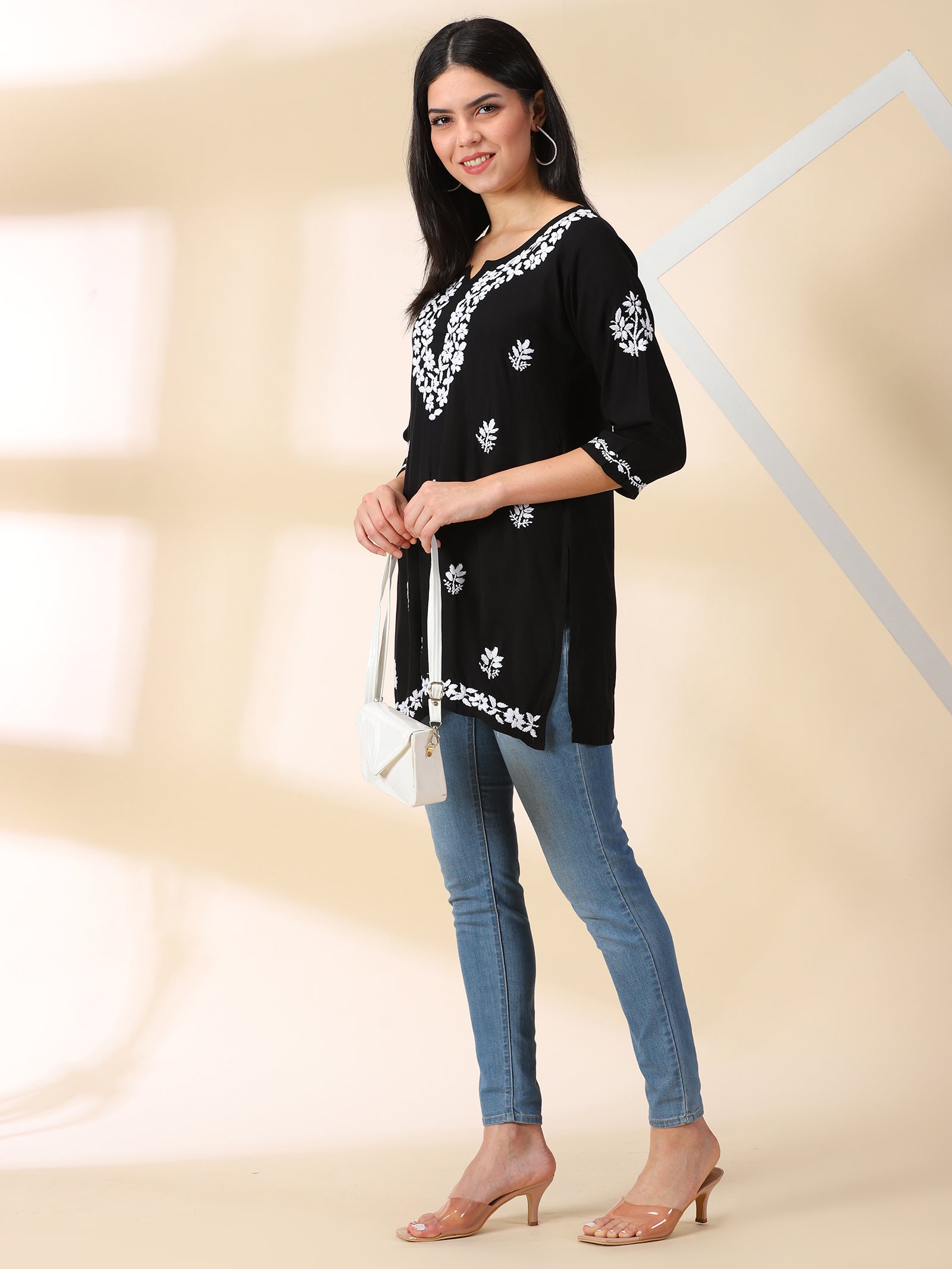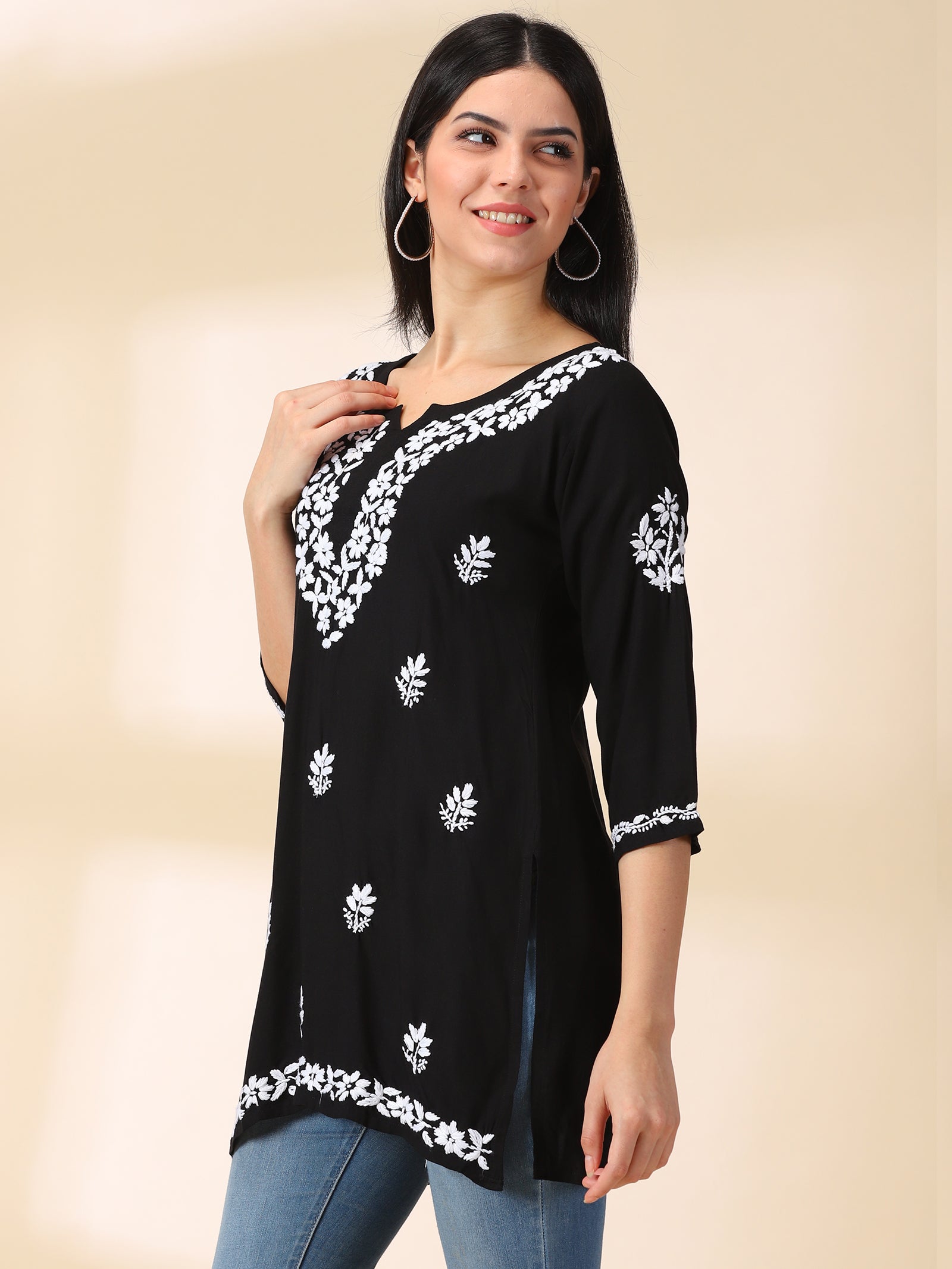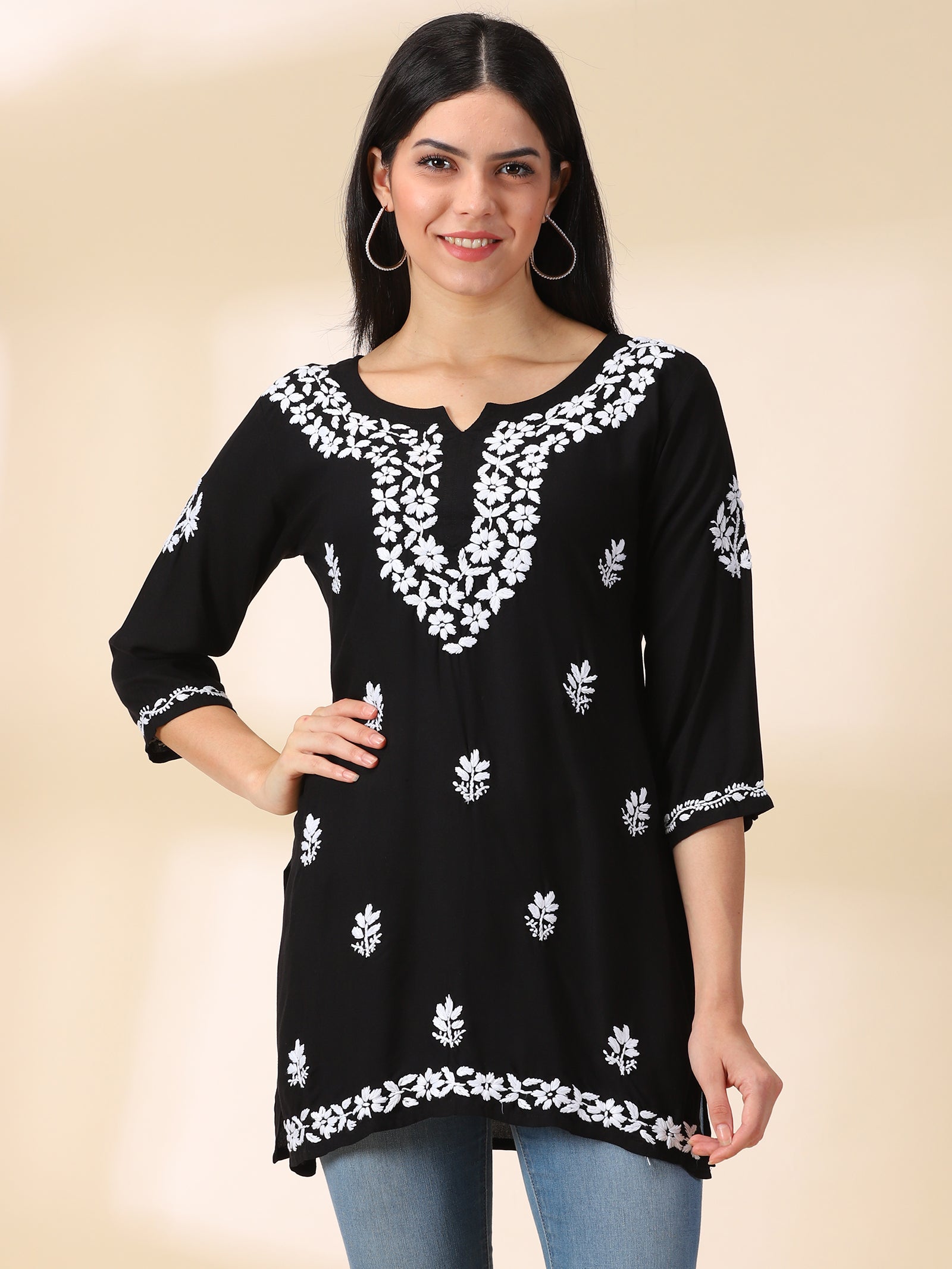 Chikankari black kurta,crafted in rayon fabric,features a round neckline,three-quarter sleeves,this style is perfect for festive look.