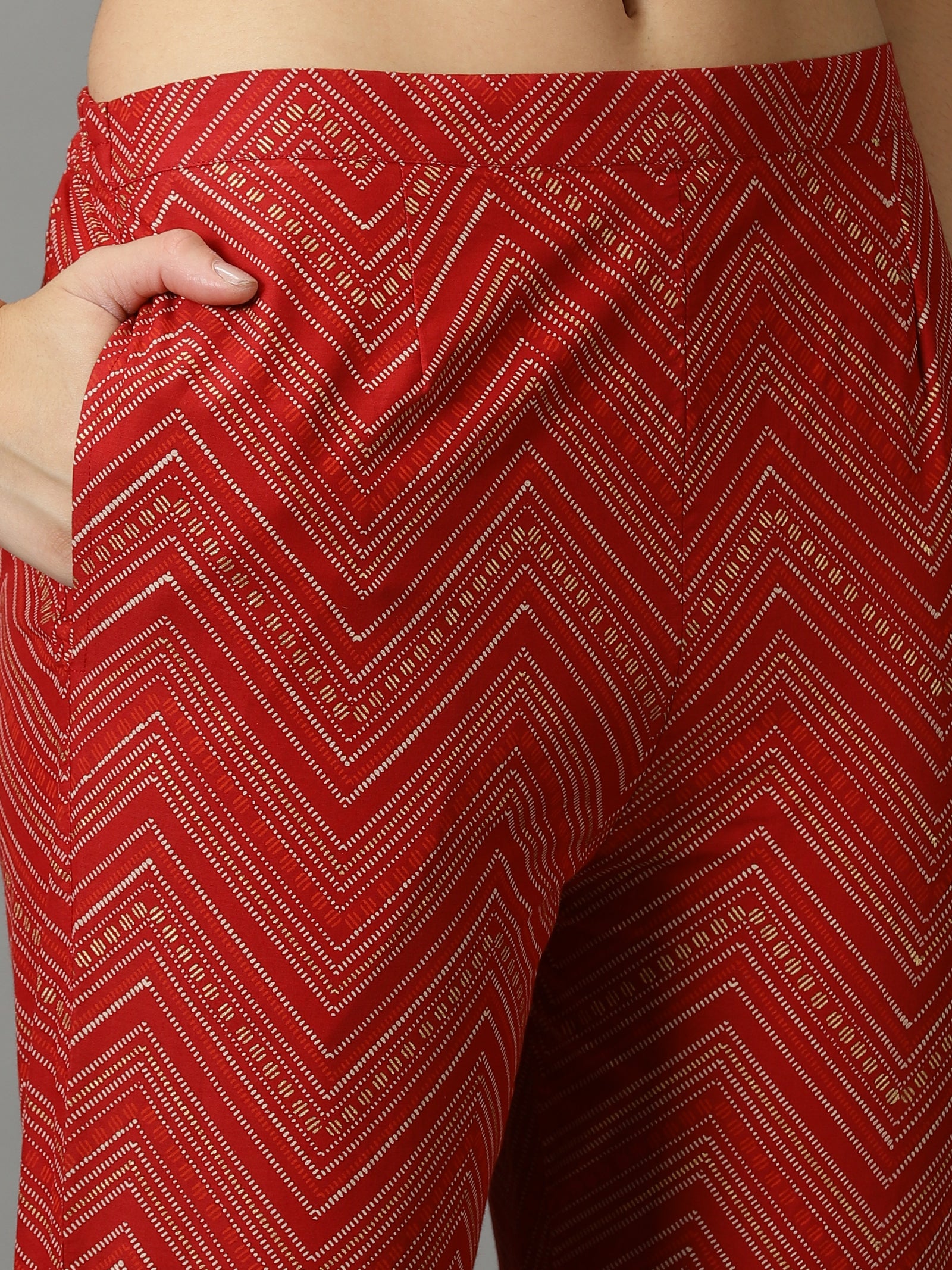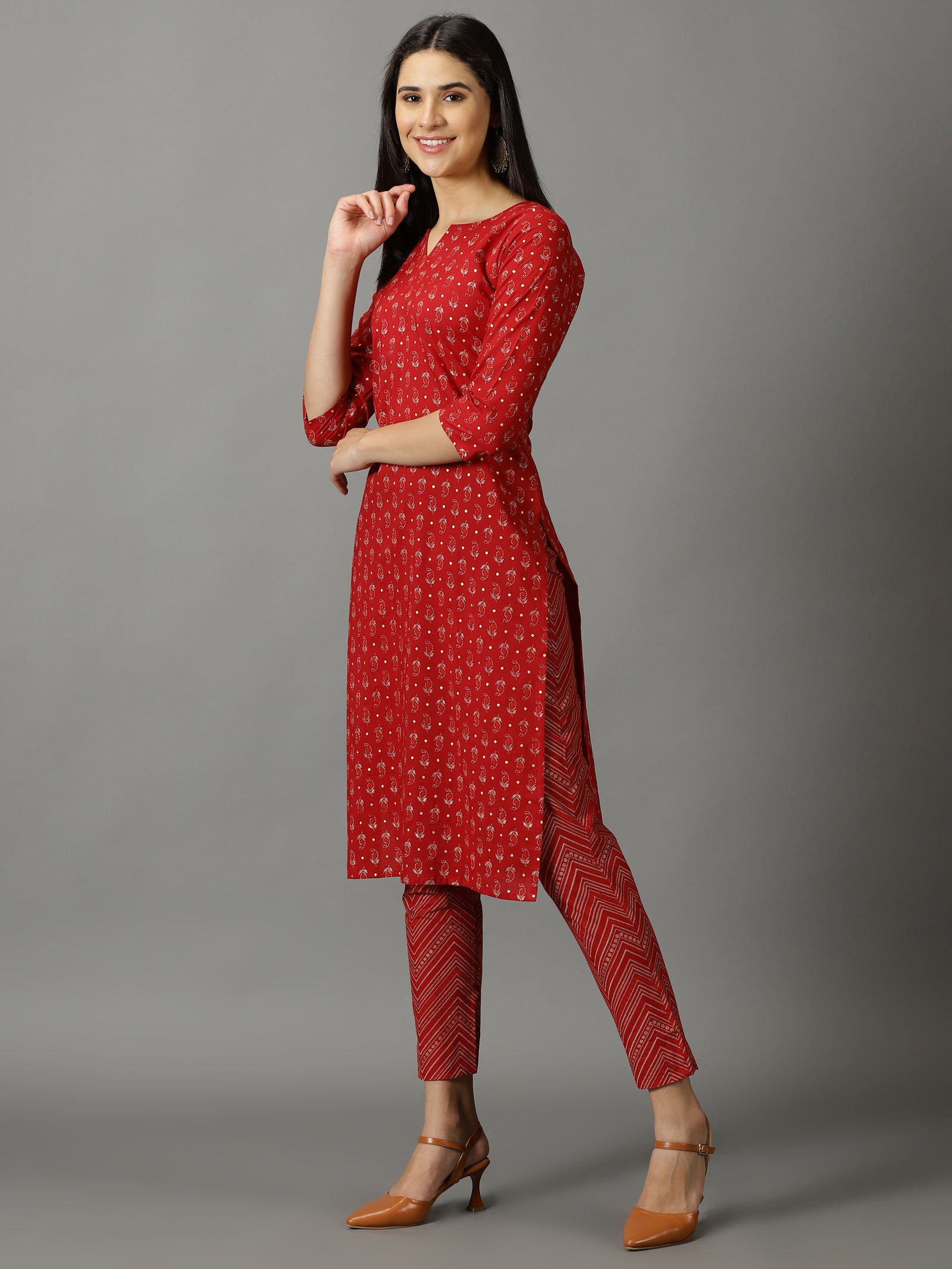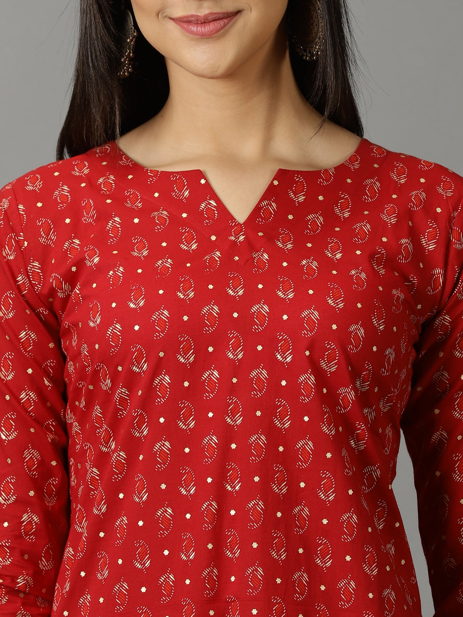 Our 3-piece maroon printed cotton suit set features a printed straight-fit kurta with a notched neckline and three-quarter sleeves. Complemented with printed trousers with a partially elasticated waistband and roomy pockets, and a dupatta. this style is perfect for elevated everyday wear.