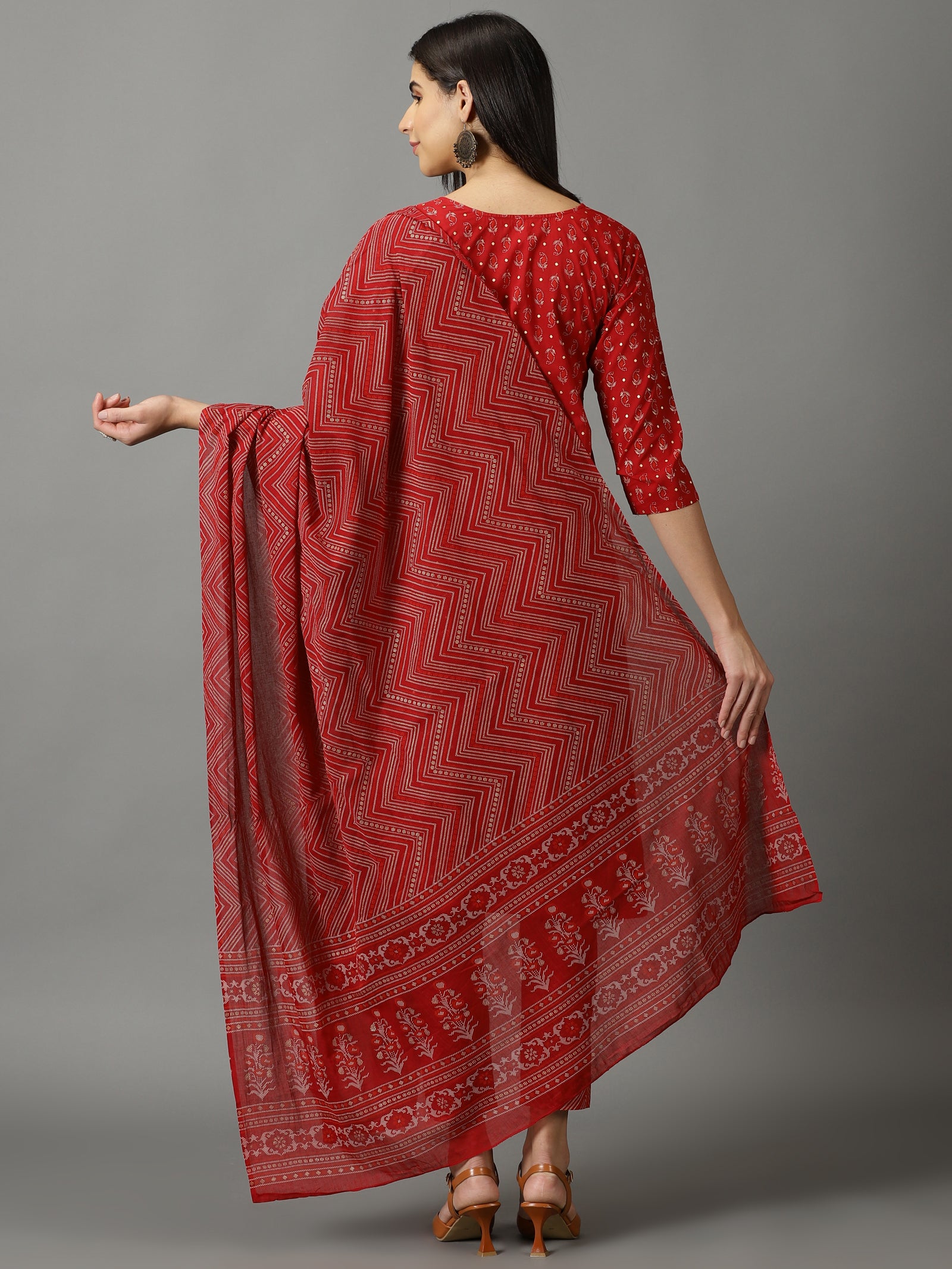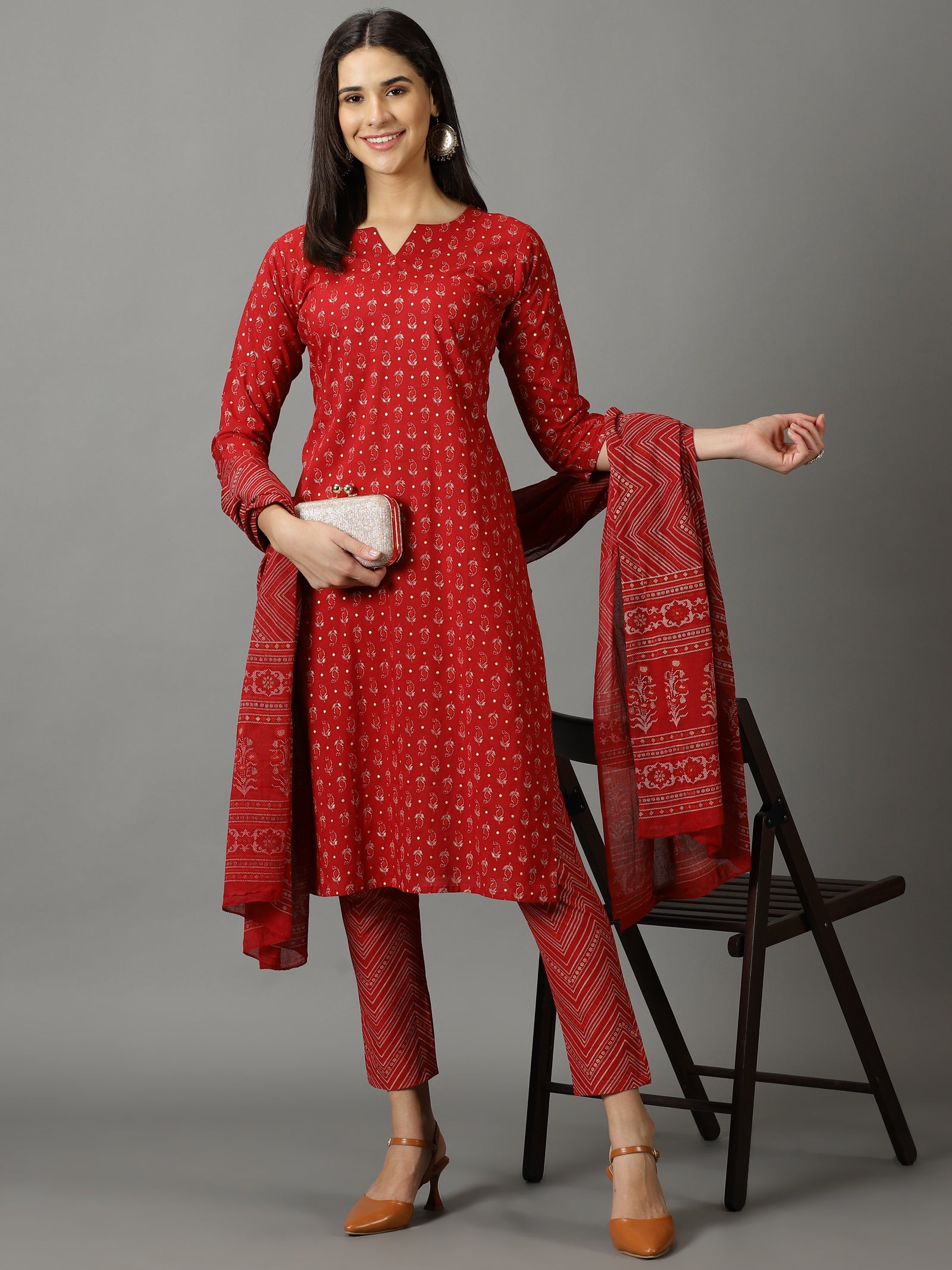 Maroon Cotton Straight Kurta With Trouser & Dupatta