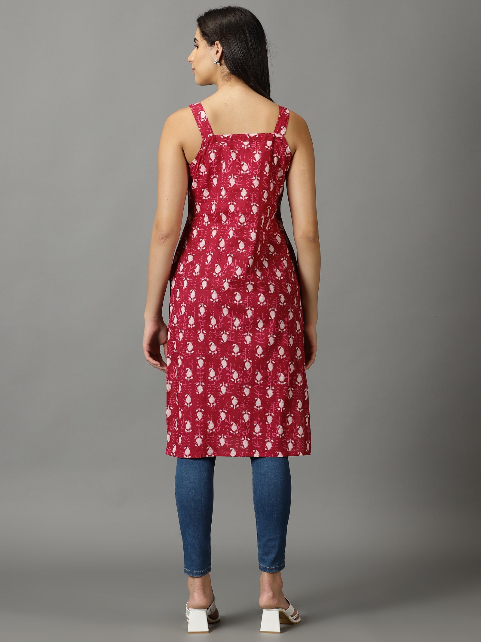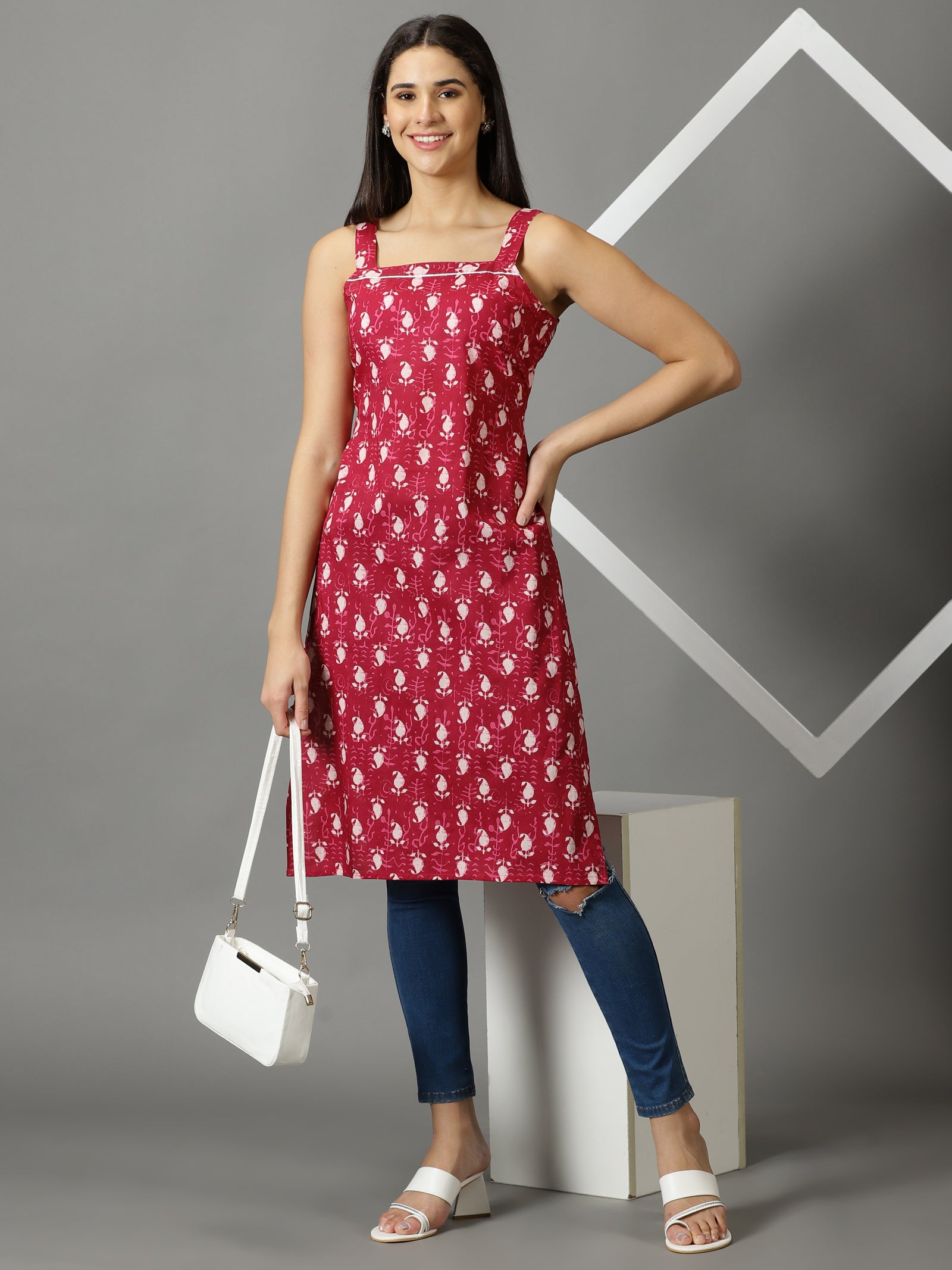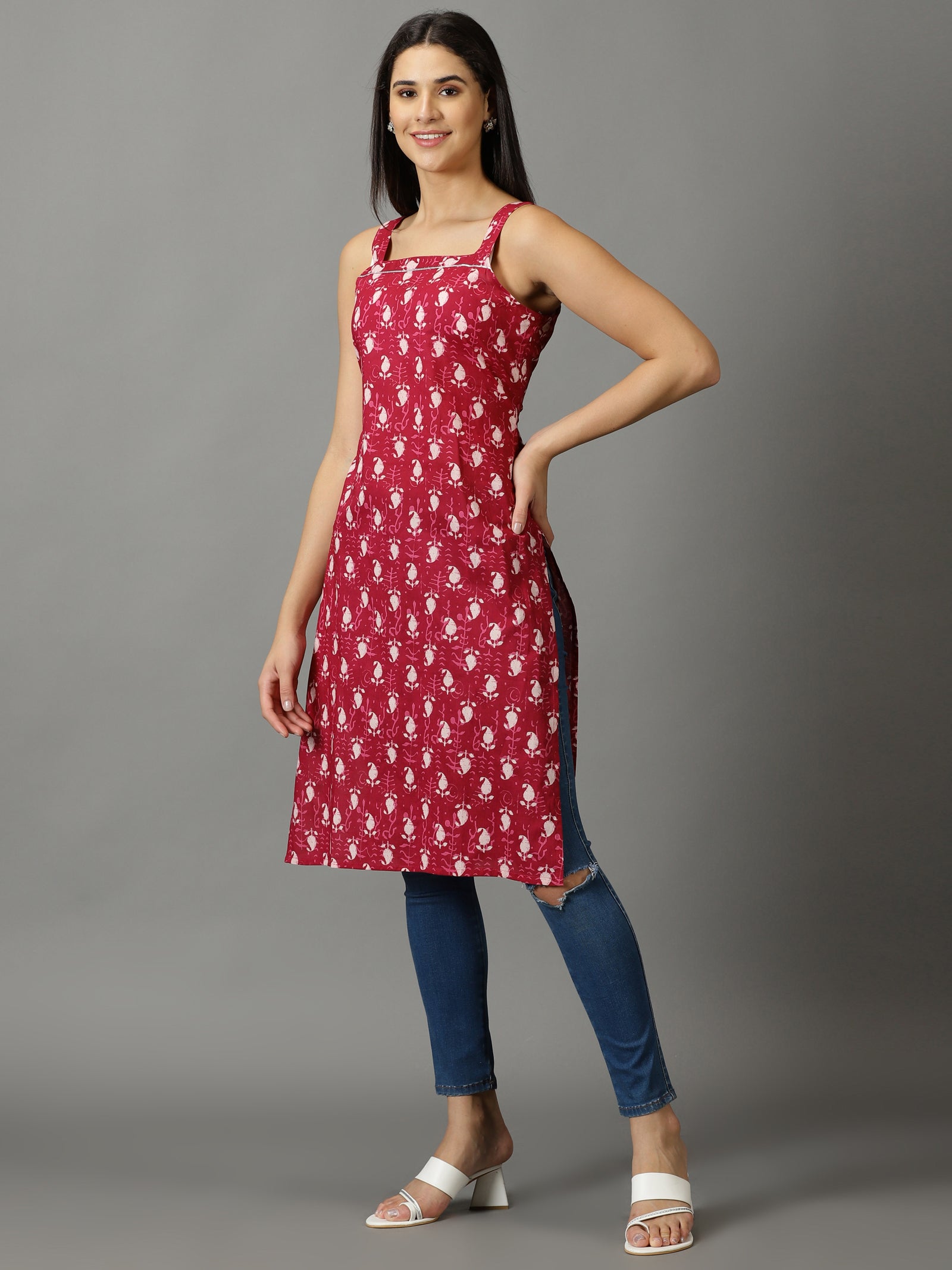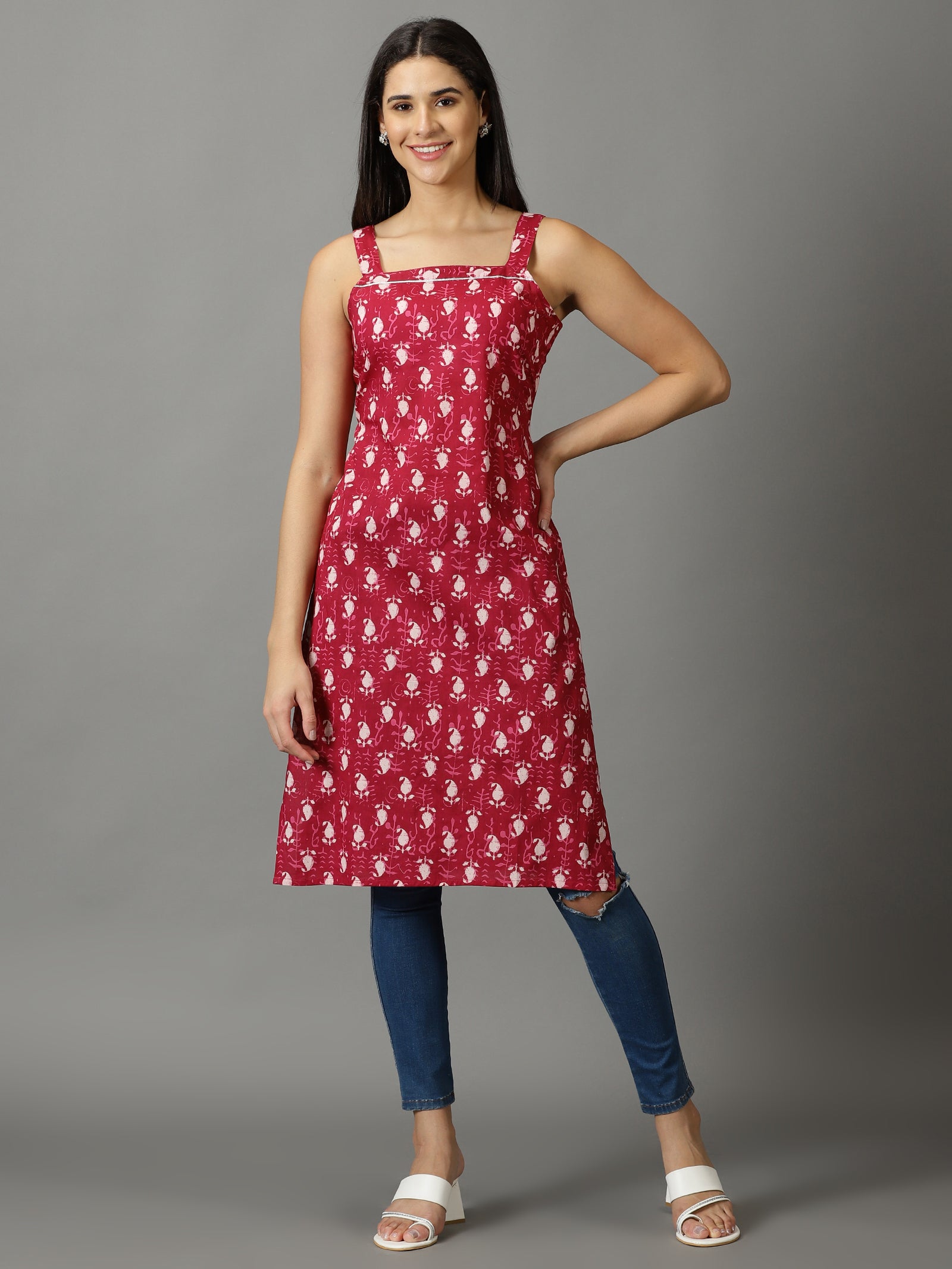 Our maroon Kurta, Crafted in Cotton Fabric, Features a Round Neckline and Sleevless Style. Adorned With Gota Patti Detailing and Captivating Floral Prints, this Style is Perfect For Summer.