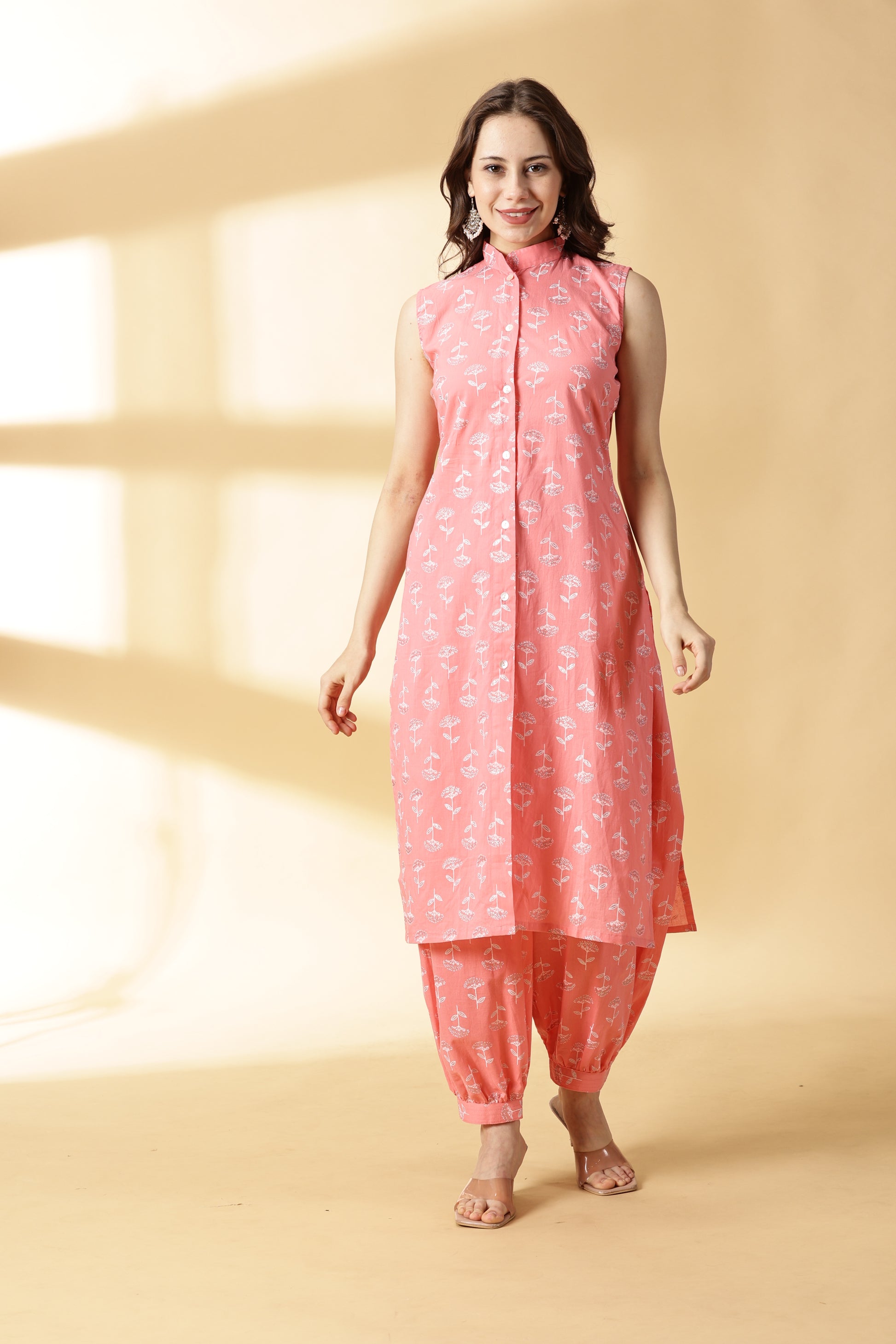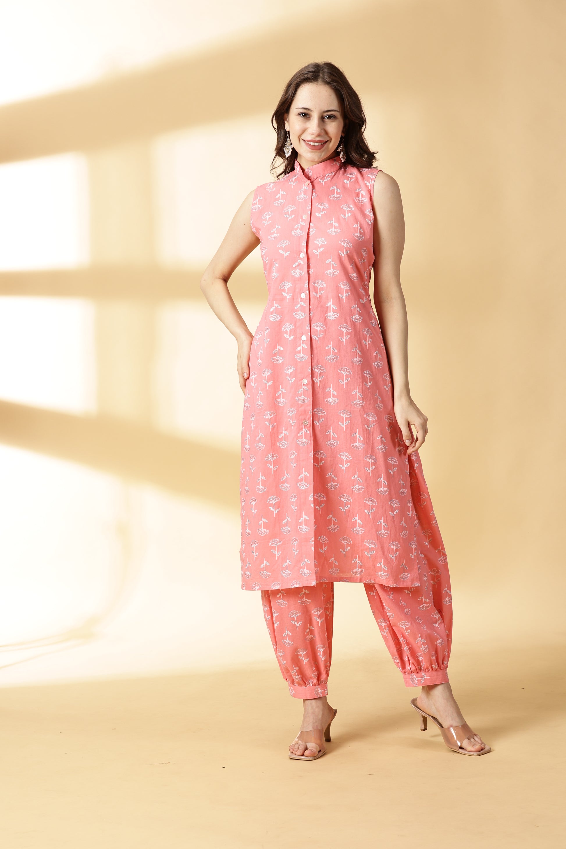 Our 2-piece pink printed kurta set features straight-fit kurta with a stylised neckline and sleeveless. Complemented with cuff pant with a partially elasticated waistband. Adorned with fit to bottom and sequins accents, this style is perfect for light festivities.