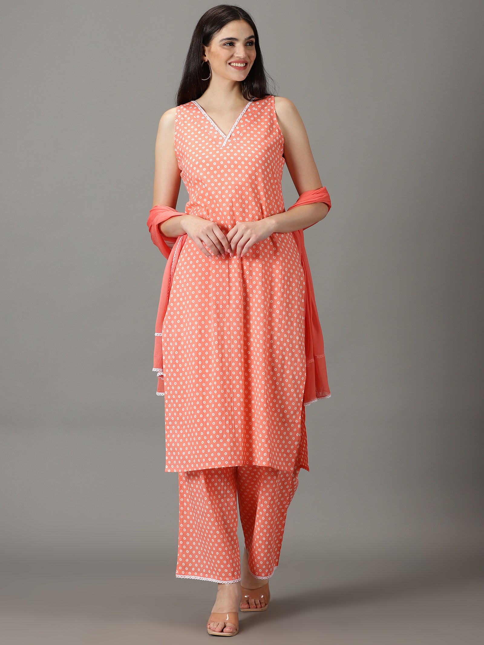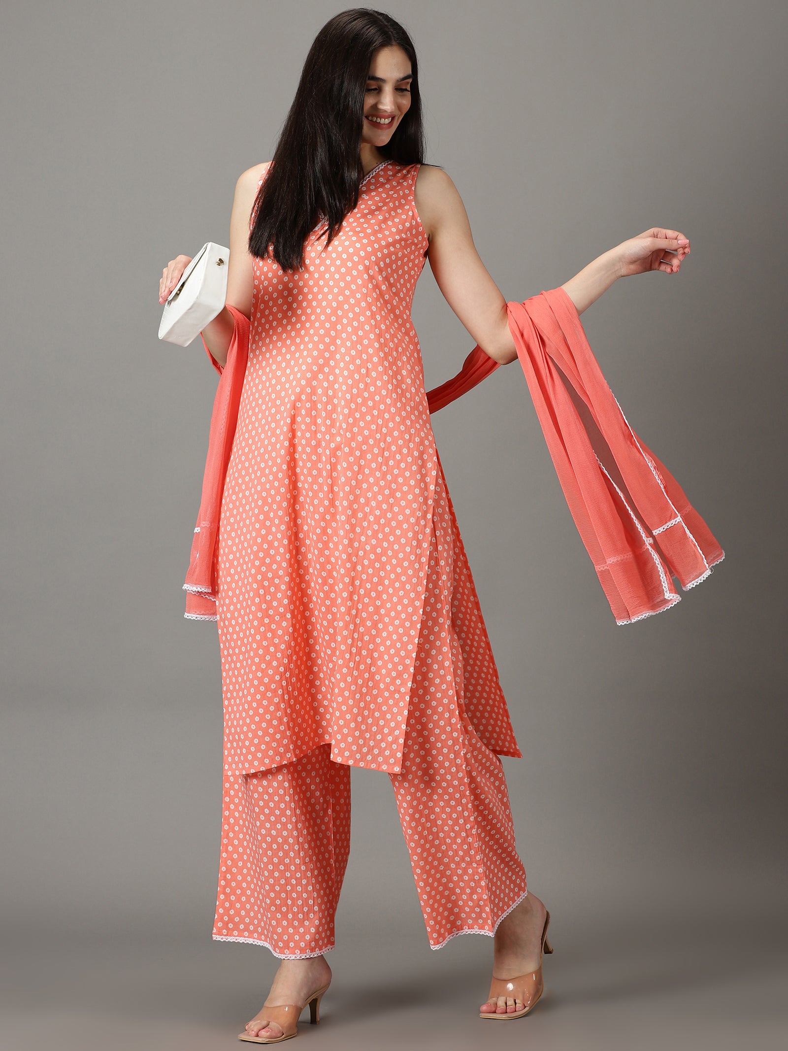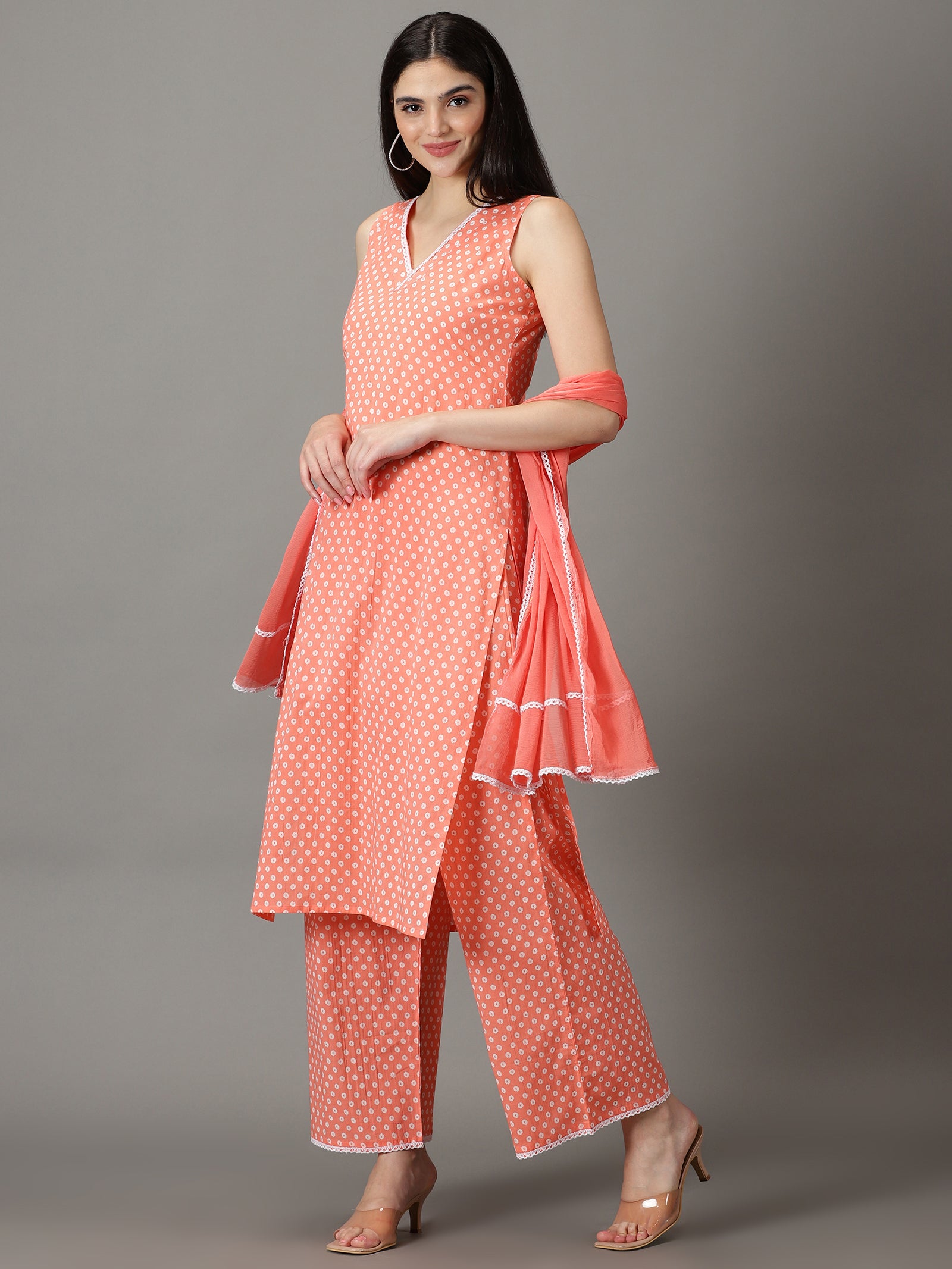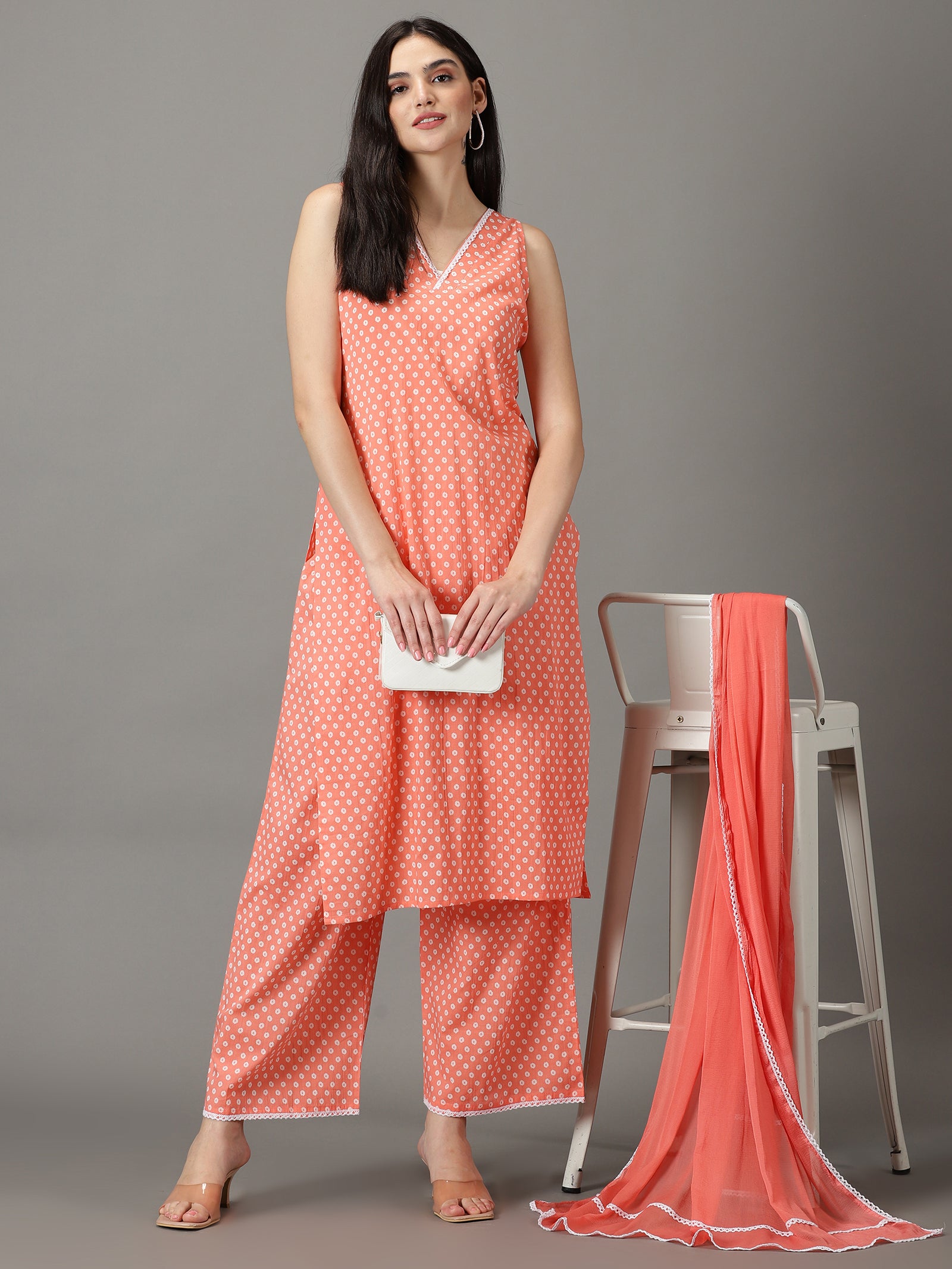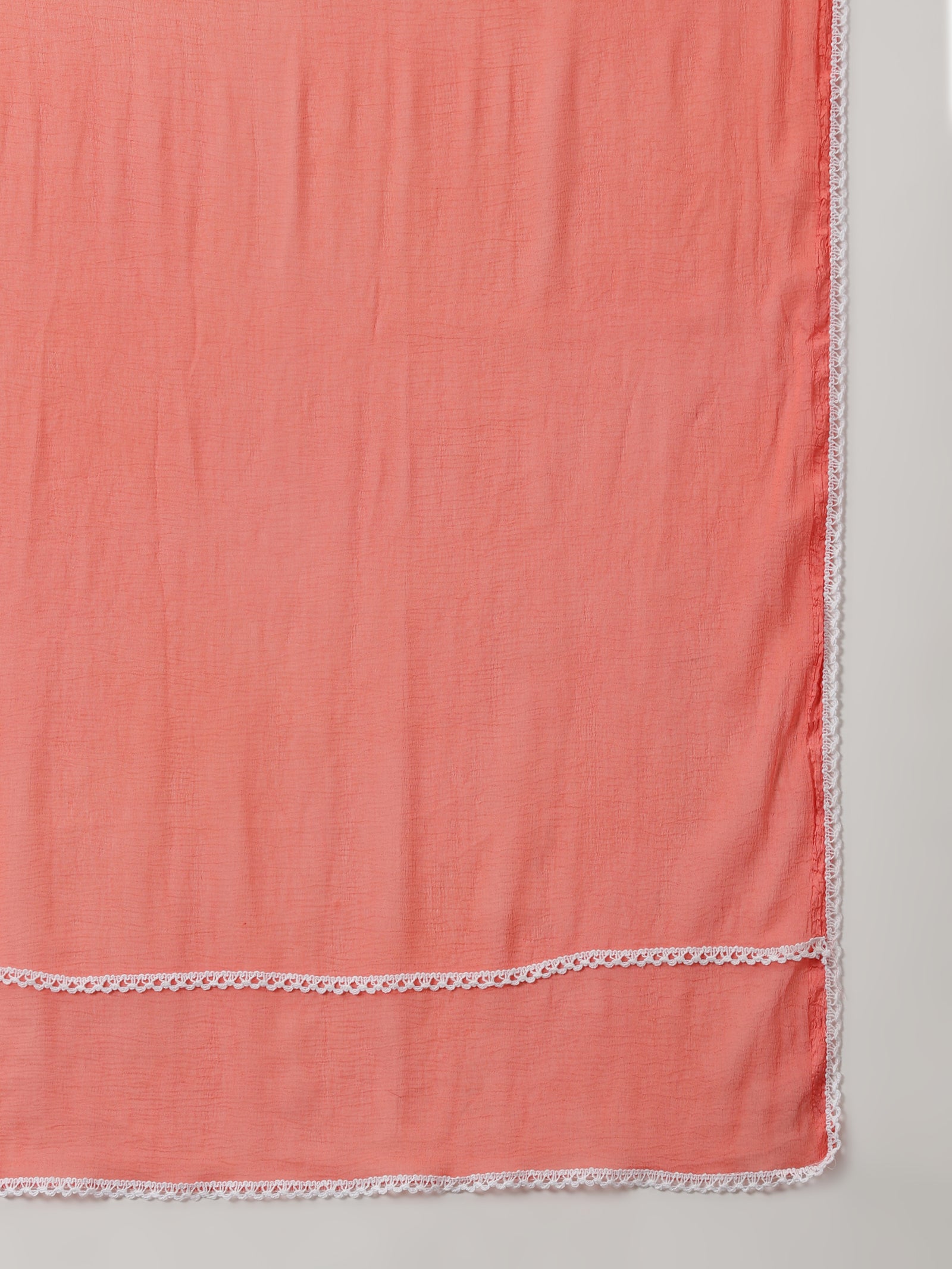 Peach Straight Cotton Kurta With Palazzos & Dupatta