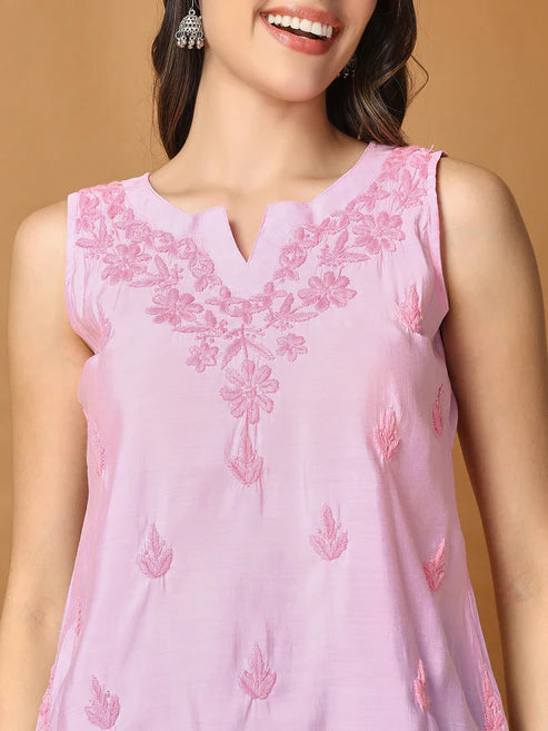 This elegant pink sleeveless top is made from soft Chanderi fabric and decorated with beautiful chikankari embroidery. It has a stylish notch neckline and delicate floral patterns, perfect for casual outings or festive days.