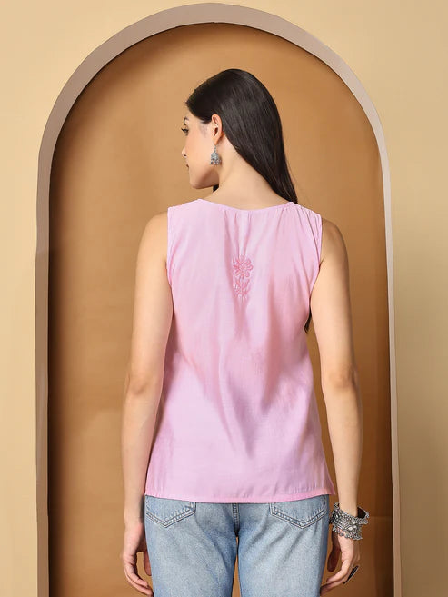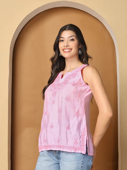 Pink Chanderi Sleeveless Top with Chikankari Embroidery