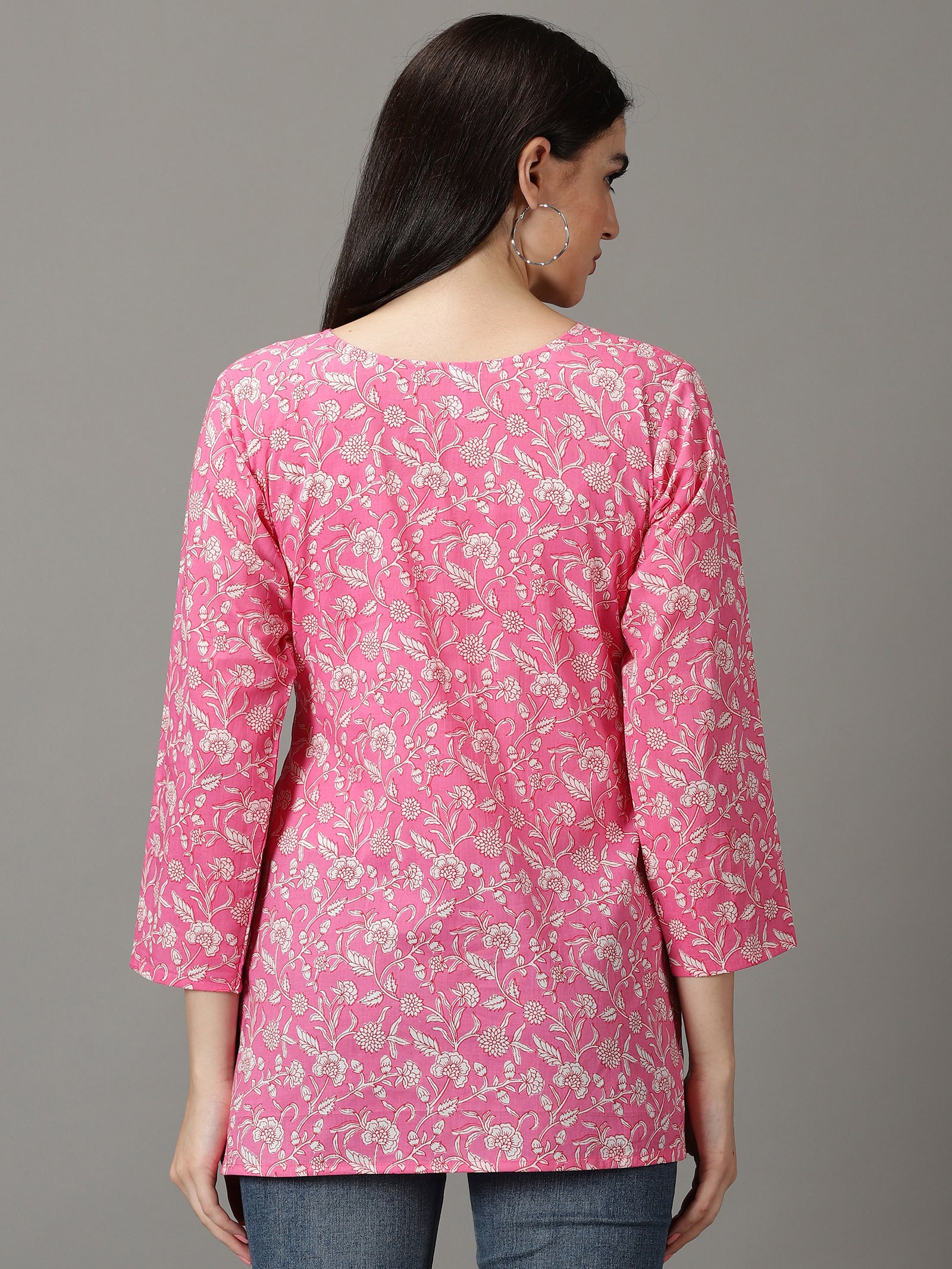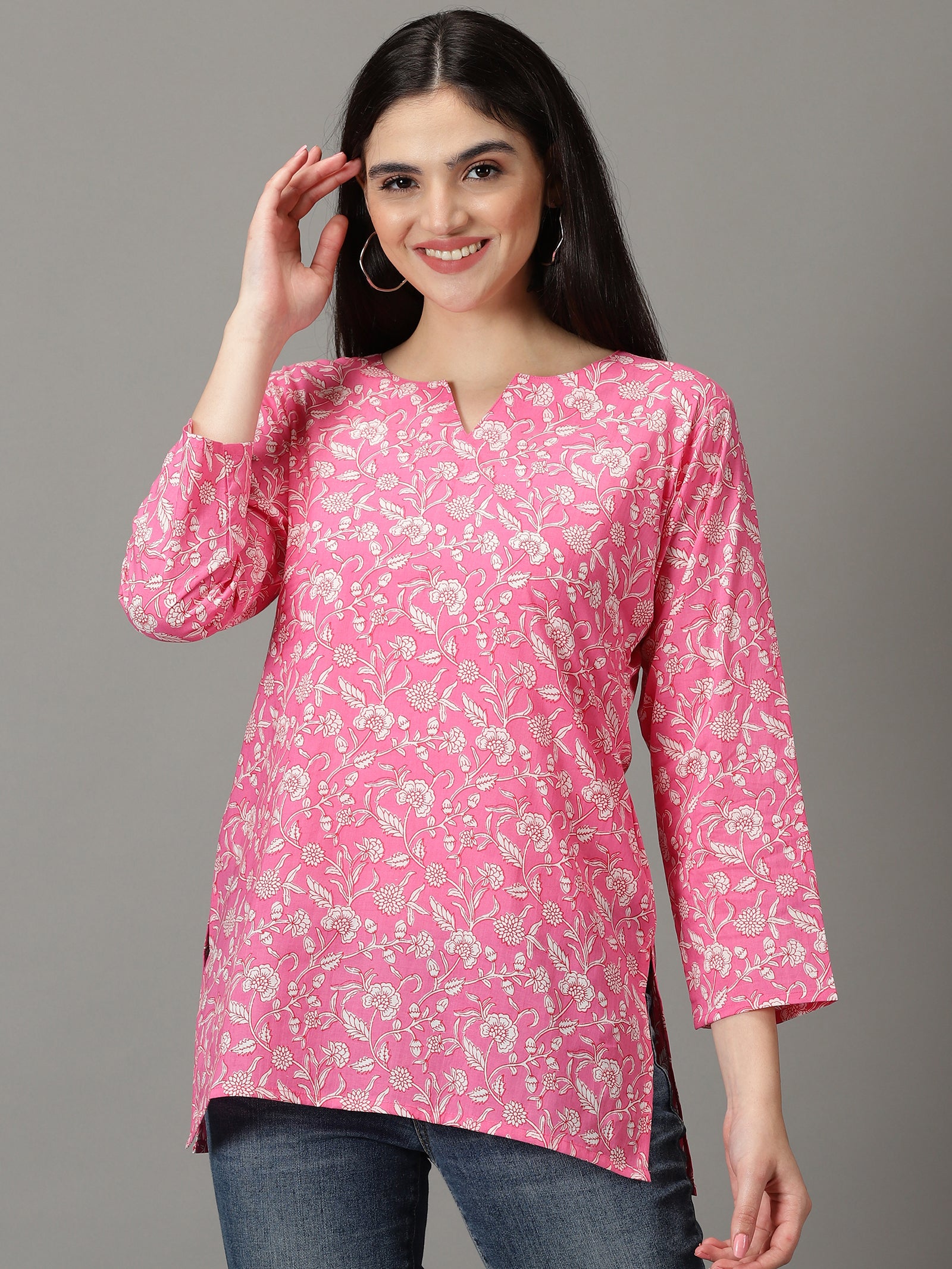 Our pink floral print kurti, crafted in cotton fabric, features a round neckline and three-quarter sleeves. This style is perfect for casual outings.