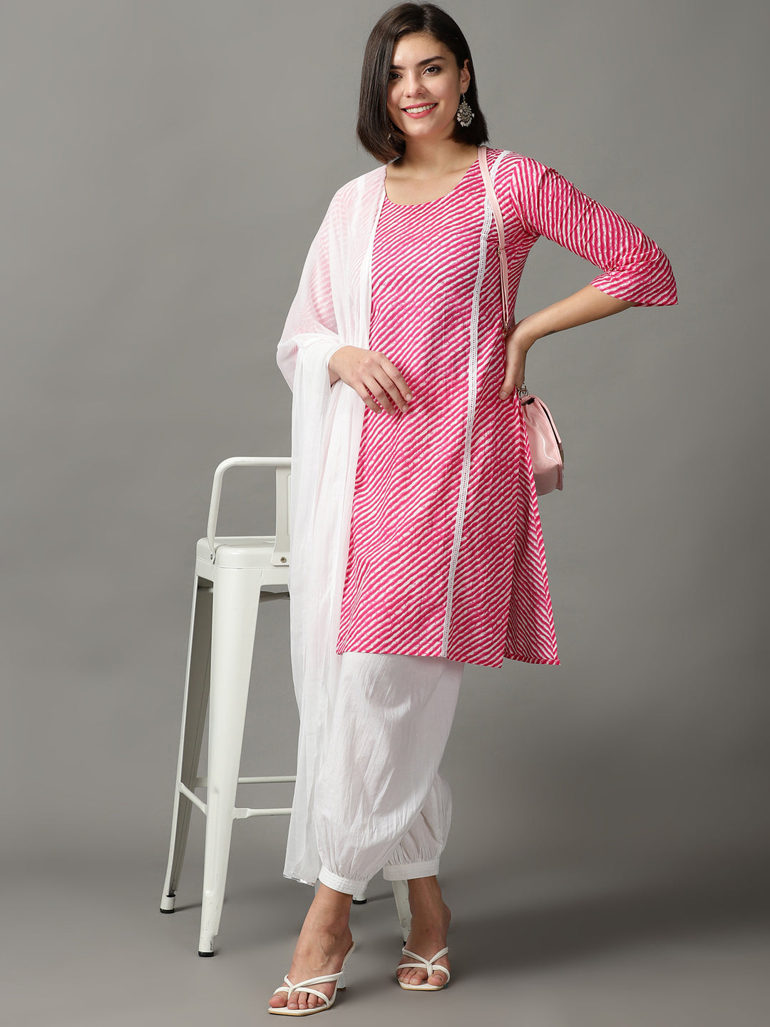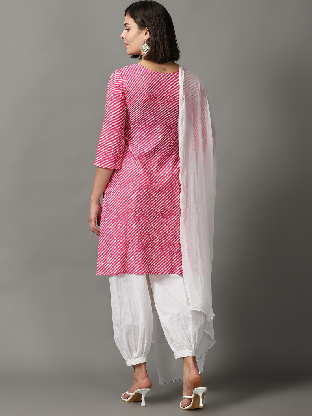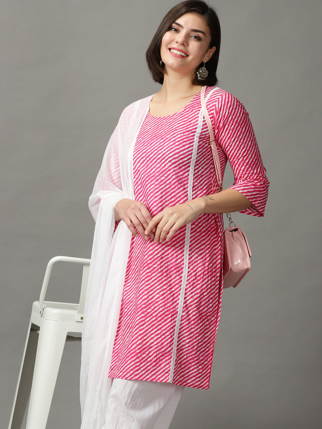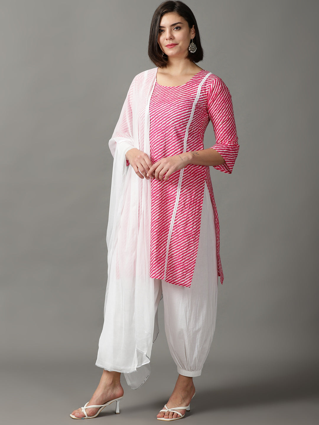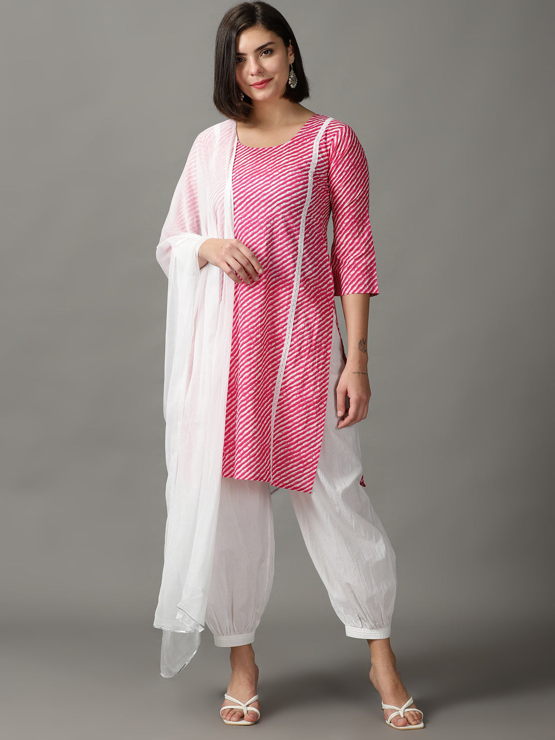 Our 3-piece pink printed cotton suit set features a lahariya print straight-fit kurta with a round neckline, three-quarter sleeves. Complemented with cuff pant with a partially elasticated waistband , and a dupatta. Adorned with fabric-trim accents, lace detailing, this style is perfect for elevated everyday wear.