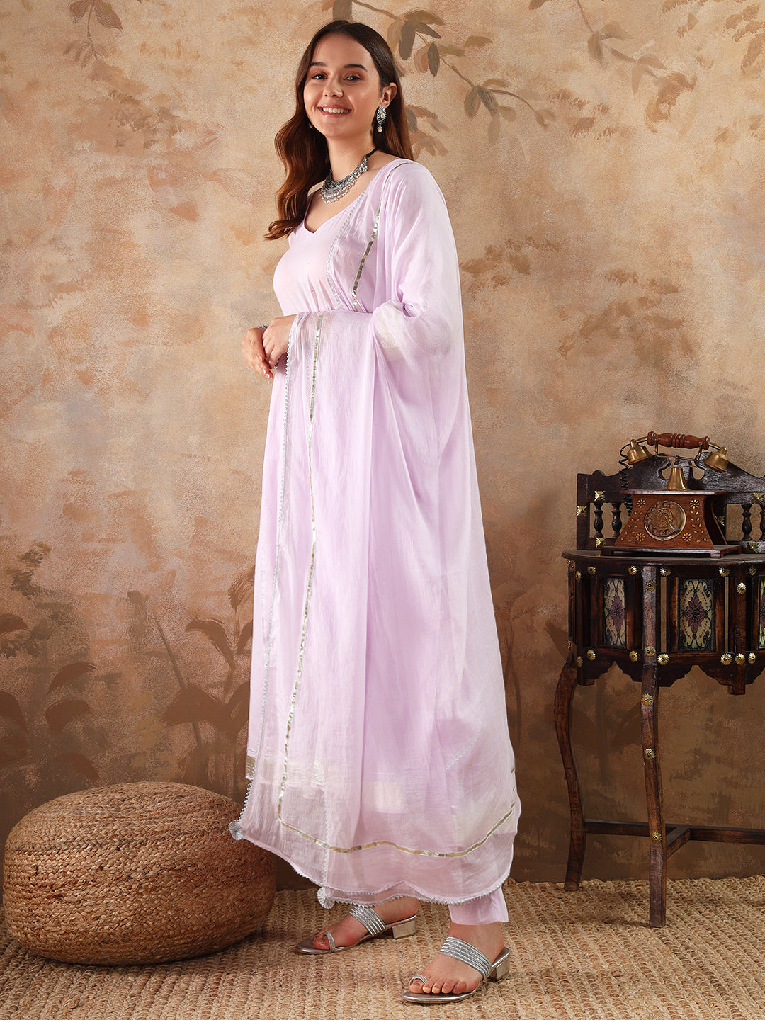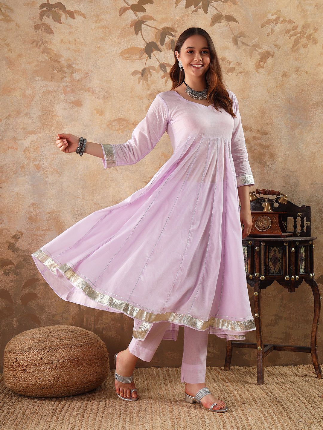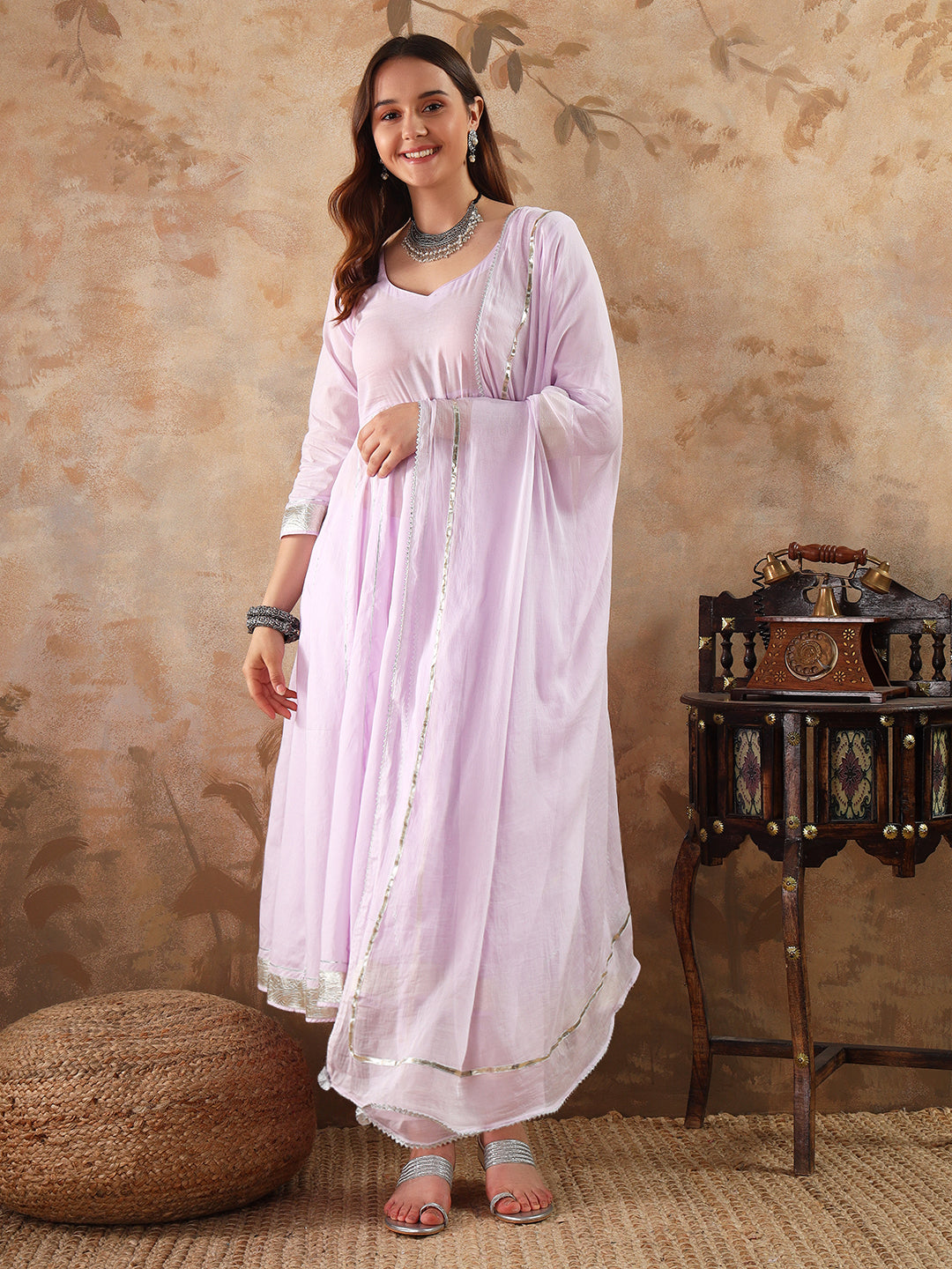 our 3-piece cotton Anarkali kurta set . Crafted in a light purple, this suit set features a full-length stylish tiered kurta with straight pants and chiffon dupatta. this style is perfect for festival.