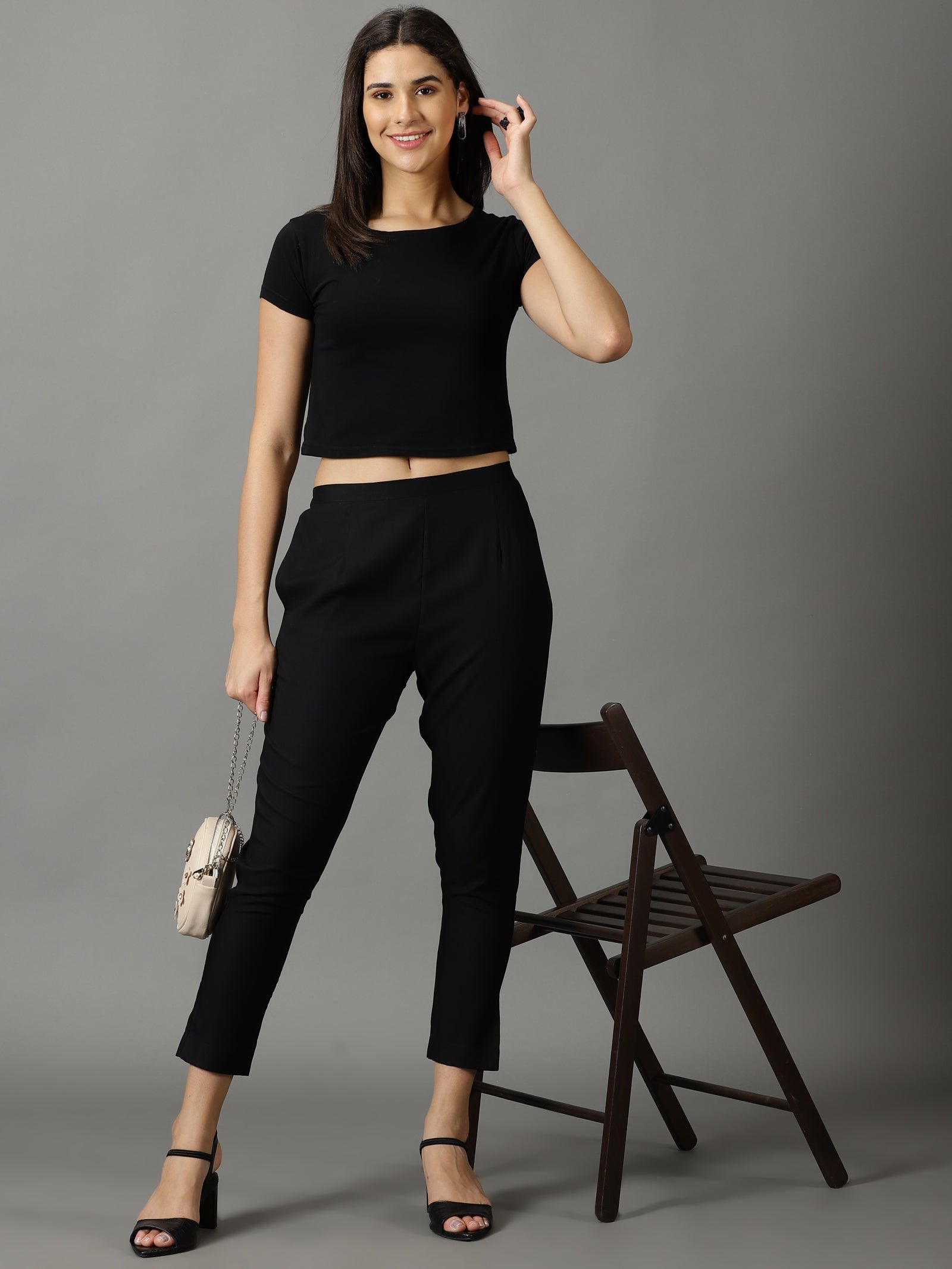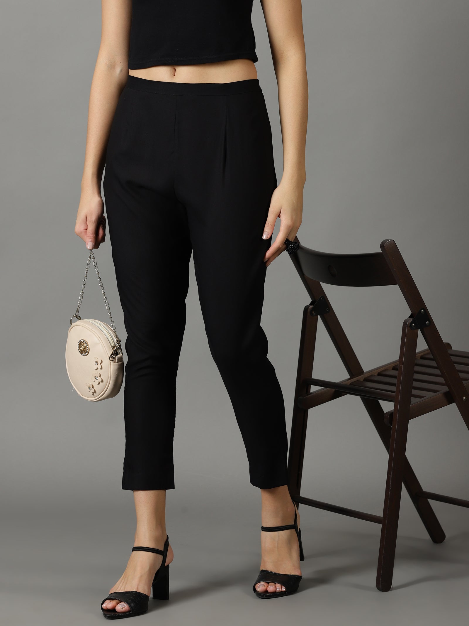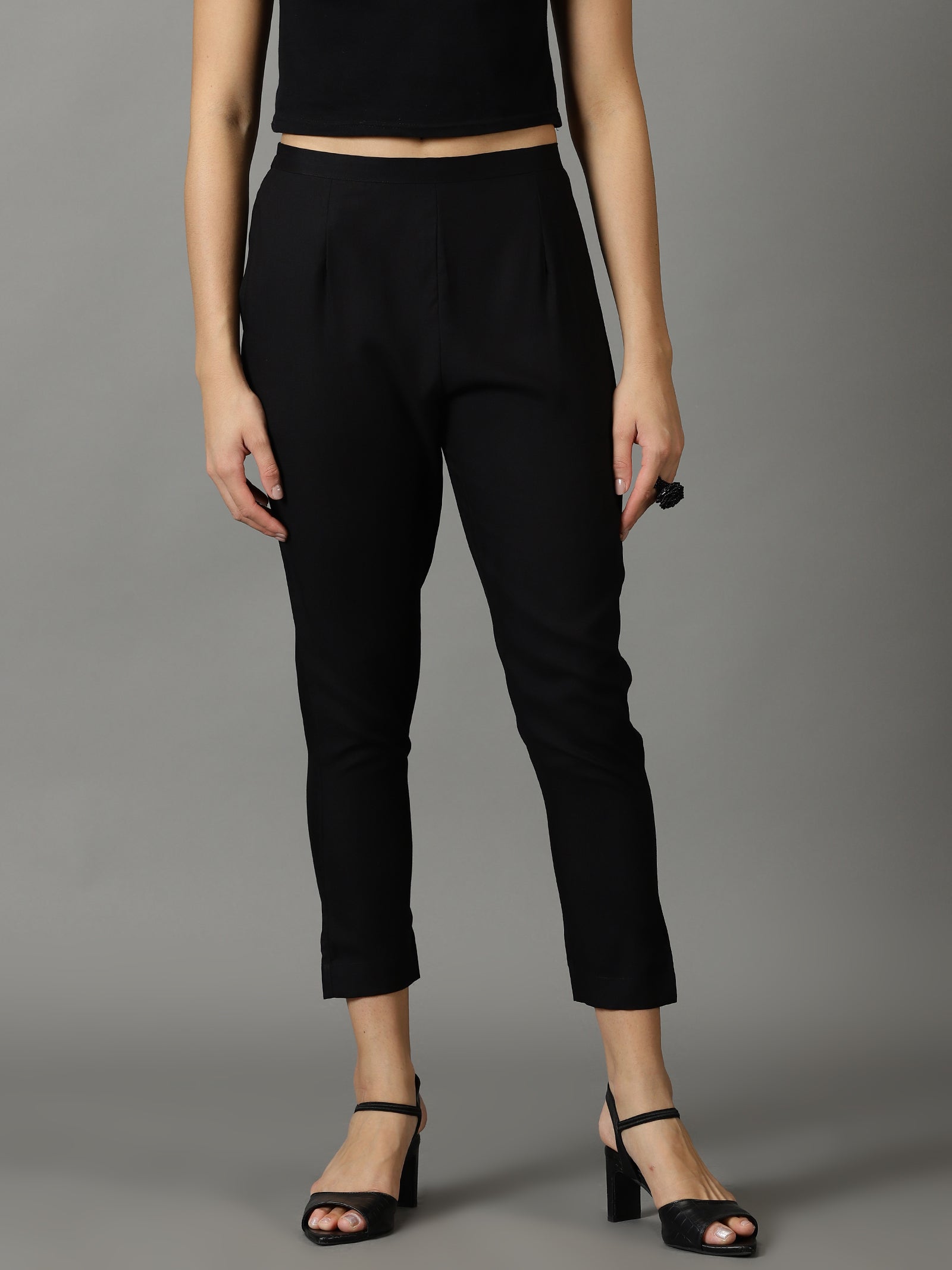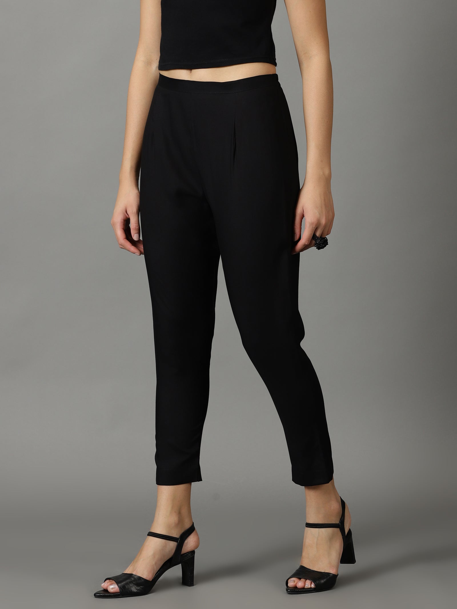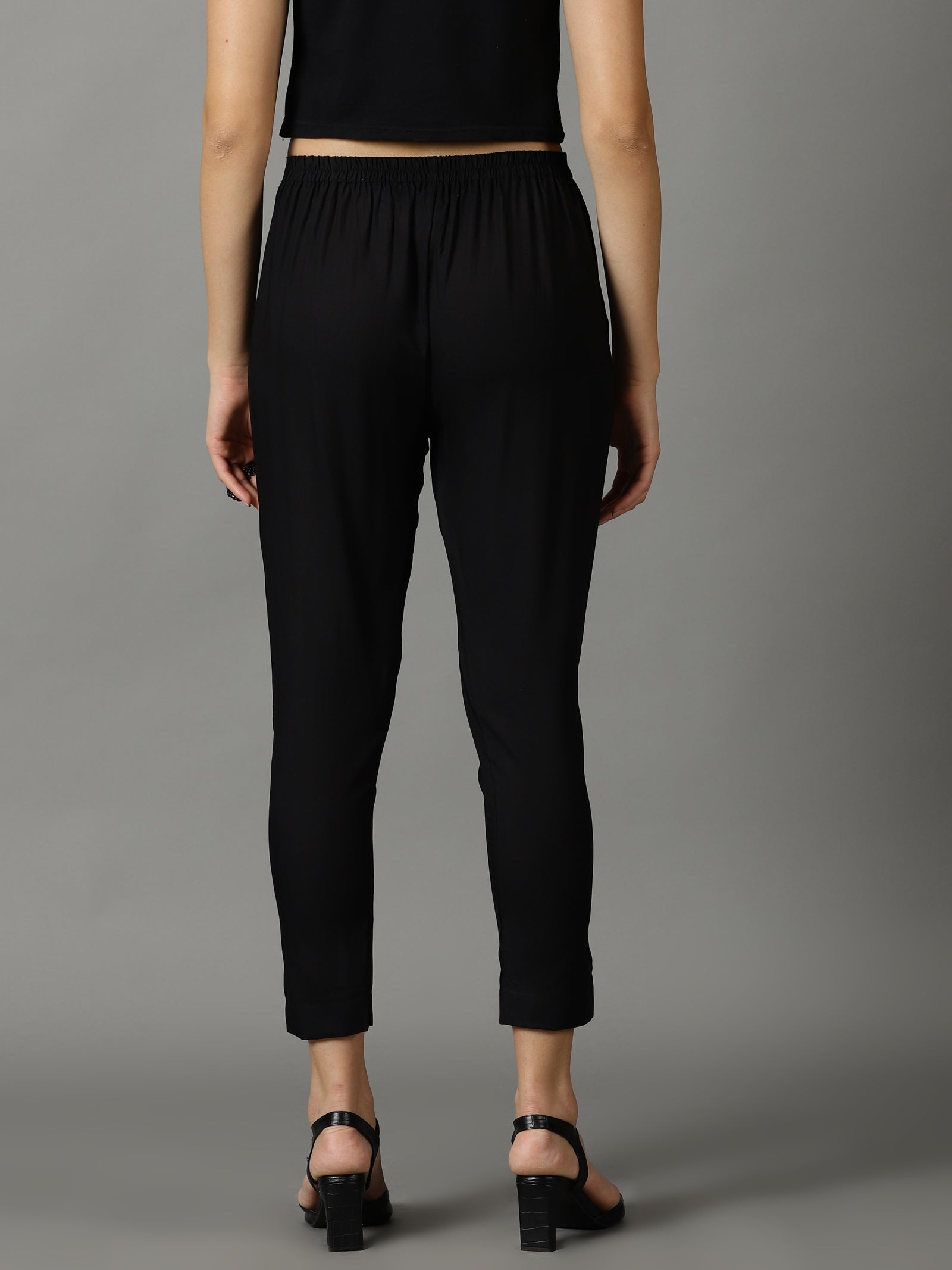 Our black solid-tone straight-fit trouser pants,made of lightweight rayon fabric, have a partially elasticated waistband and roomy pockets. This charming style is perfect for casual outings
