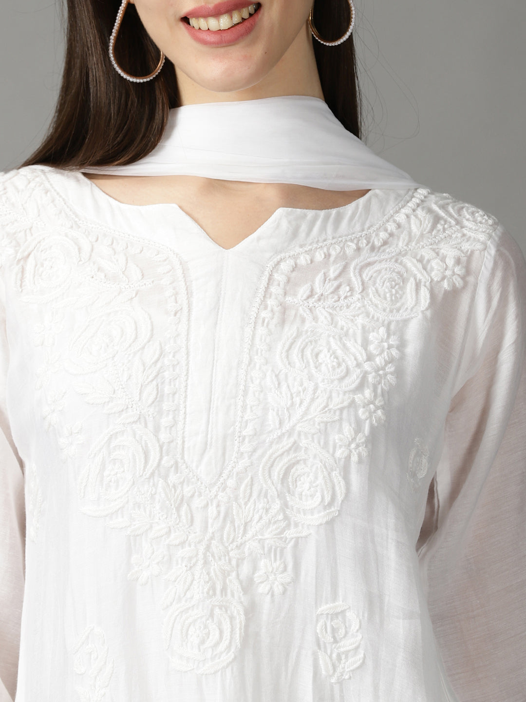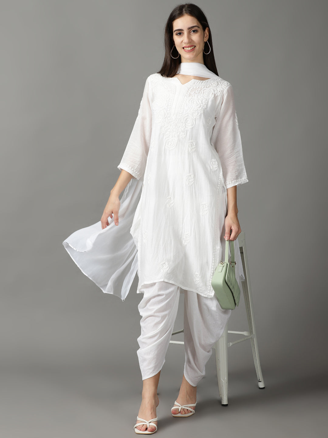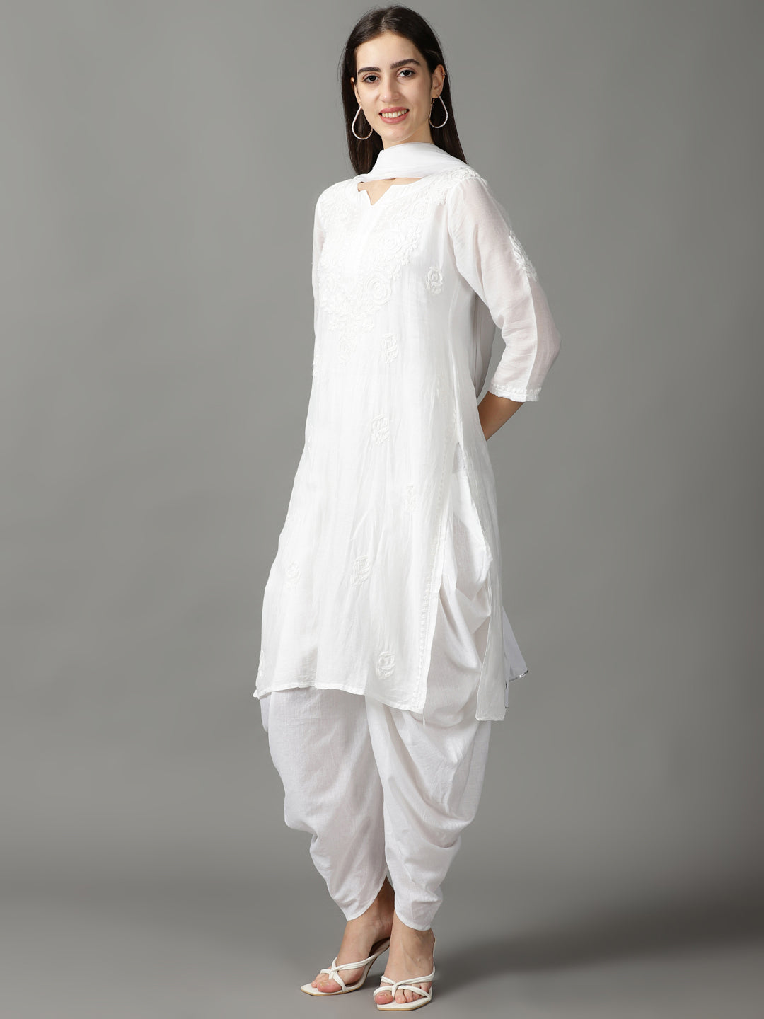 Our 3-piece white cotton suit set features a lucknowi chikankari straight-fit kurta with a notched neckline and three-quarter sleeves. Complemented with dhoti with a partially elasticated waistband, and a dupatta. this style is perfect for elevated everyday wear.