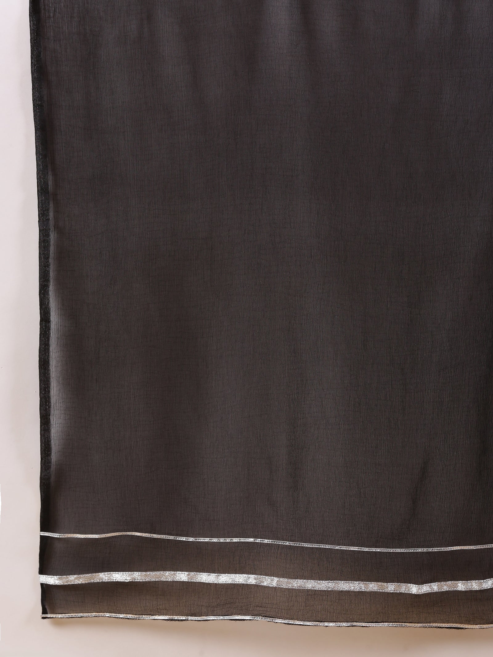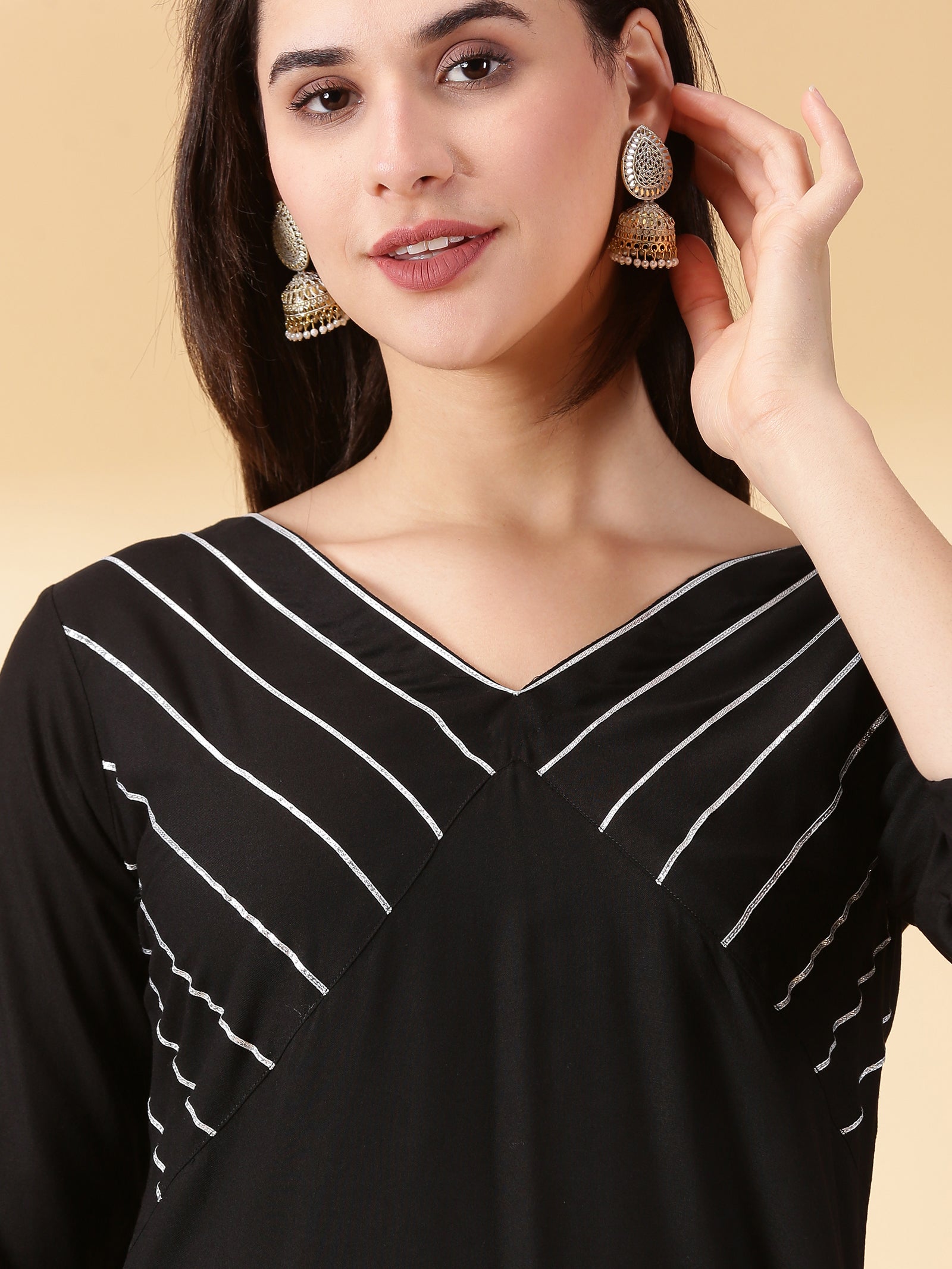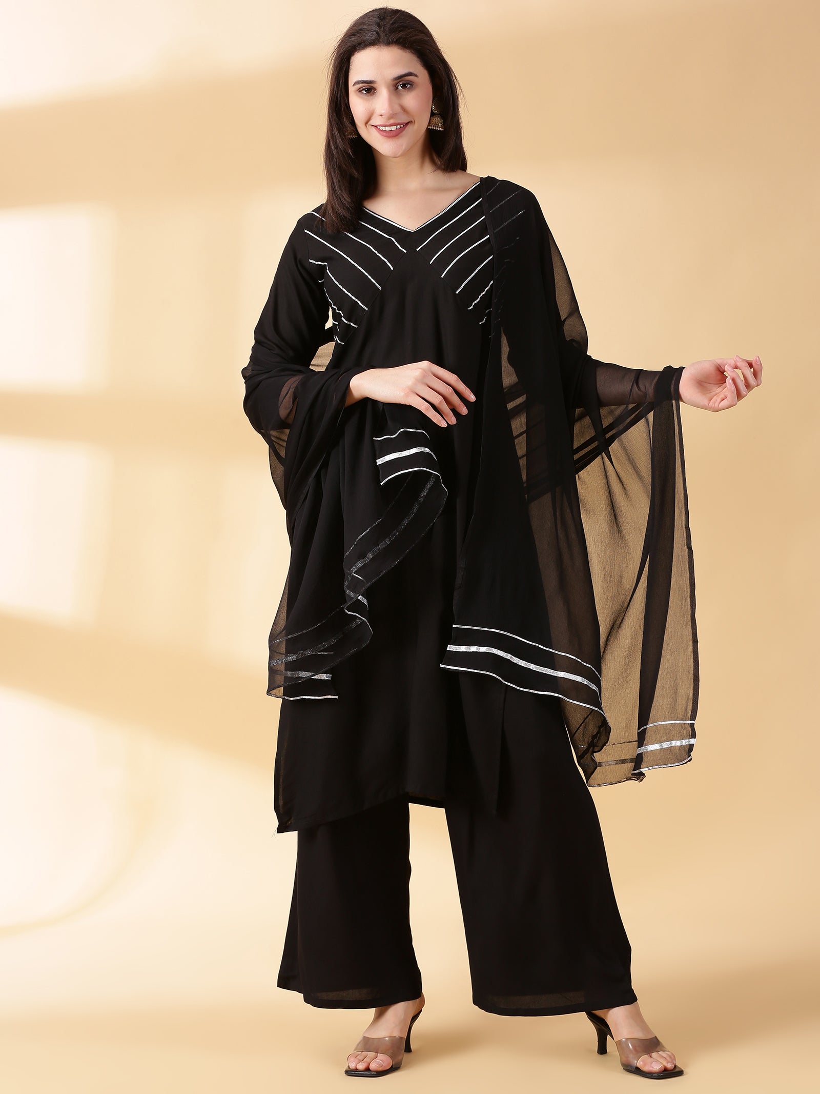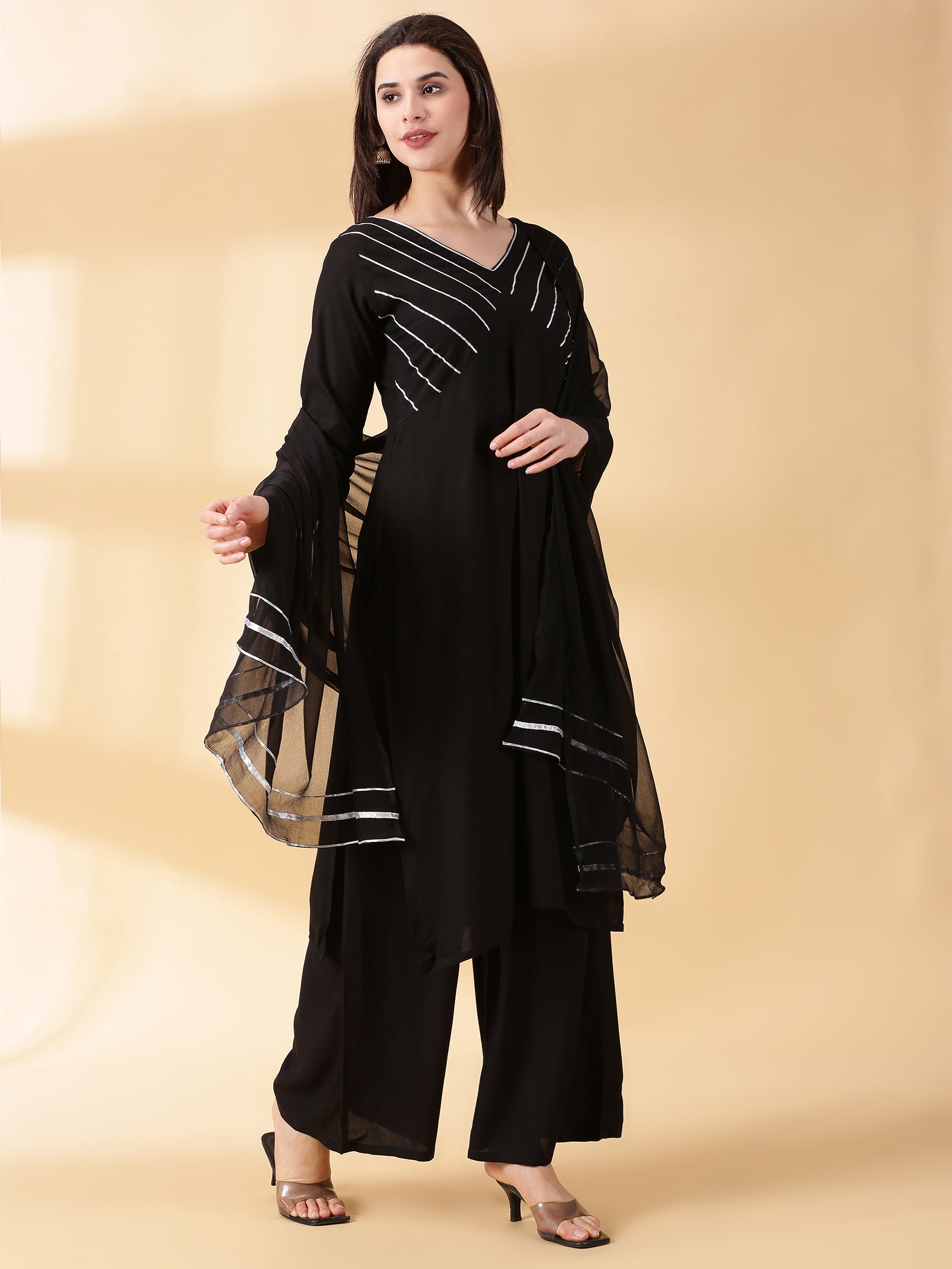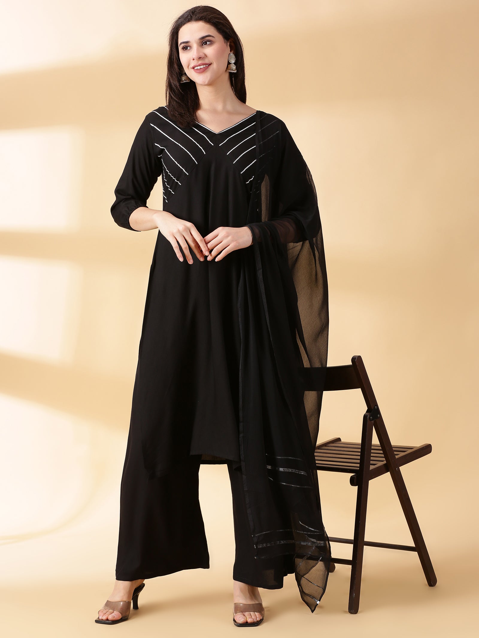 Our 3 piece black reyon alia cut kurta set features .v-neckline and three quarter sleeves. Complemented with palazzos with a partially elasticated waistband and dupatta. Adorned with gota patti detailing, this style is perfect for casual outings.