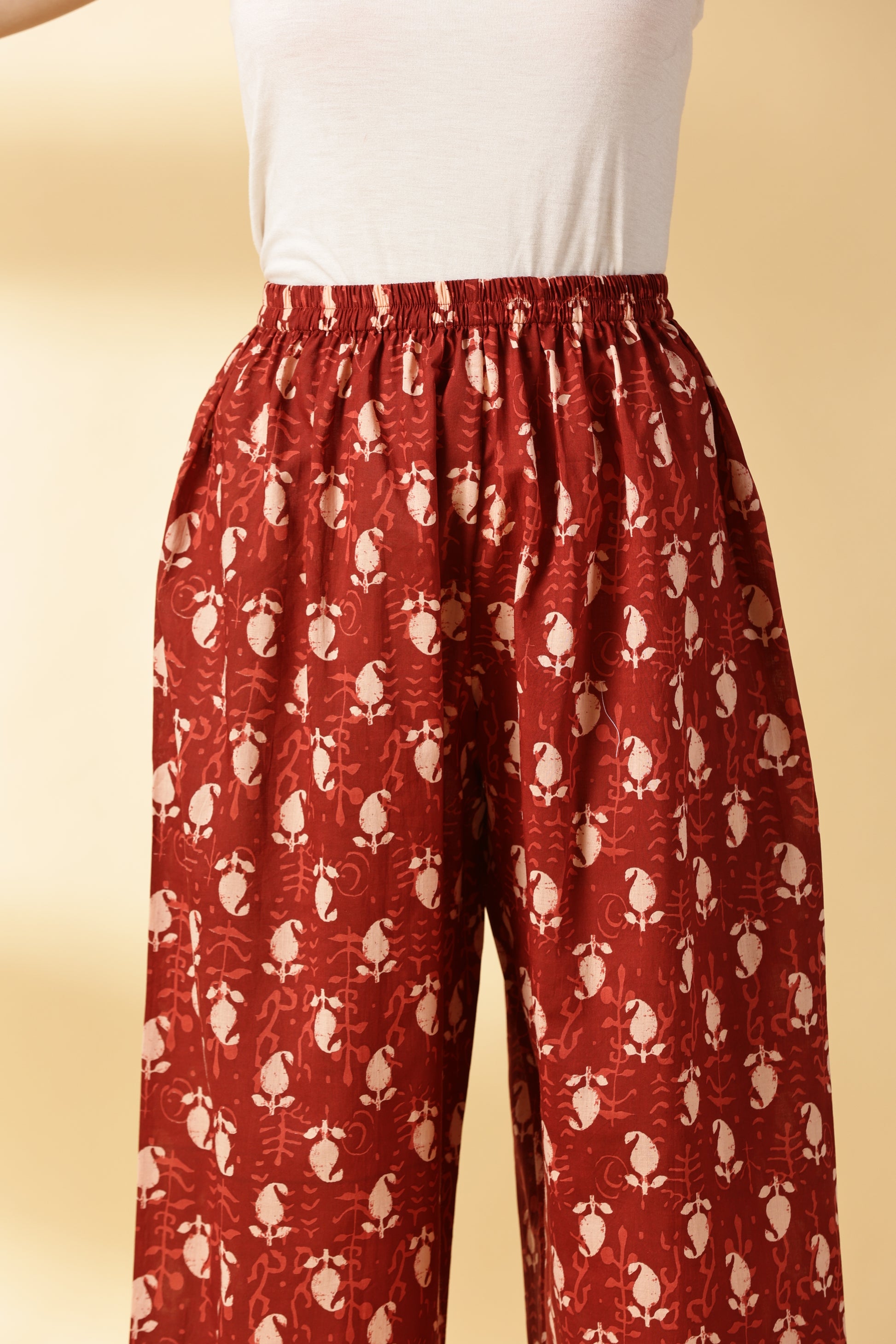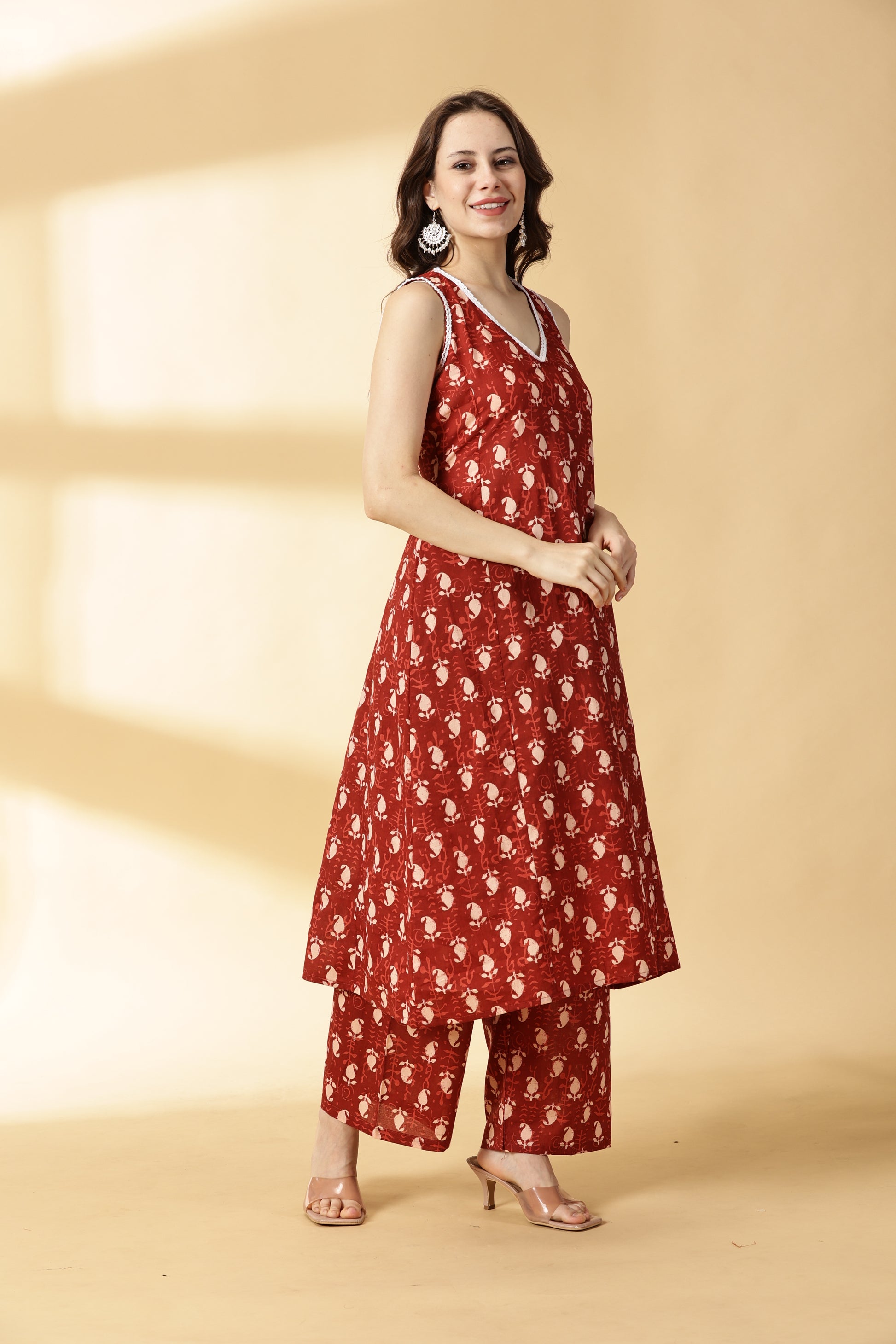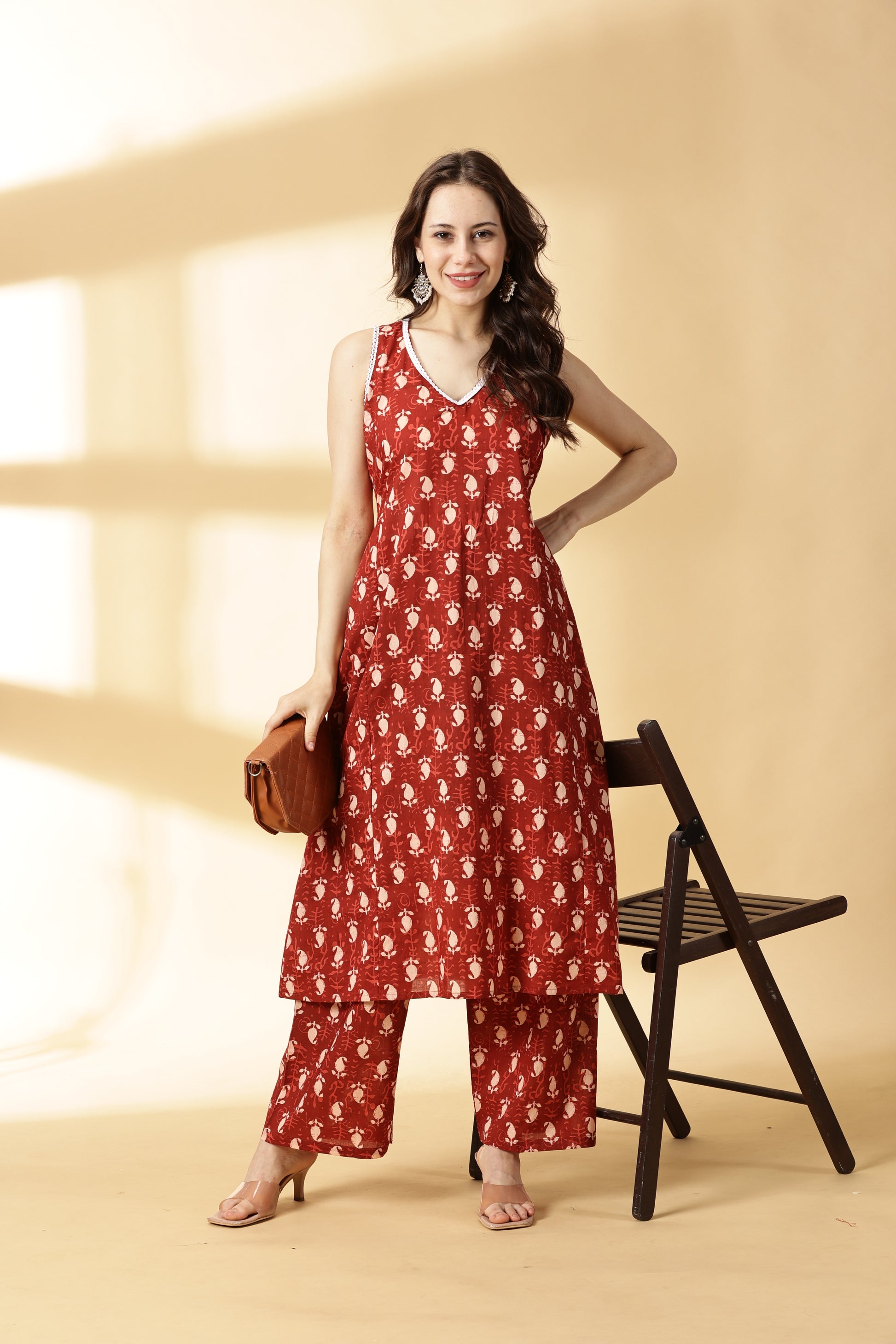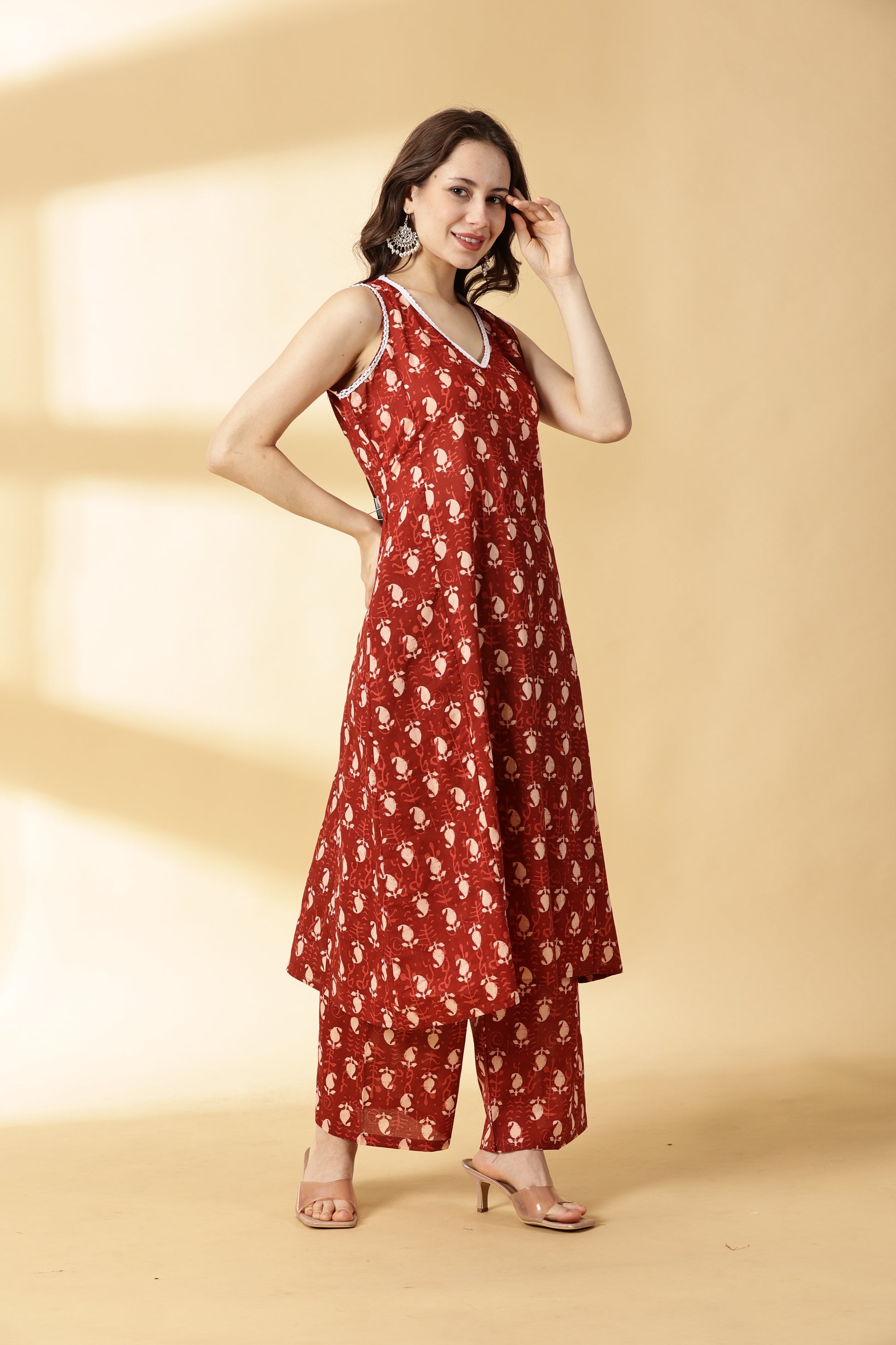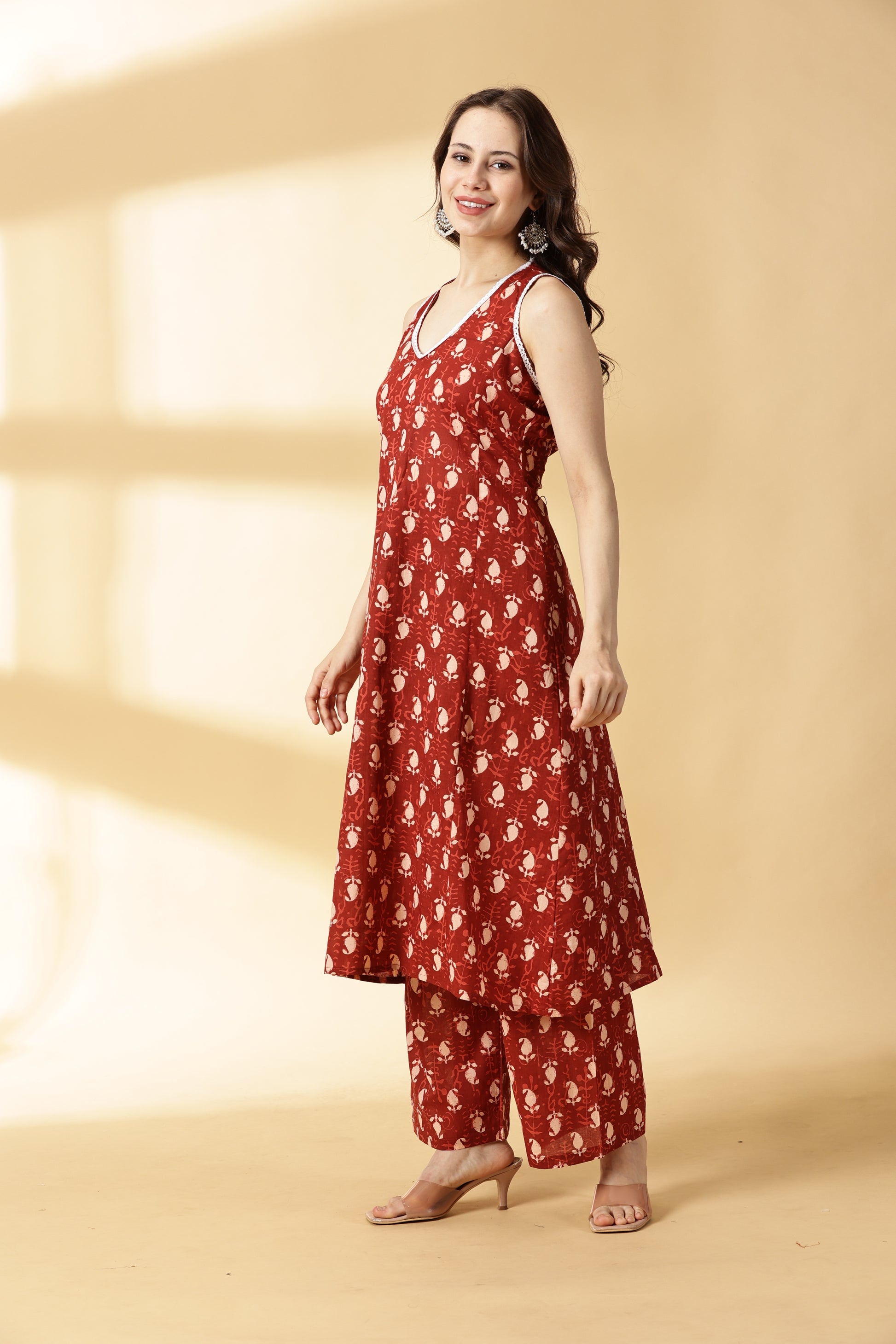 Our 2-piece brown printed cotton suit set features a floral print A-line kurta with a round neckline, and sleeveless, and a statement yoke. Complemented with palazzo with a partially elasticated waistband. Adorned with fabric-trim accents, lace detailing, and captivating floral and paisley prints, this style is perfect for elevated everyday wear.