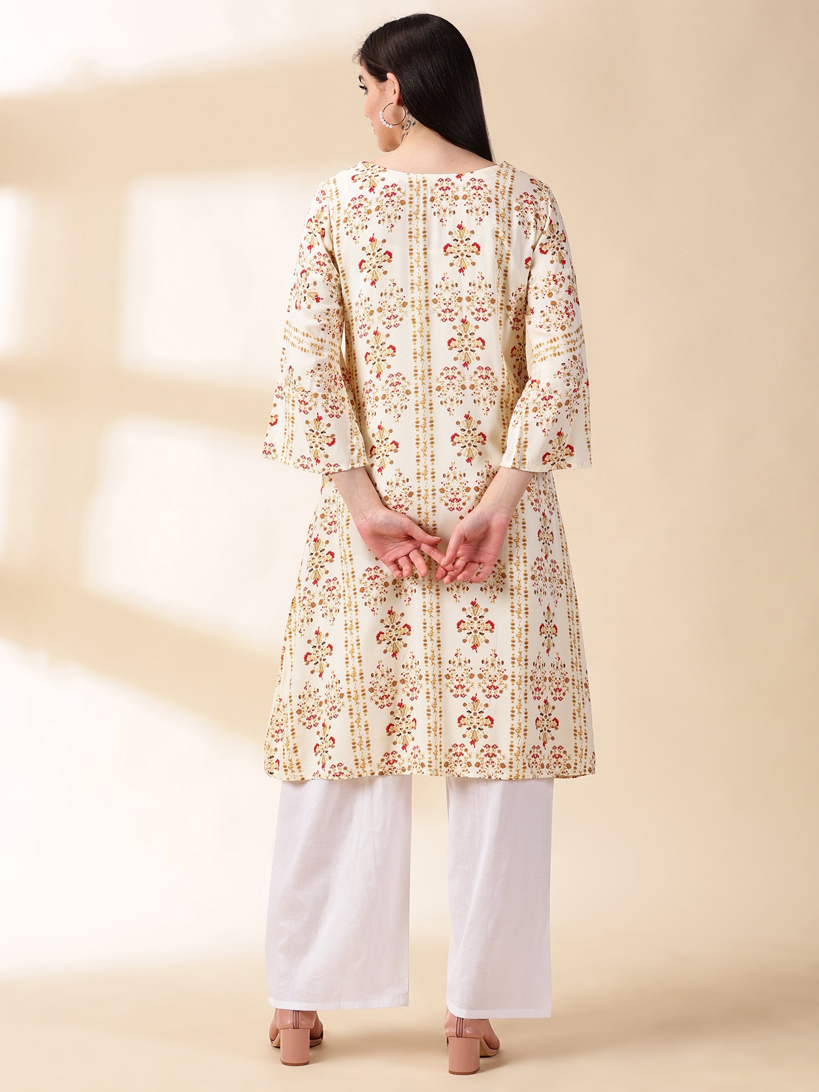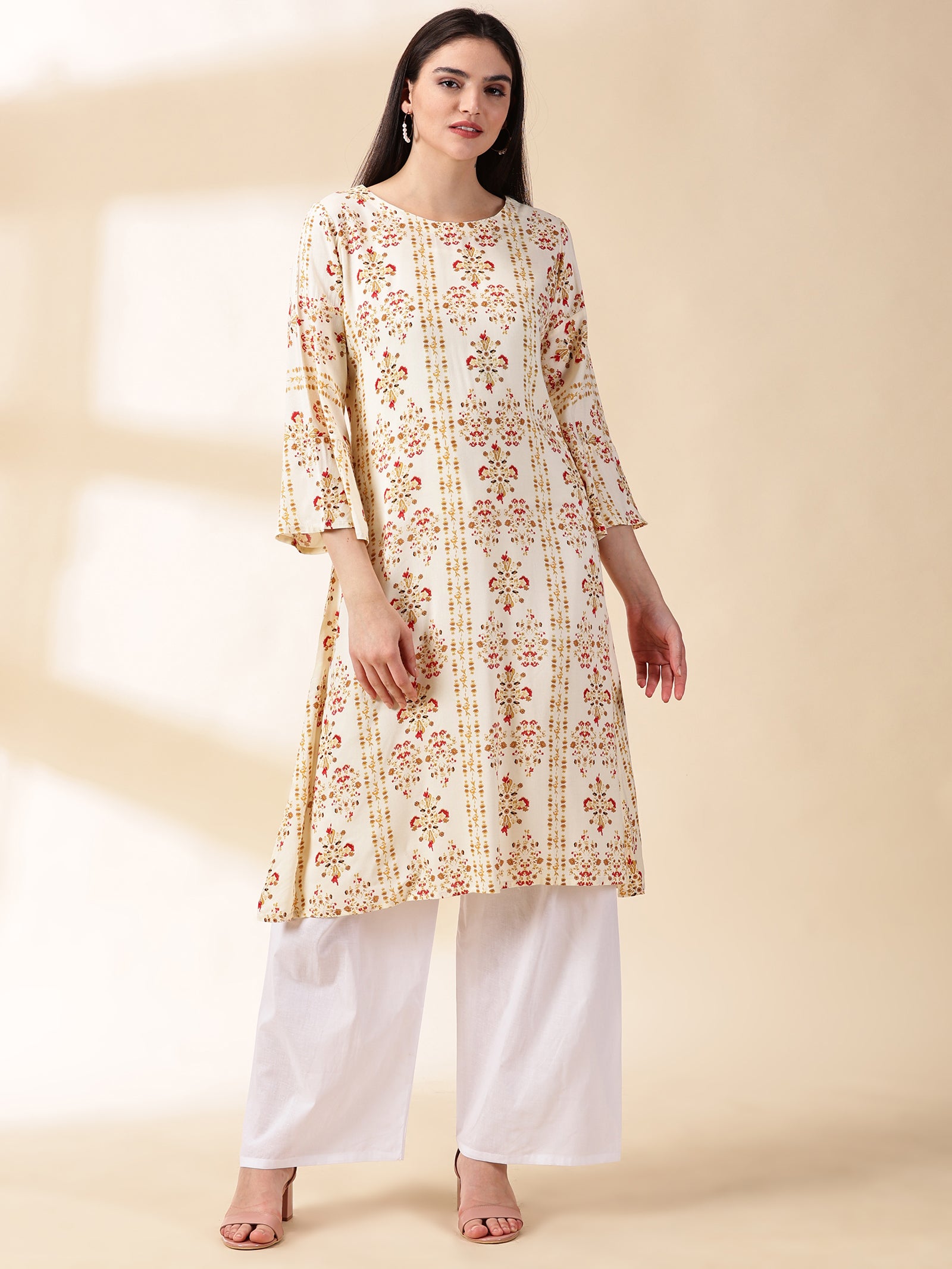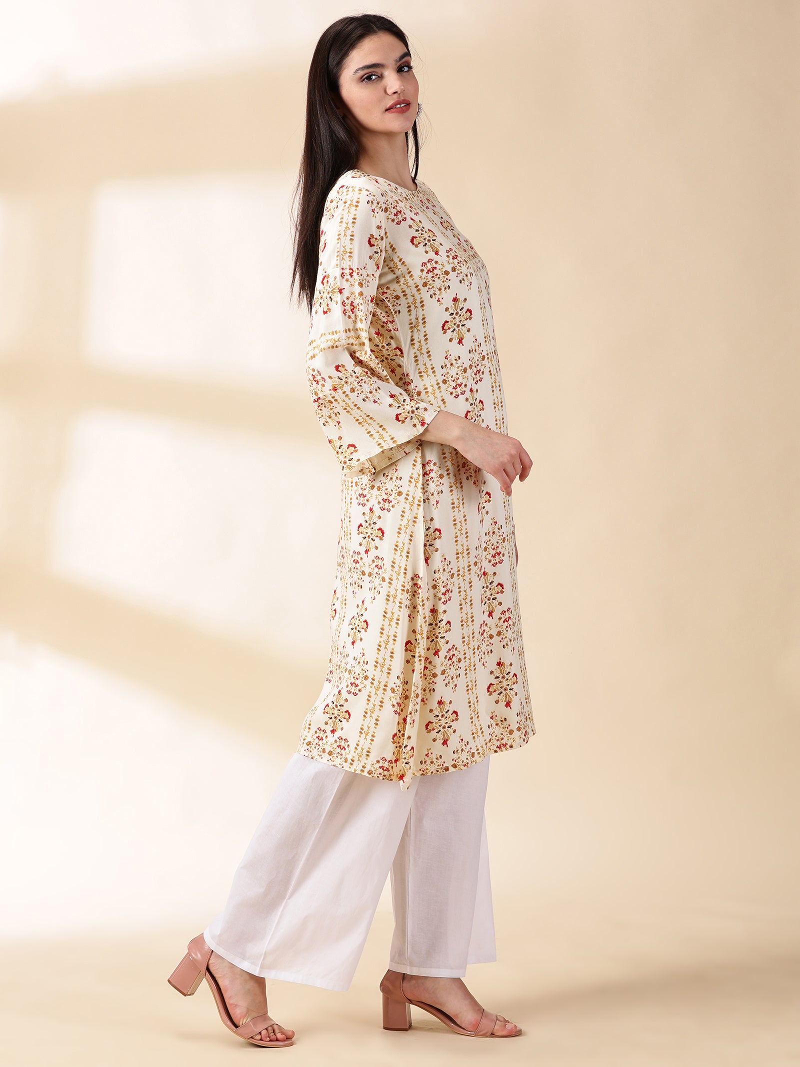Our off white straight-fit floral print cotton kurta features a notched neckline and three-quarter sleeves. Adorned with delicate Gota Patti and fabric-trim accents, this refreshing style is ideal for casual outings.