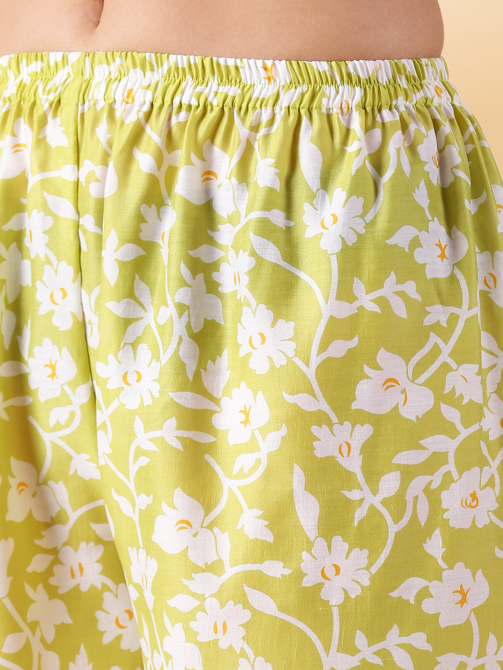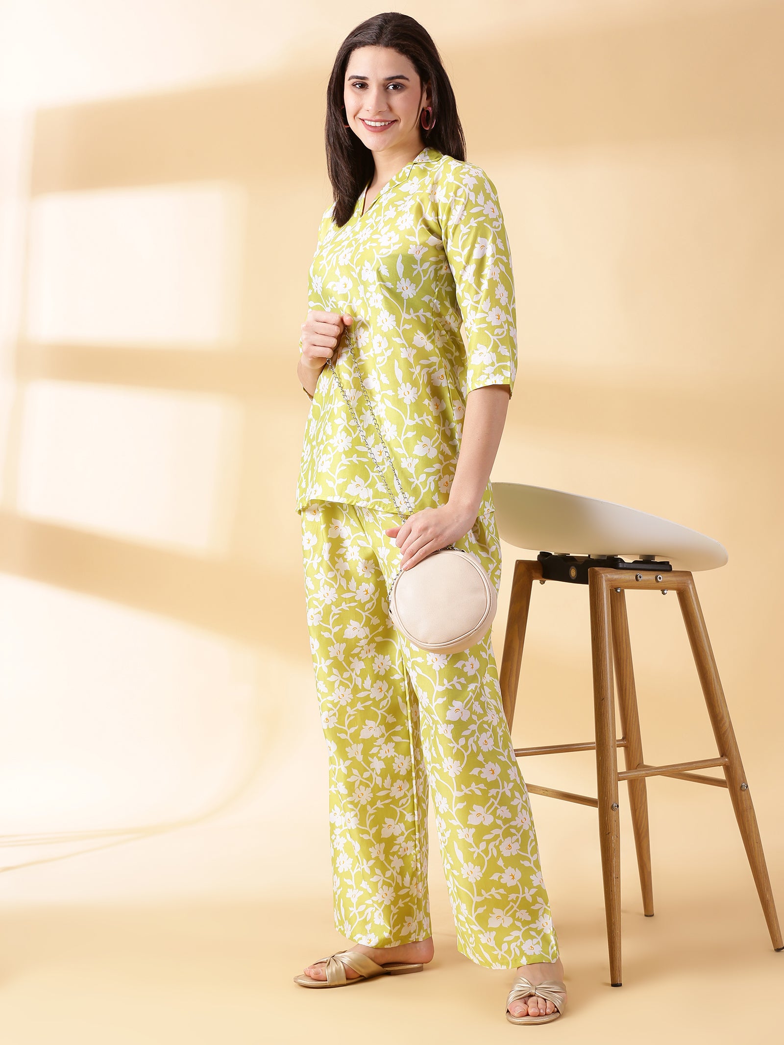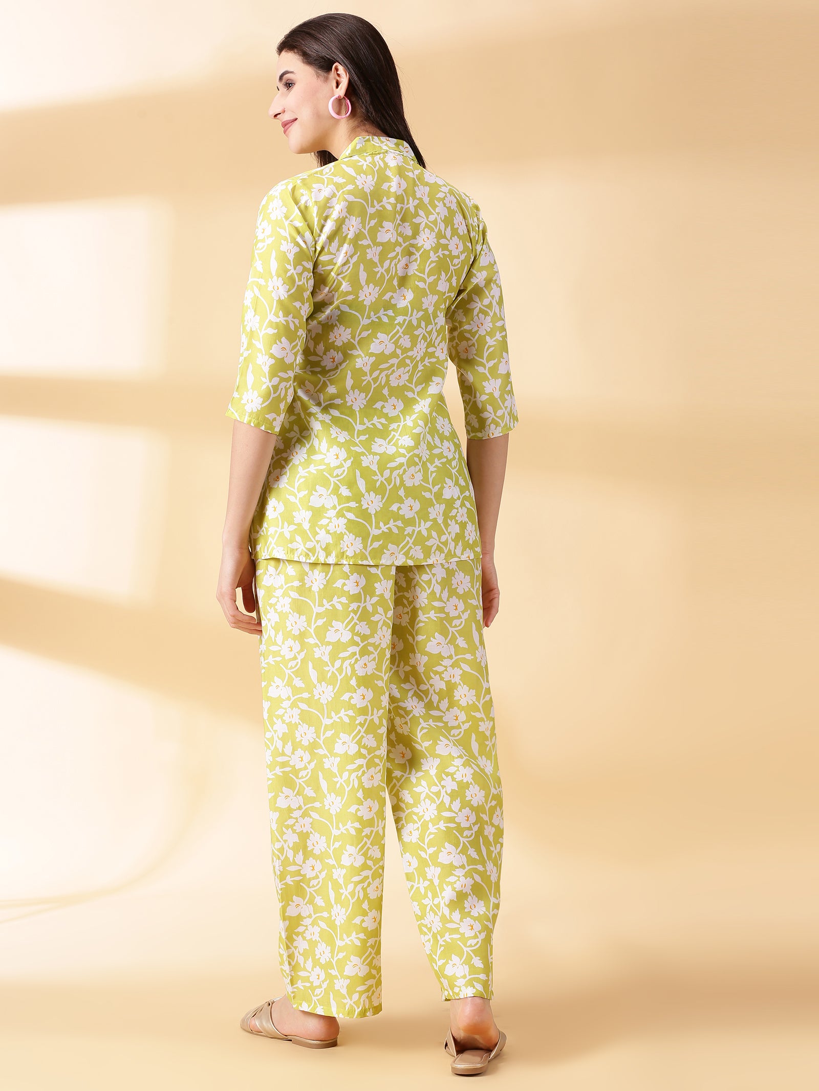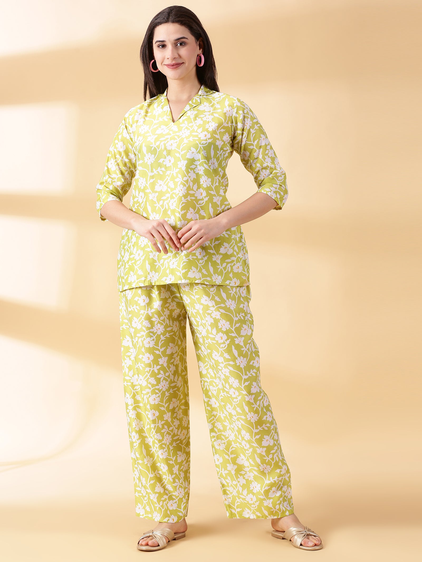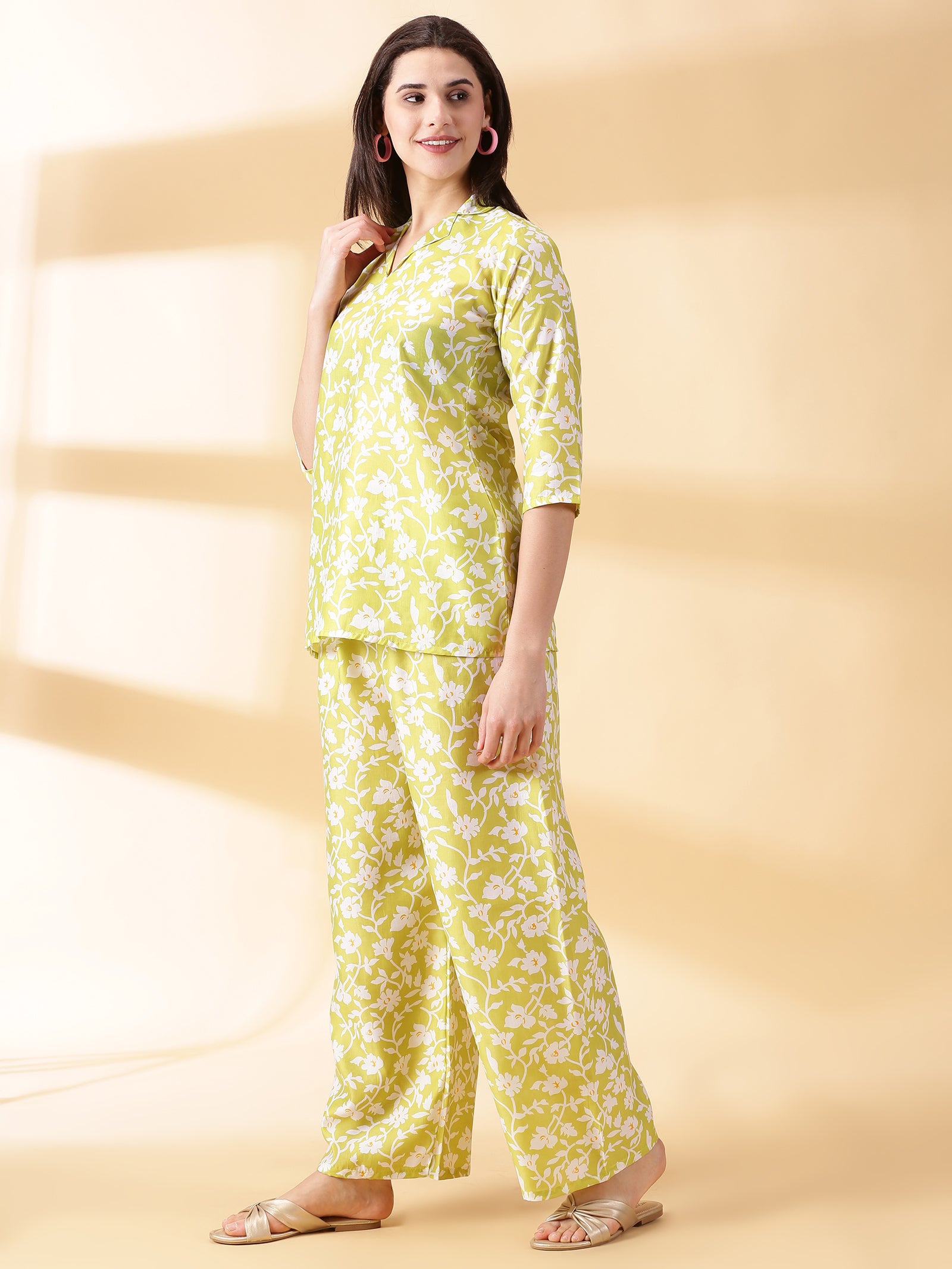 Our 2 piece green flower printed cotton mix night suit set features a notched neck with three quarter sleeves complemented with flared palazzo this comfortable style is ideal for lounging or running errands.