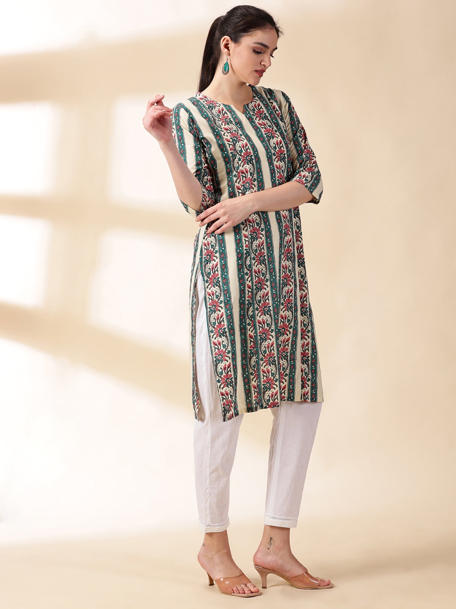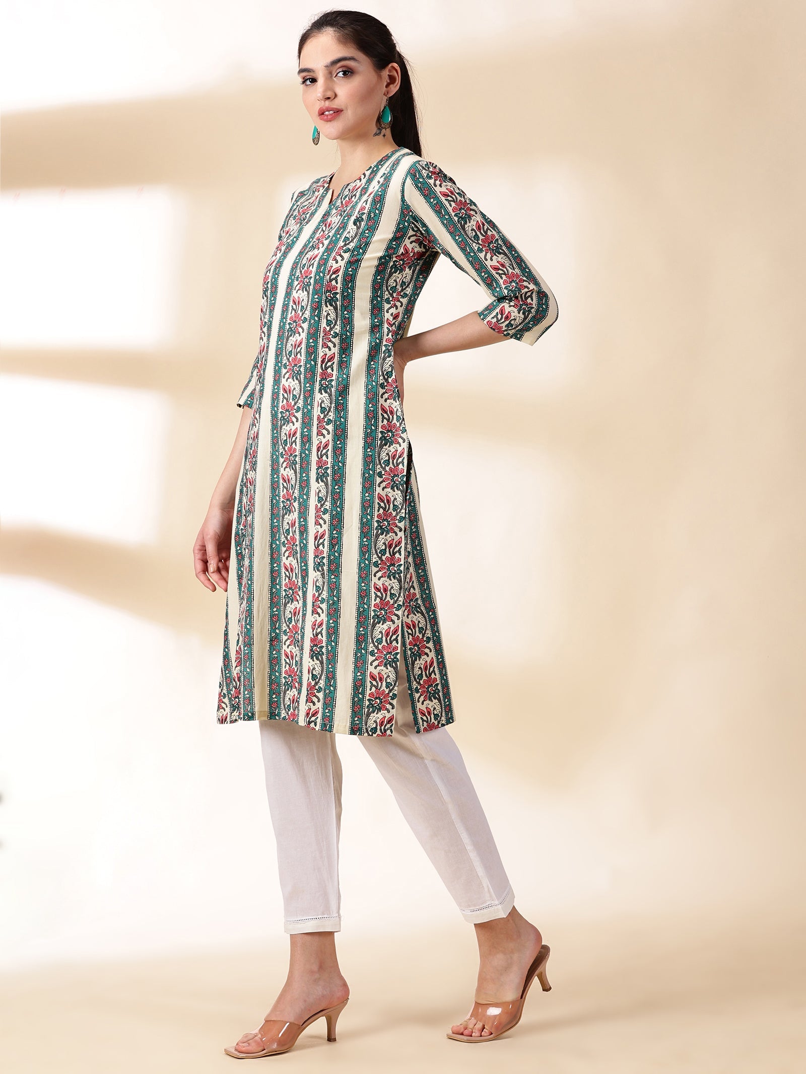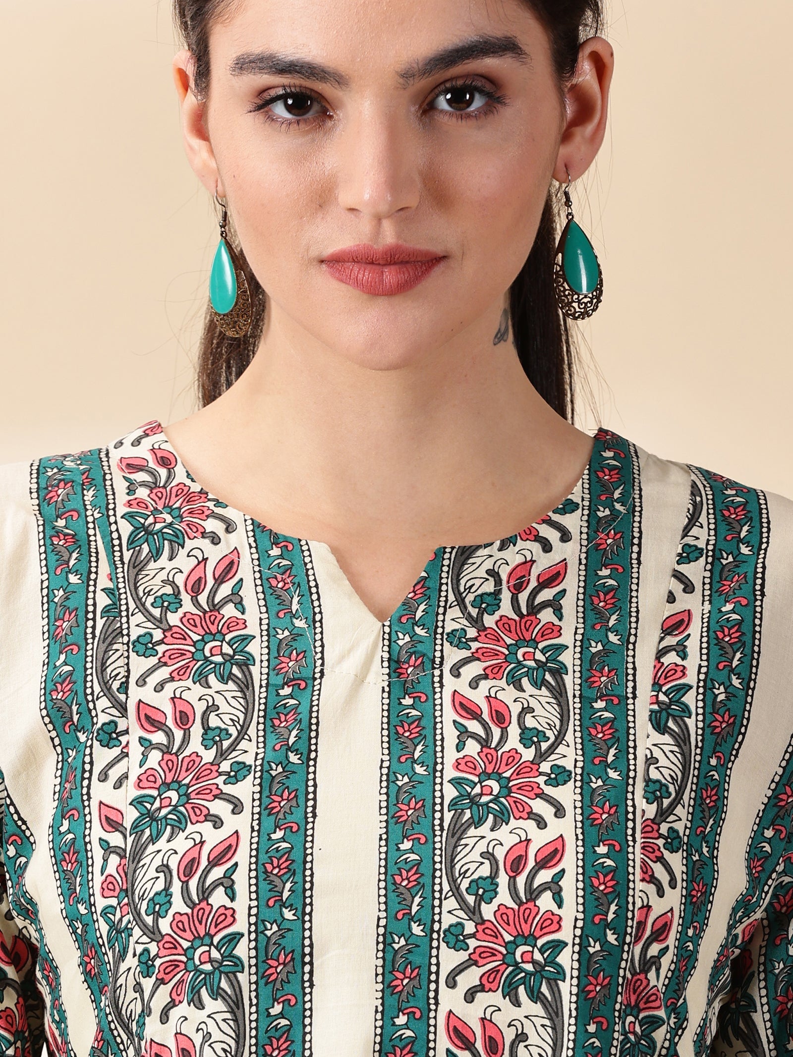 Our 2-piece green printed cotton kurta set featurs a floral print straight-fit kurta with round neckline and three-quarter sleeves.complemented with pant with a partially elasticated waistband roomy pocket.this style is perfect for elevated everyday wear.