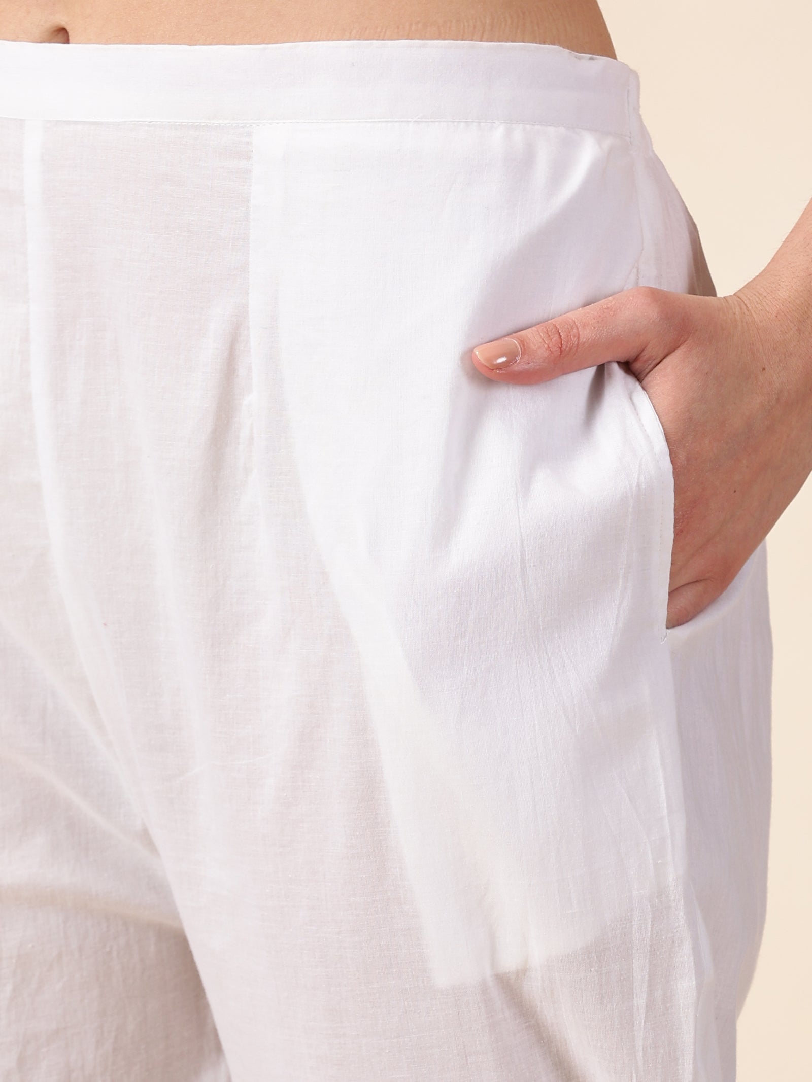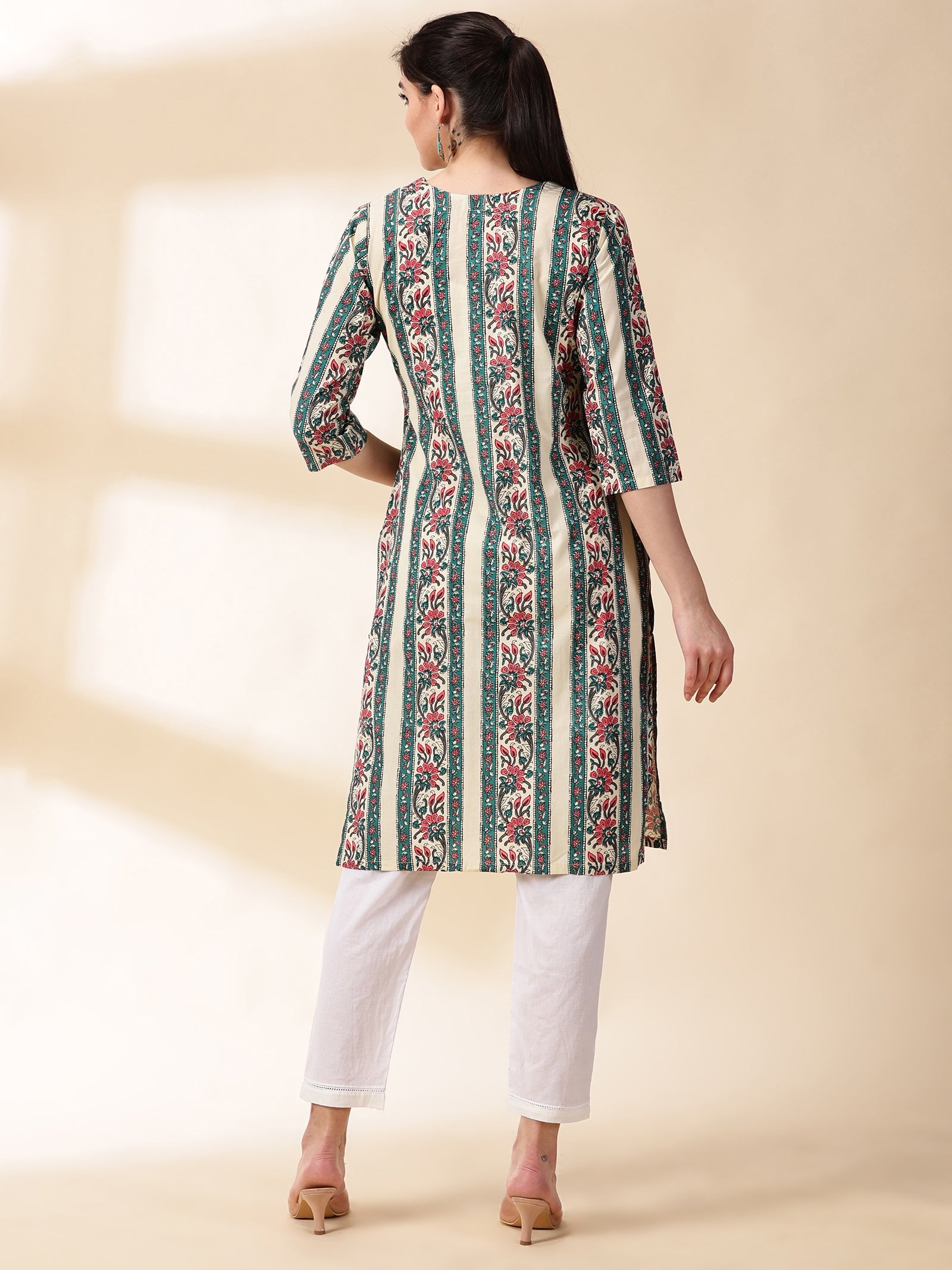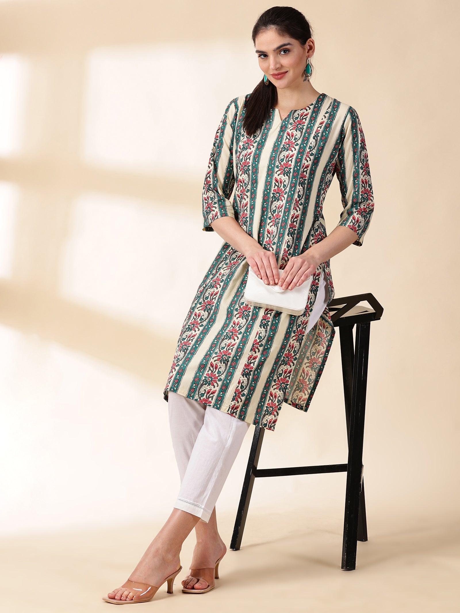Our 2-piece green printed cotton kurta set featurs a floral print straight-fit kurta with round neckline and three-quarter sleeves.complemented with pant with a partially elasticated waistband roomy pocket.this style is perfect for elevated everyday wear.