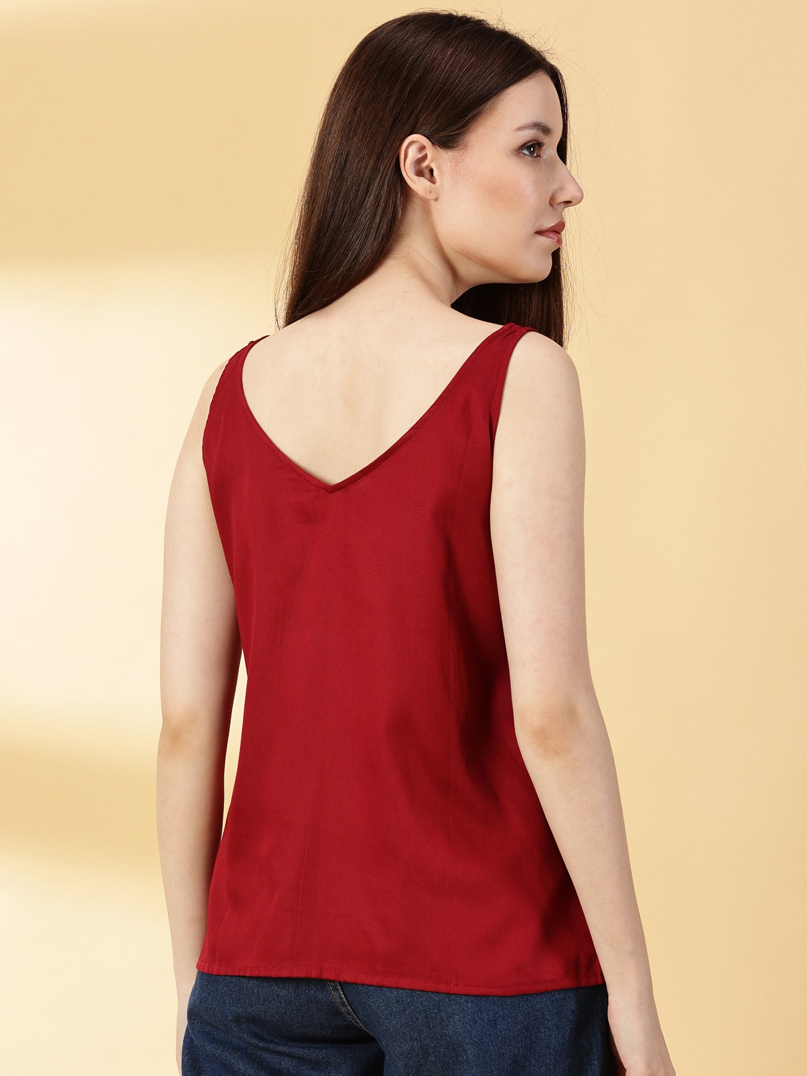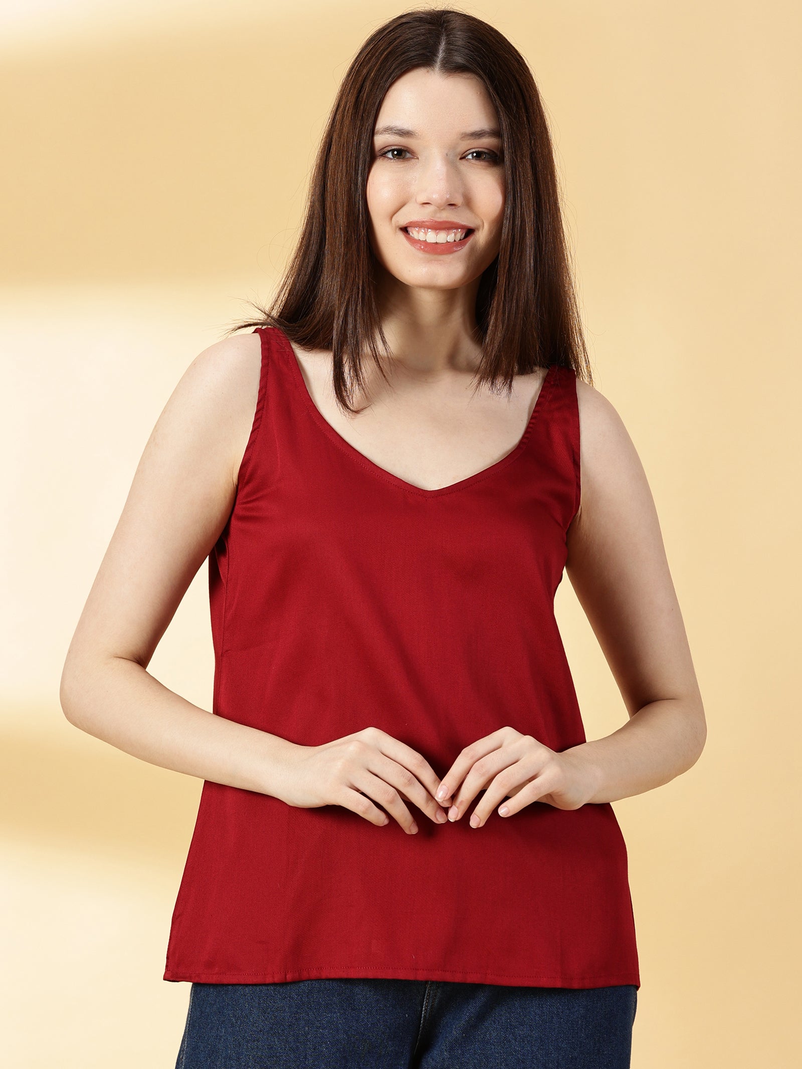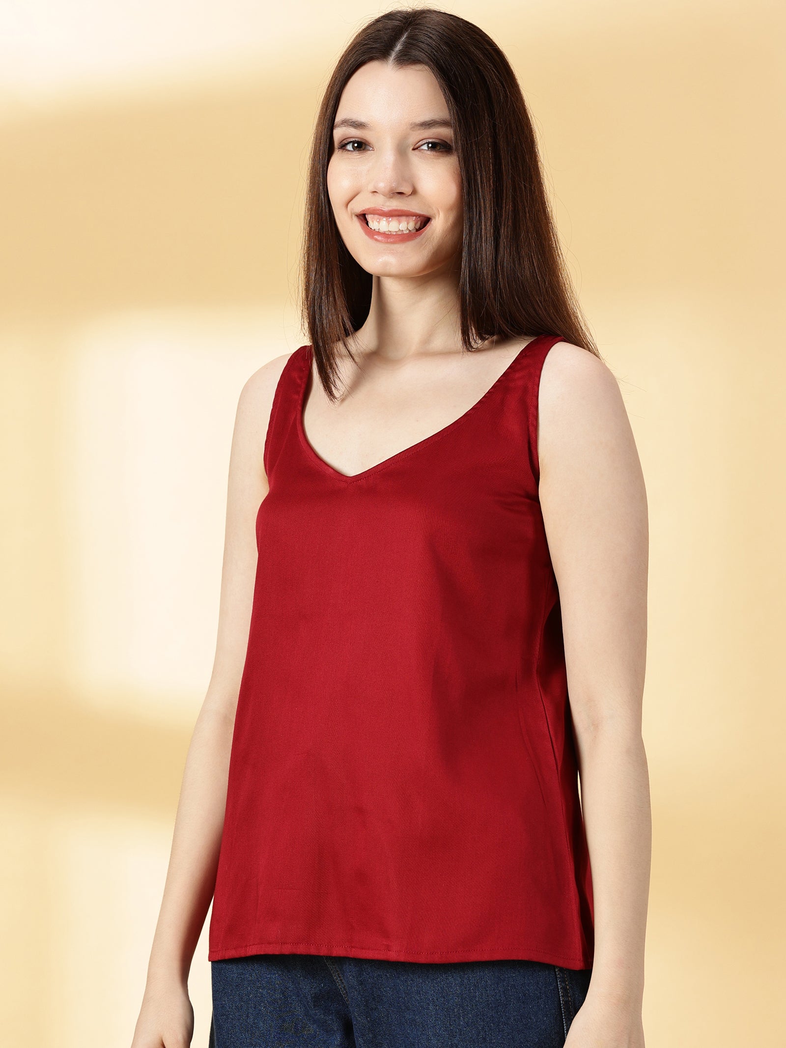 • Fabric: Cotton Silk, Neck: V-Neck, Sleeves: Sleeveless, Color: Maroon, Print or Pattern: Solid, Touch and Feel: Smooth and Soft