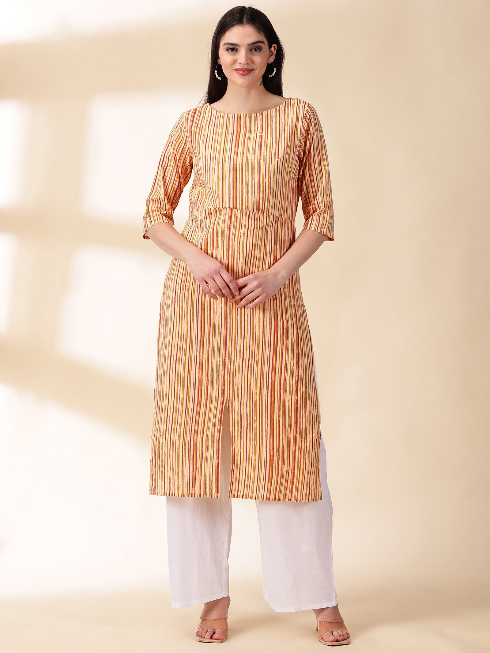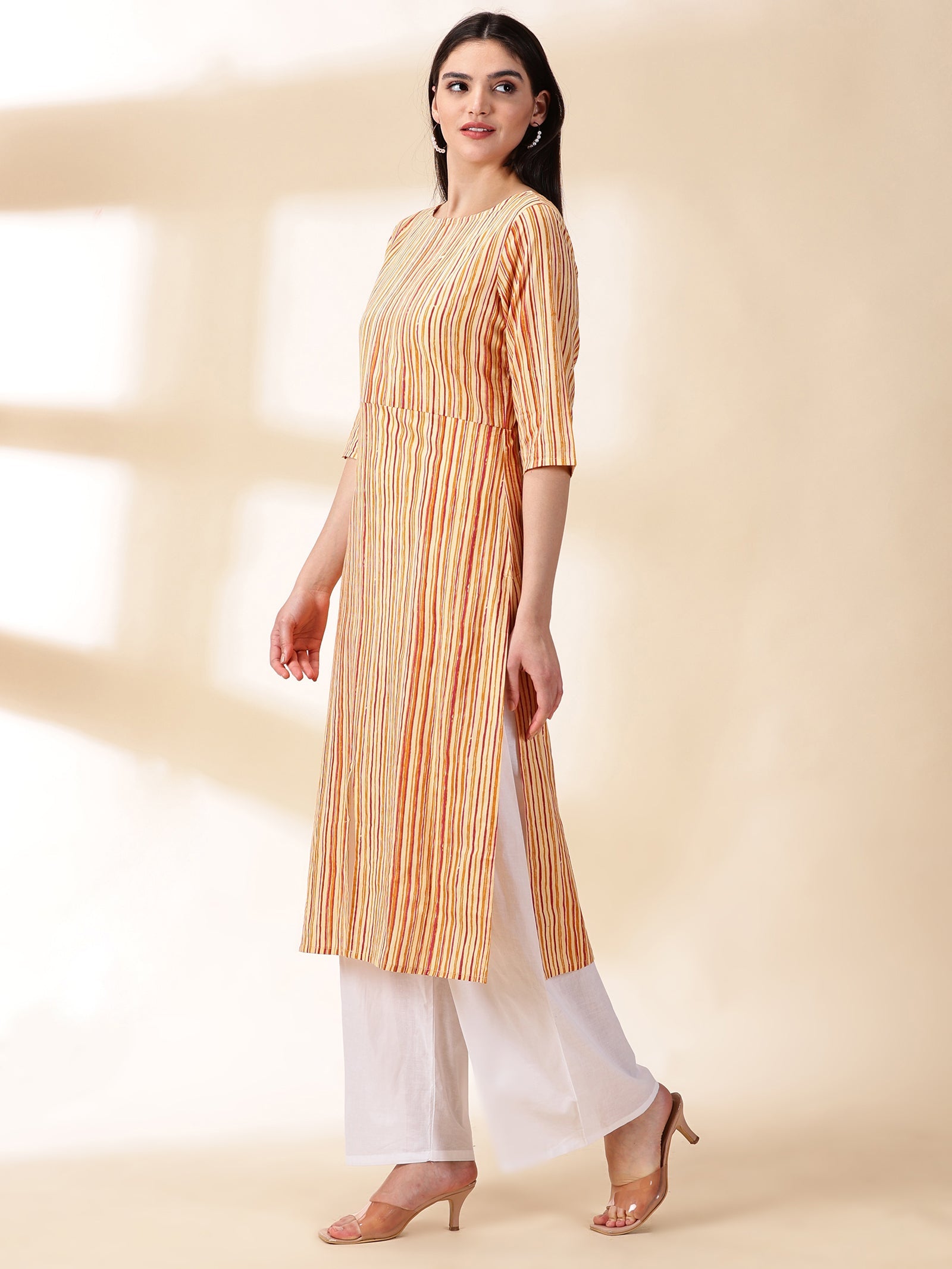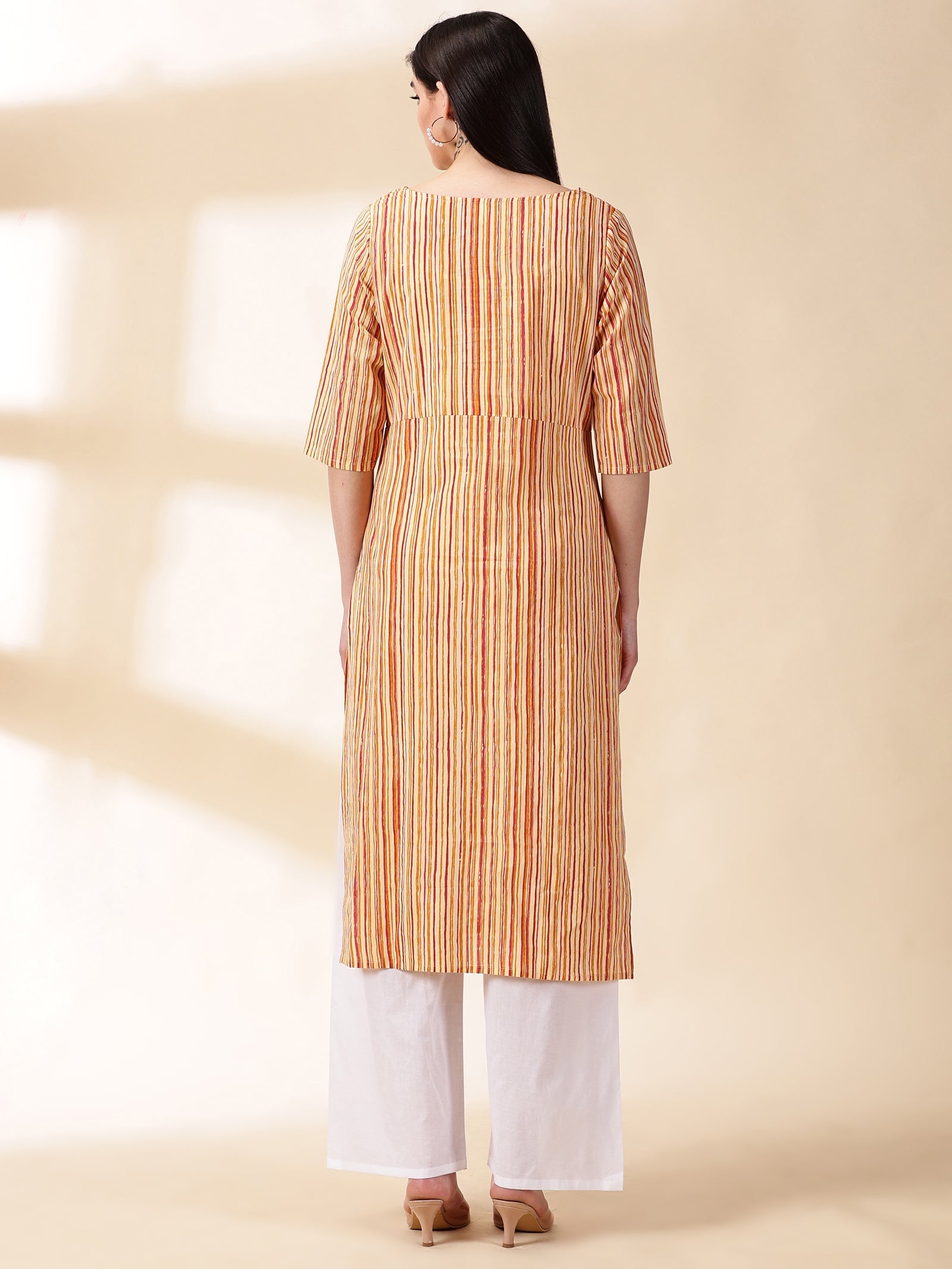 Our mustard printed straight-fit kurta, crafted in sumptuous cotton fabric features a round neckline and three-quarter sleeves. Adorned with delicate sequins accents, this elegant style is ideal for elevated everyday wear.