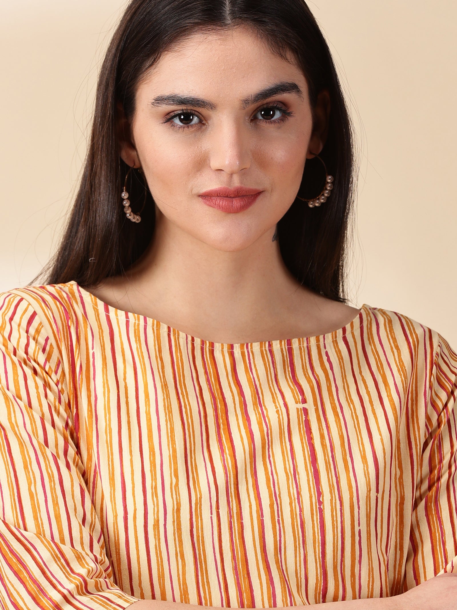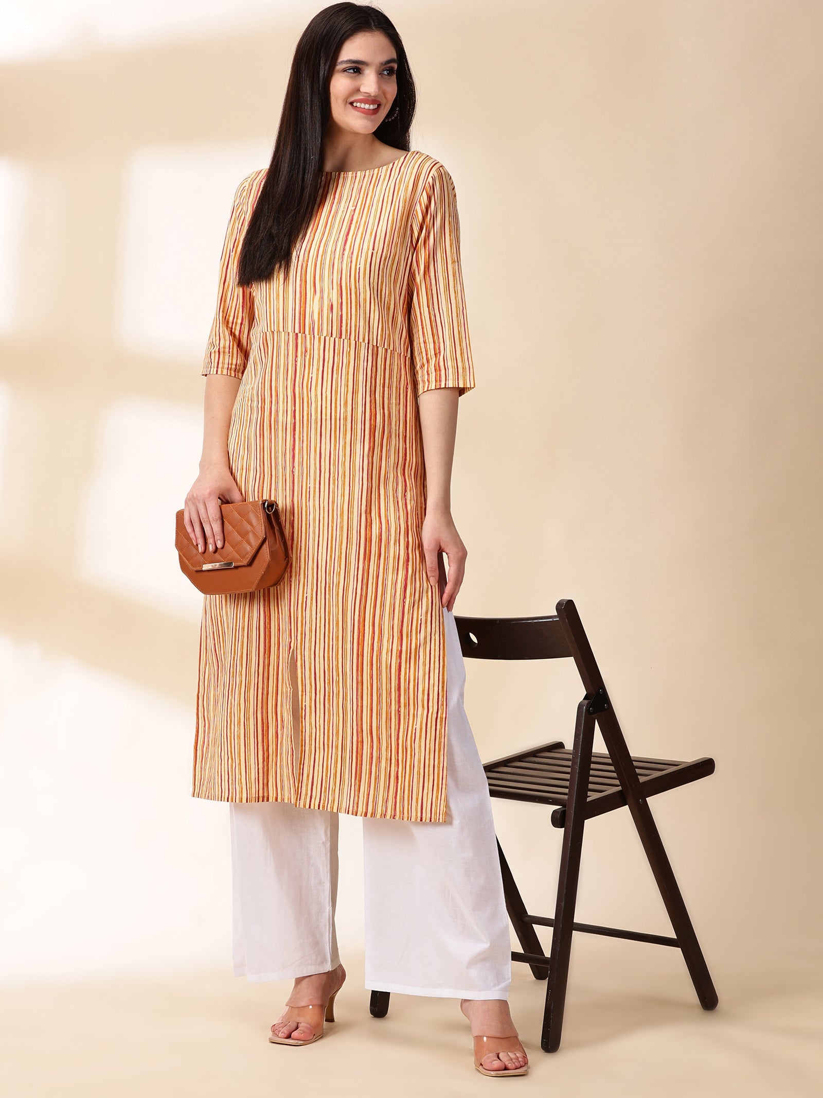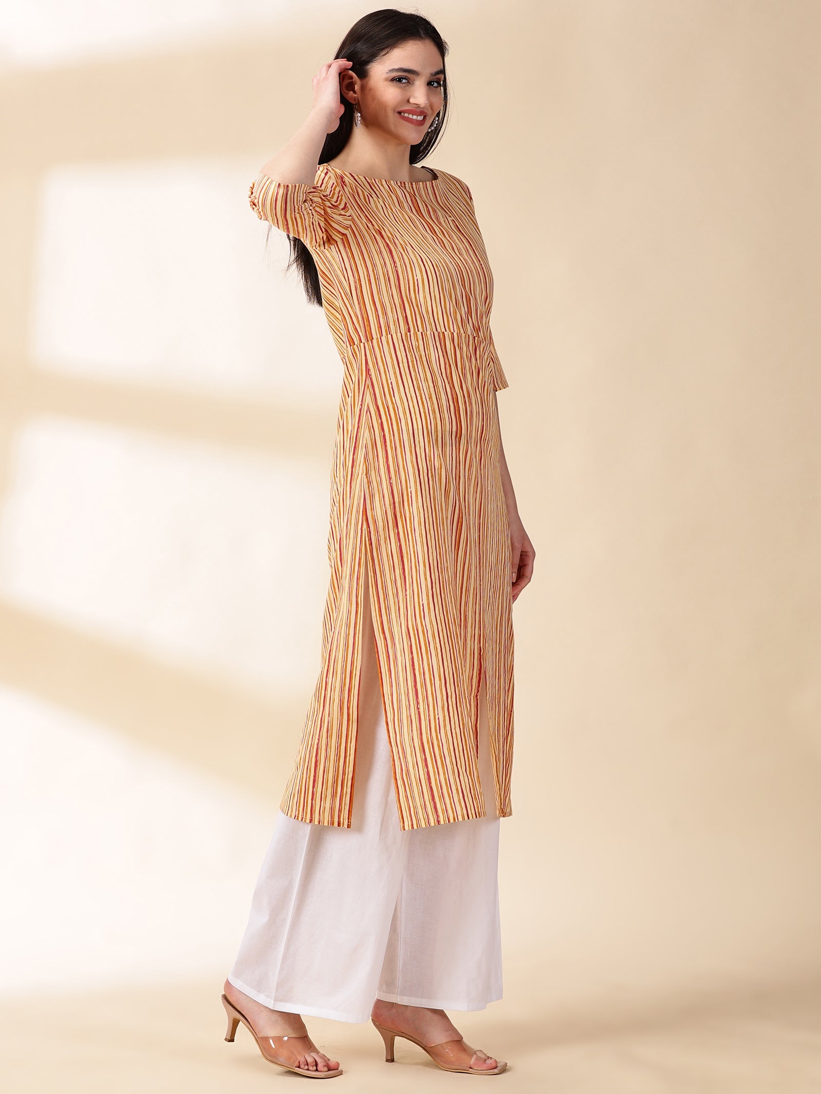 Our mustard printed straight-fit kurta, crafted in sumptuous cotton fabric features a round neckline and three-quarter sleeves. Adorned with delicate sequins accents, this elegant style is ideal for elevated everyday wear.
