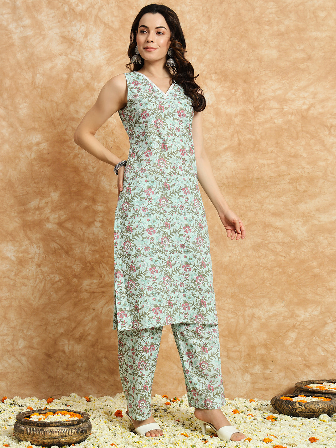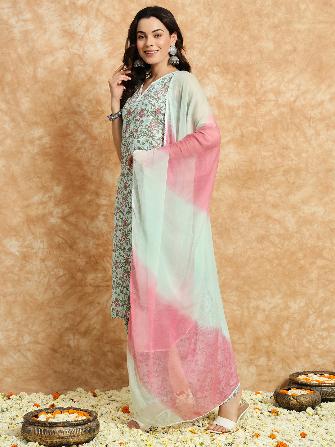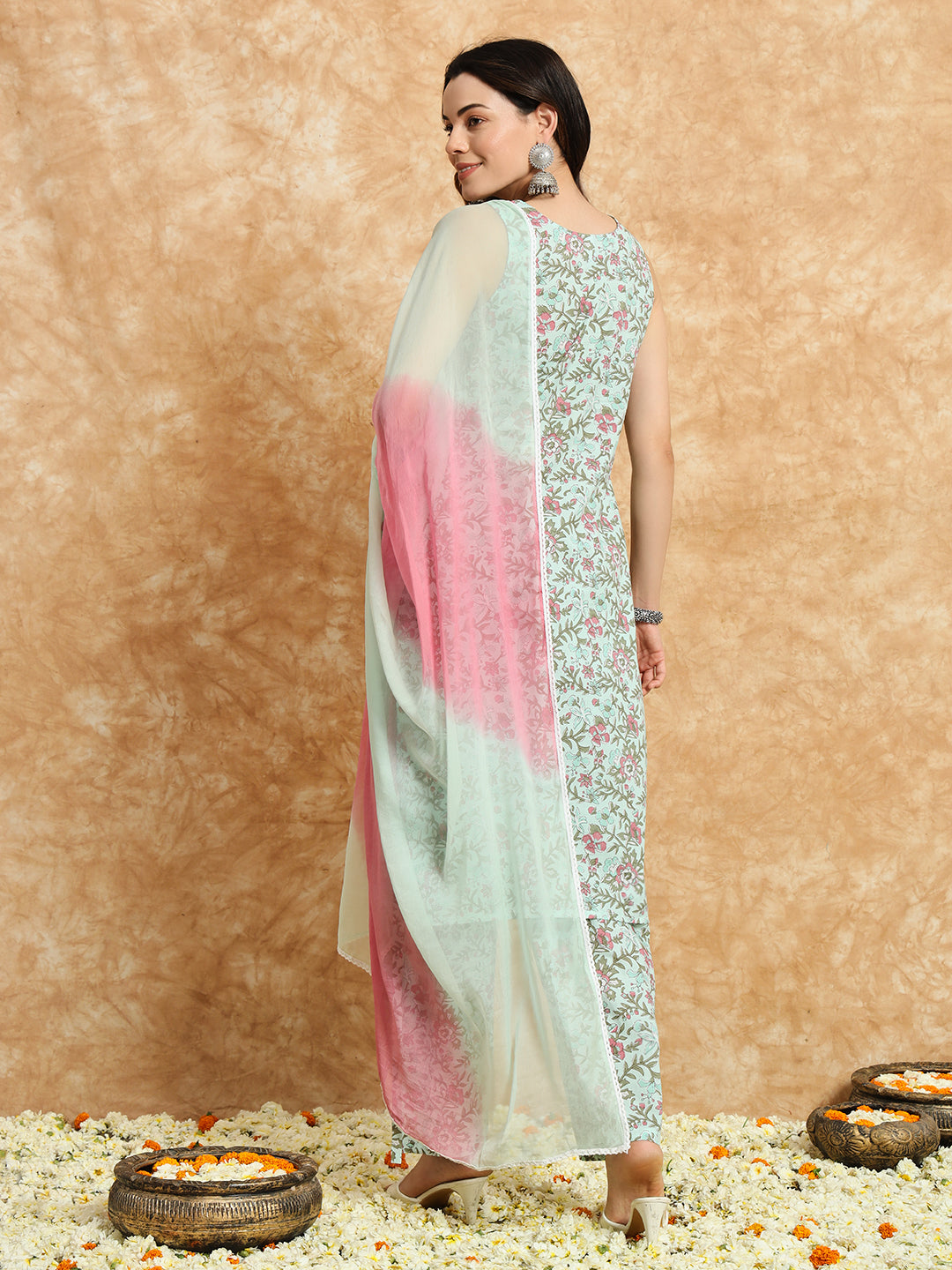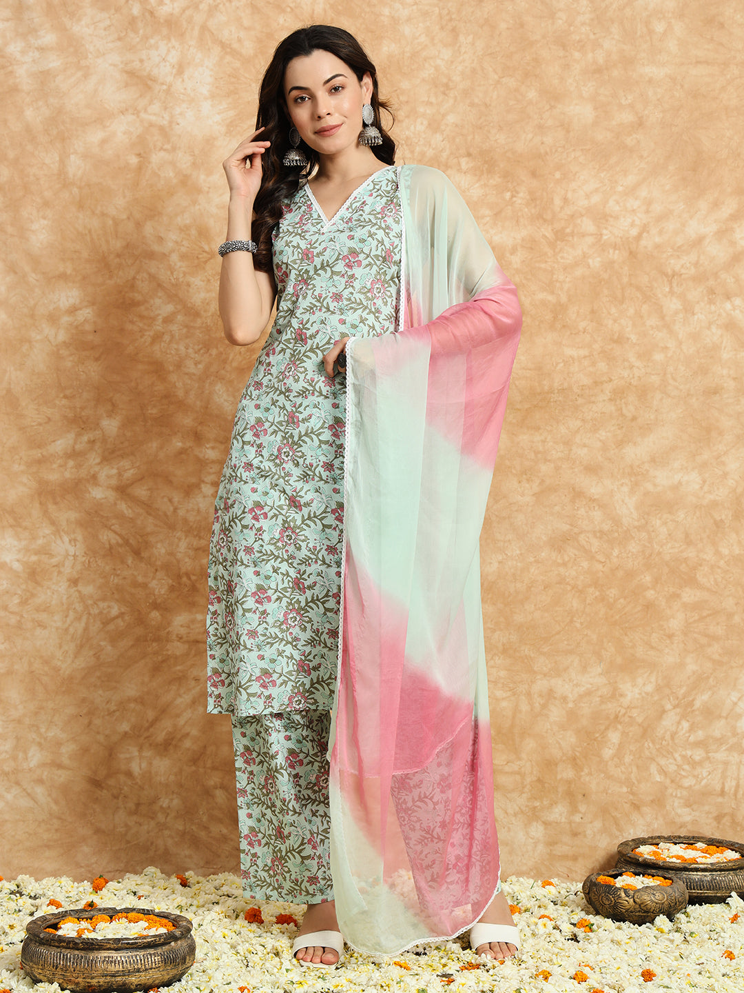 Our 3-piece blue printed cotton suit set features a floral print straight-fit kurta with a V-neckline . Complemented with trousers with a partially elasticated waistband, and a dupatta. Adorned with floral prints, lace detailing, and fabric-trim accents, this style is perfect for elevated everyday wear.