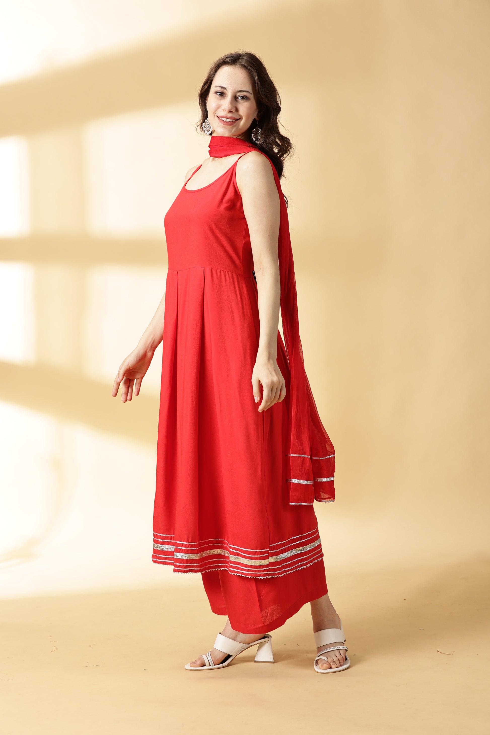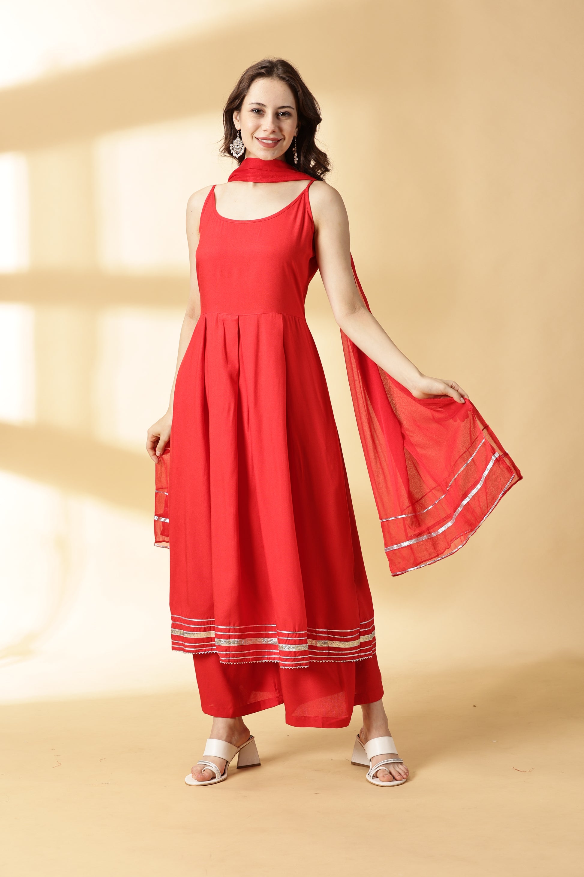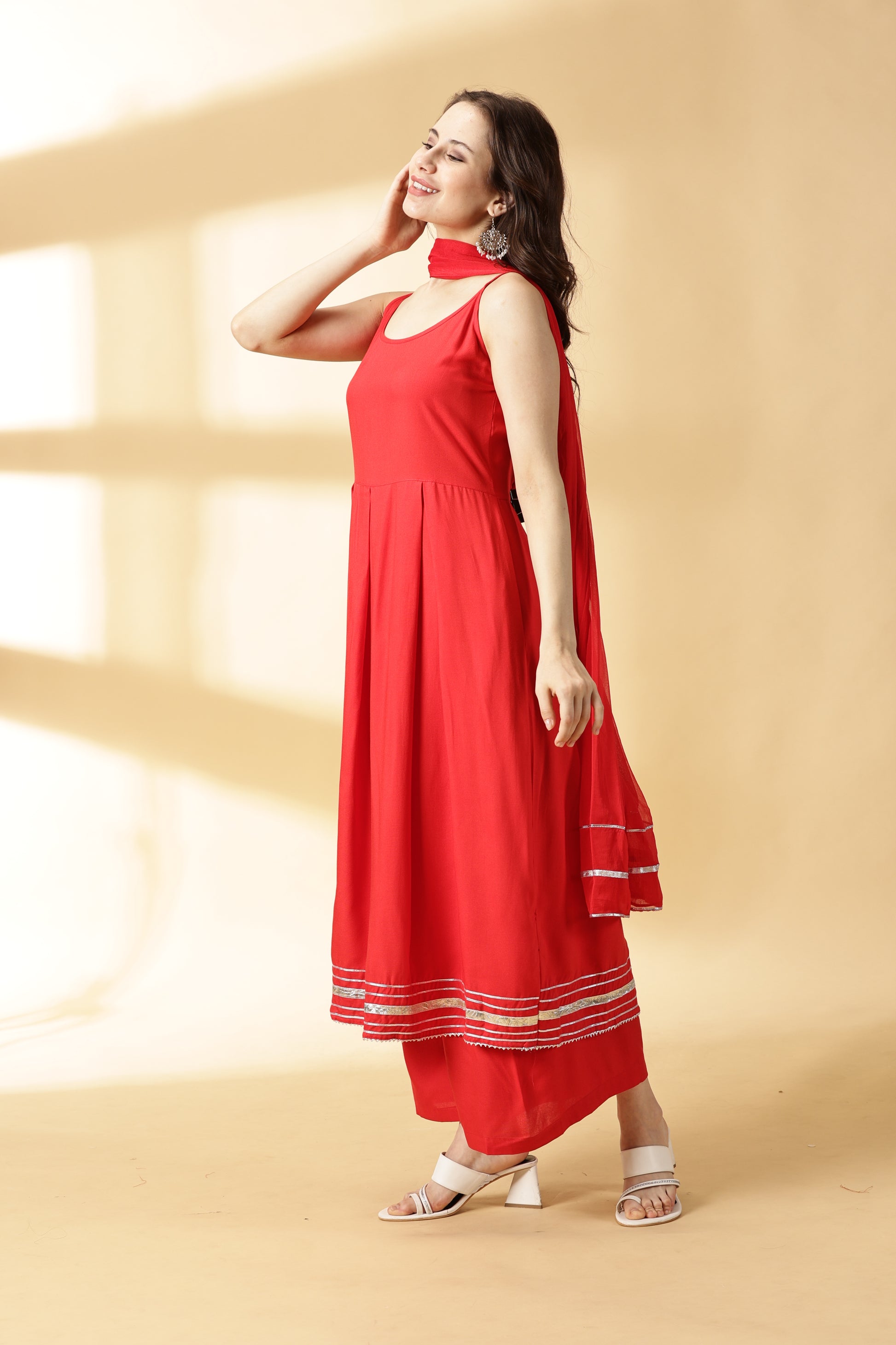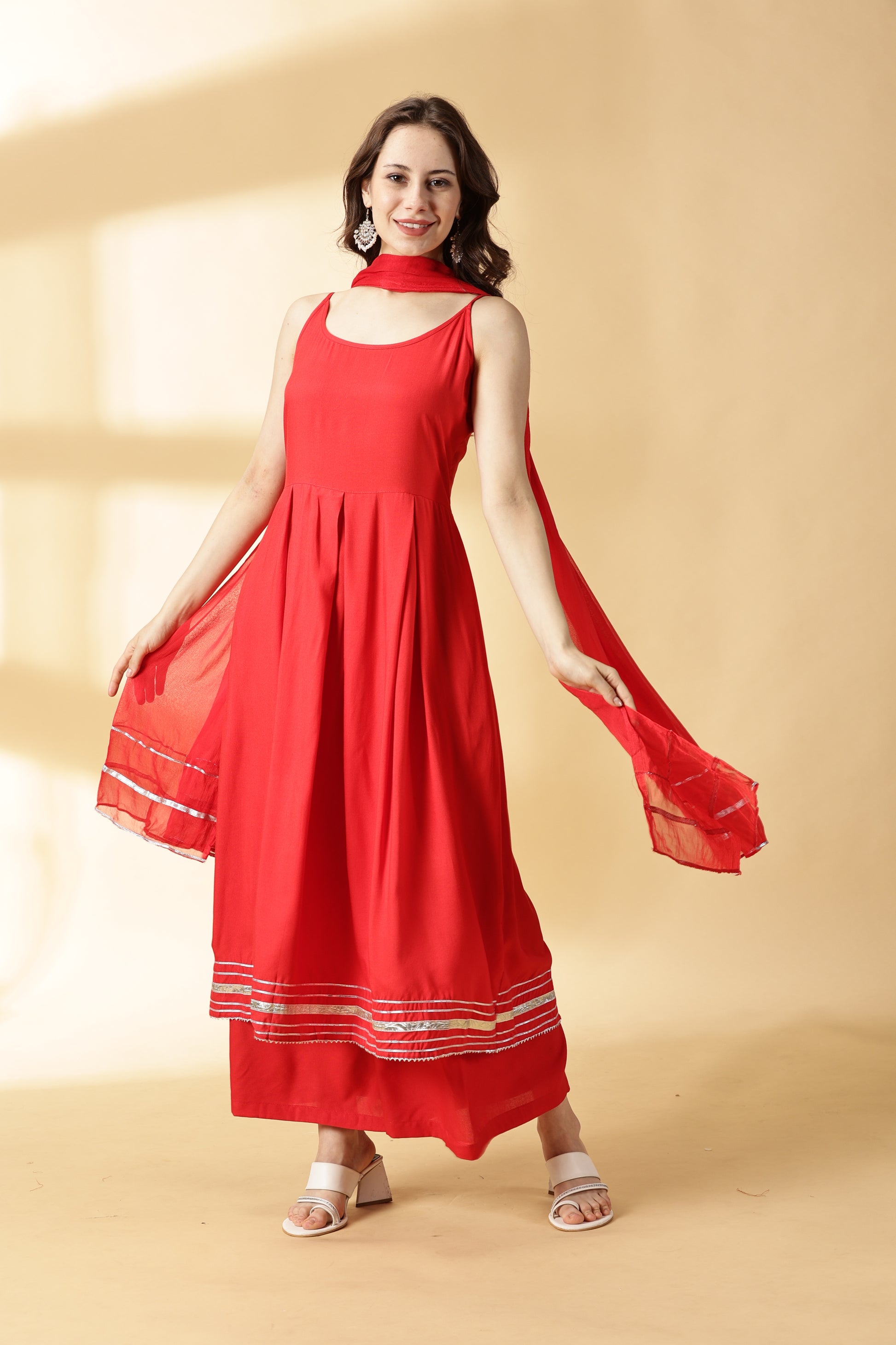 Our 3-piece red reyon kurta set features a Anarkali kurta with a round neckline and sleeveless. Complemented with a palazzos with a partially elasticated waistband and roomy pockets, and dupatta . Adorned with Gota Patti, this style is perfect for casual outings.