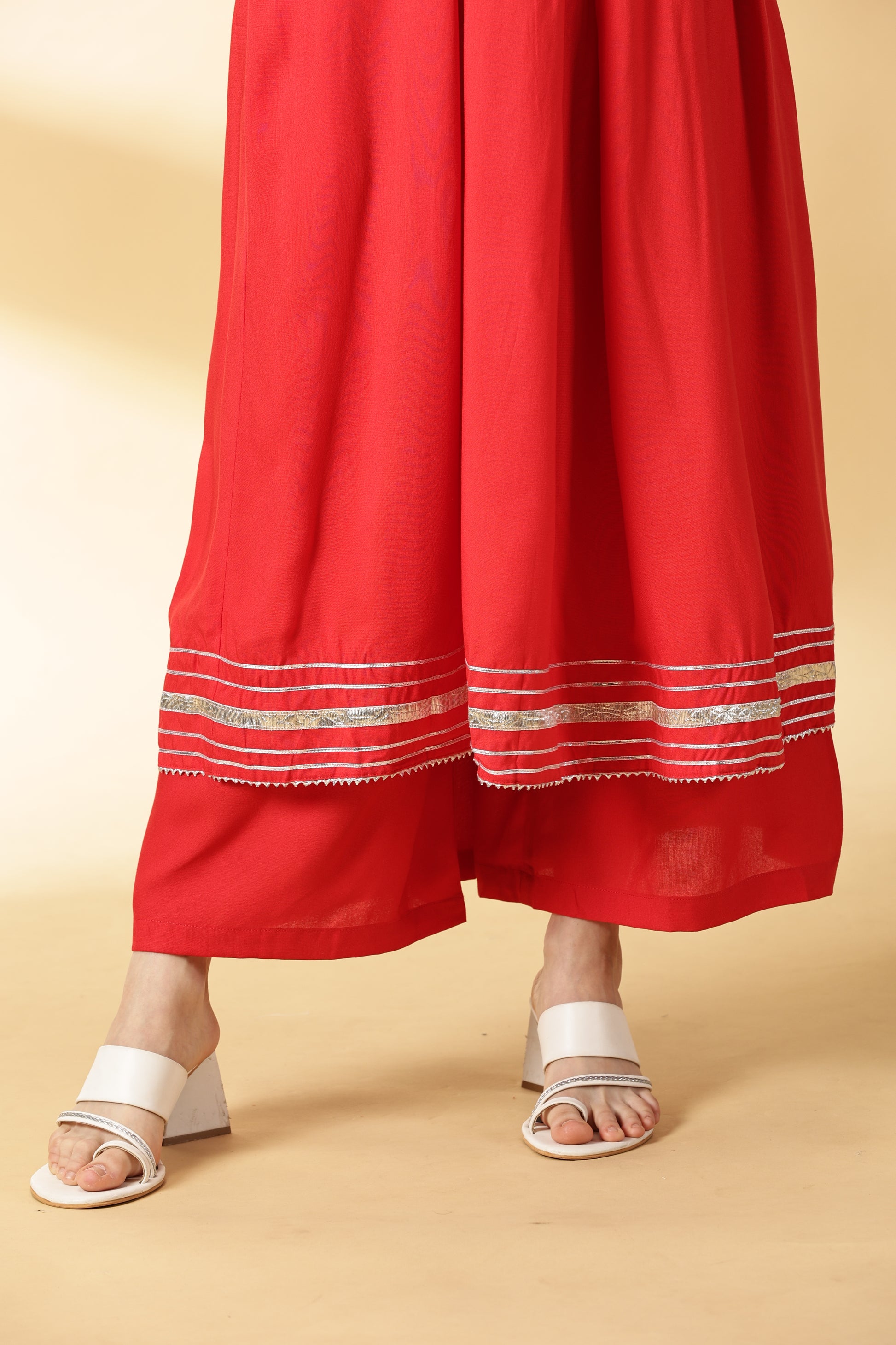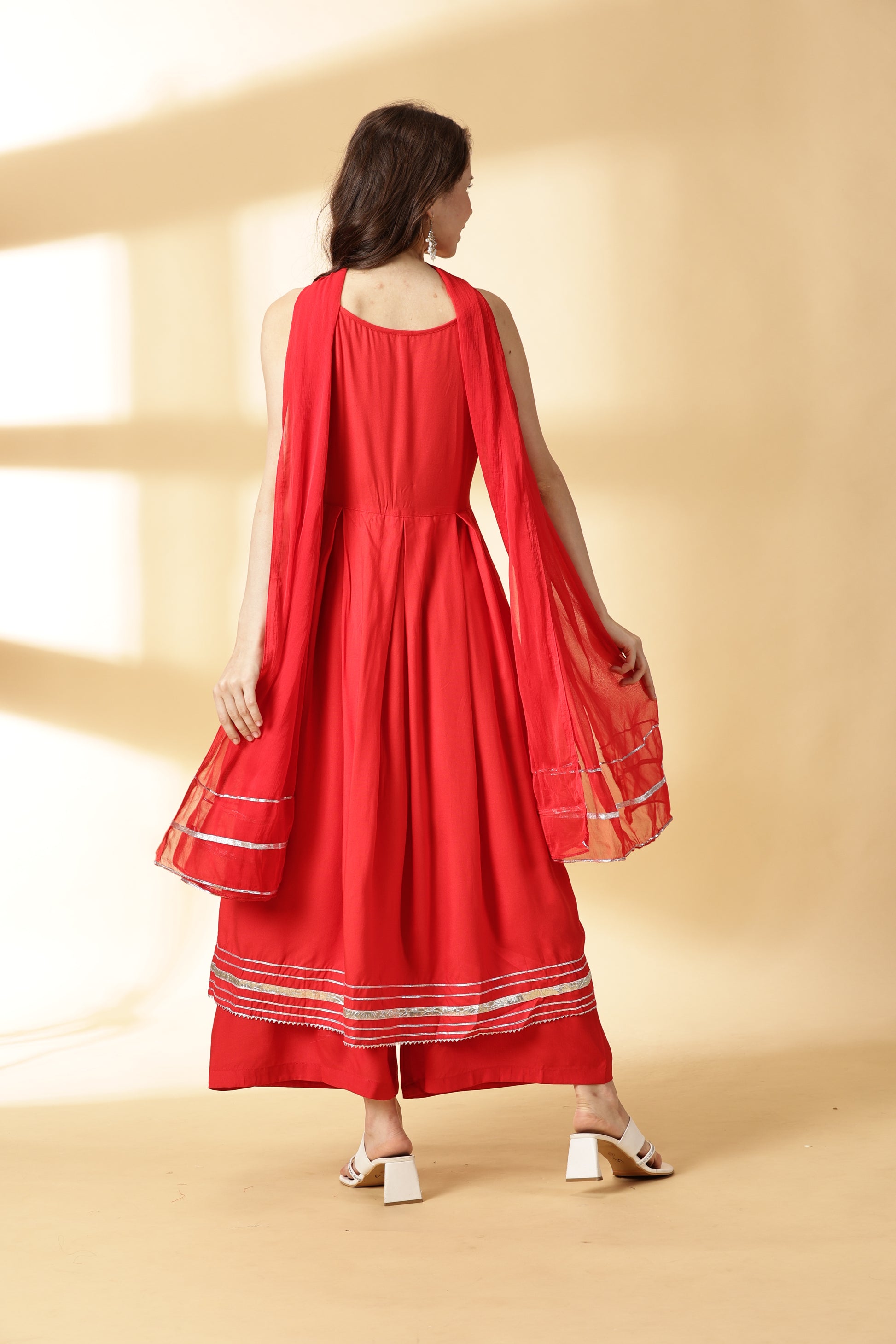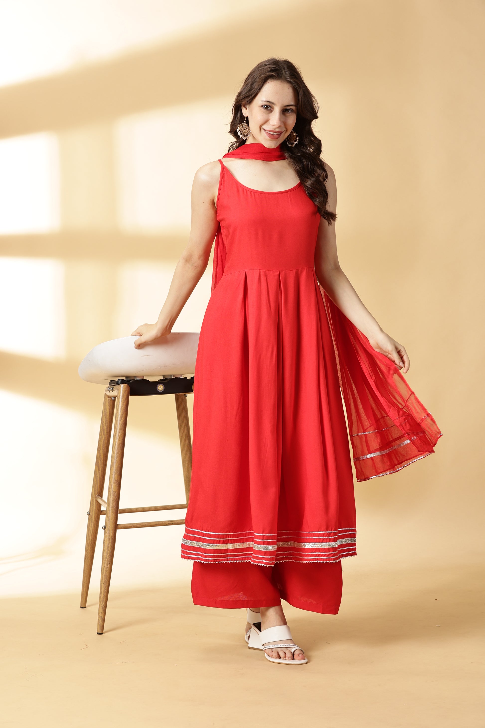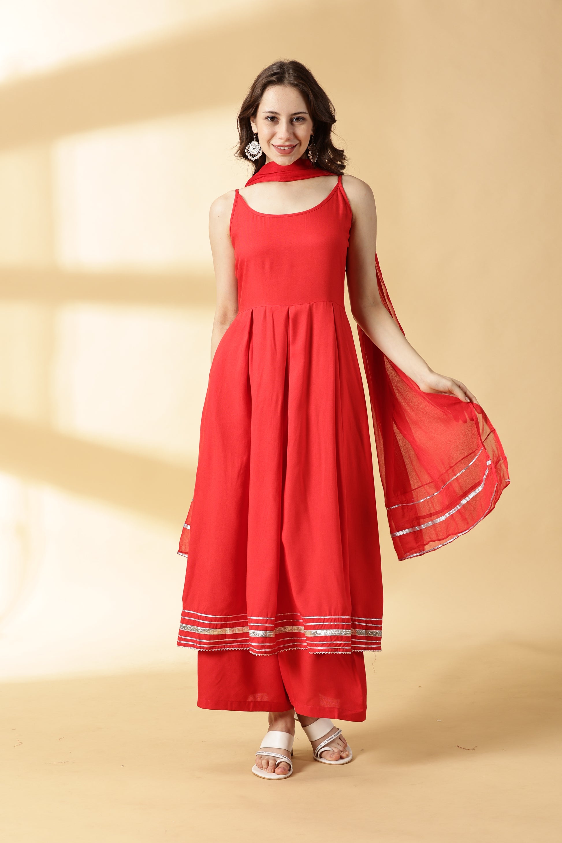 Our 3-piece red reyon kurta set features a Anarkali kurta with a round neckline and sleeveless. Complemented with a palazzos with a partially elasticated waistband and roomy pockets, and dupatta . Adorned with Gota Patti, this style is perfect for casual outings.