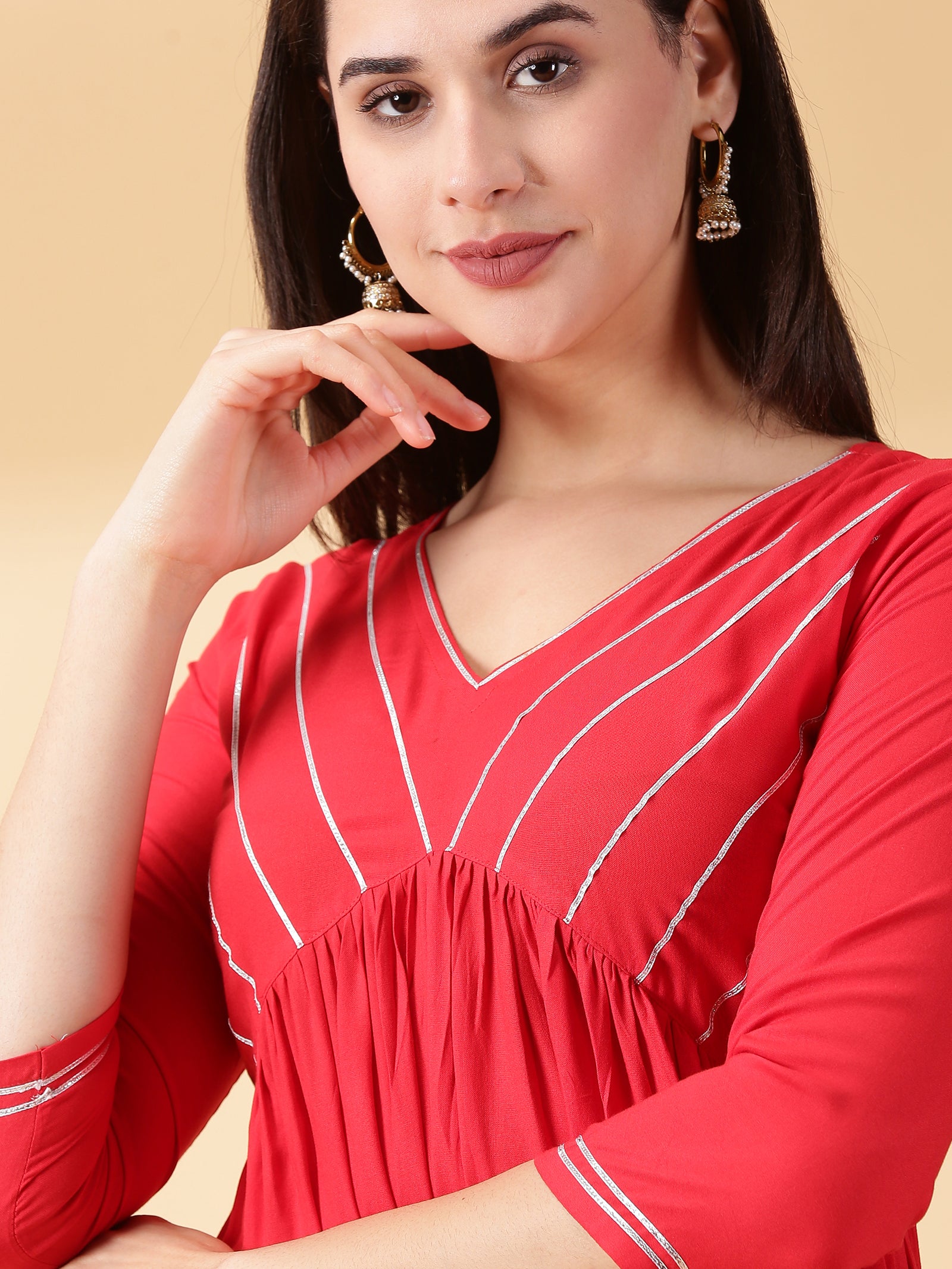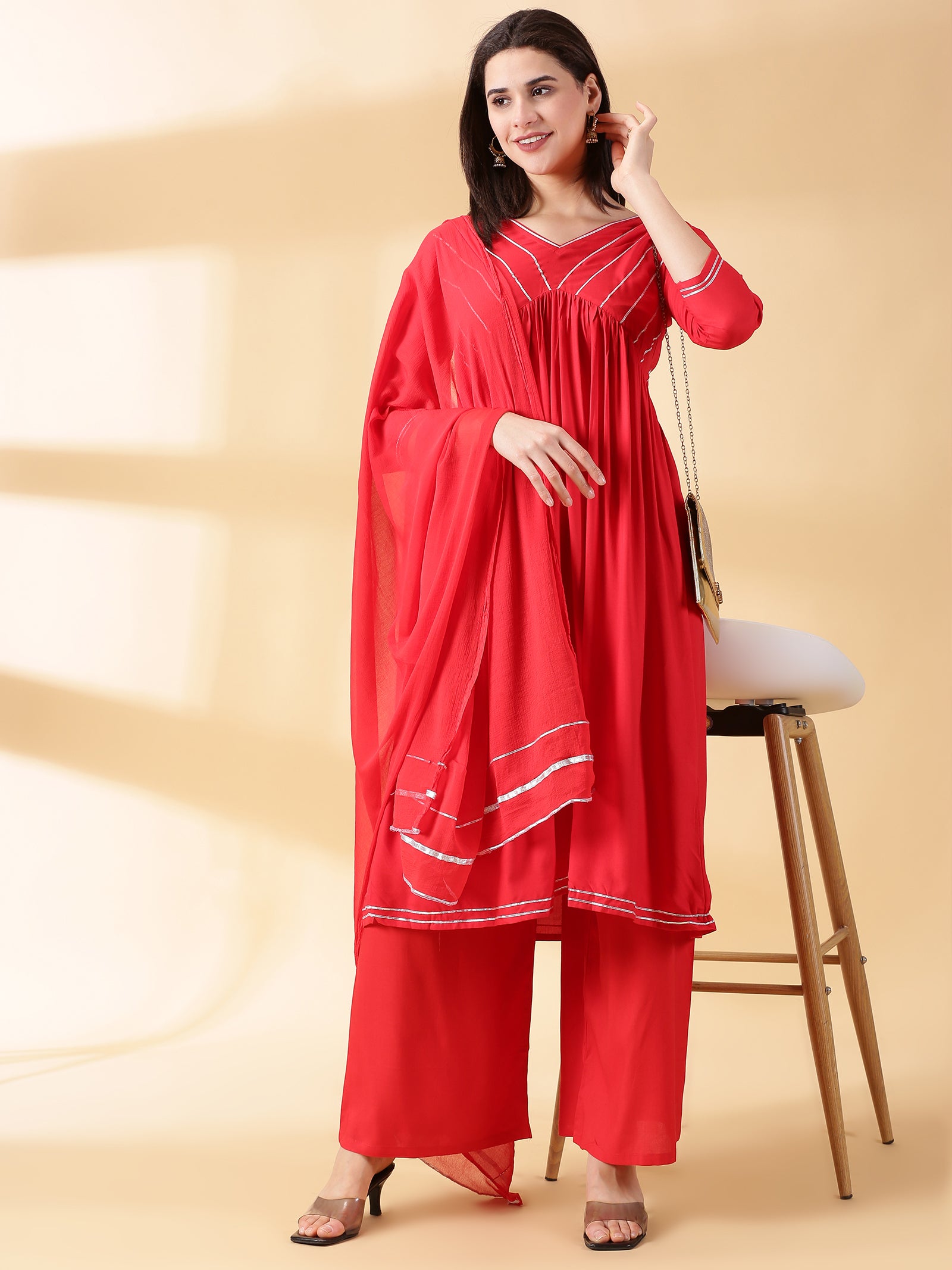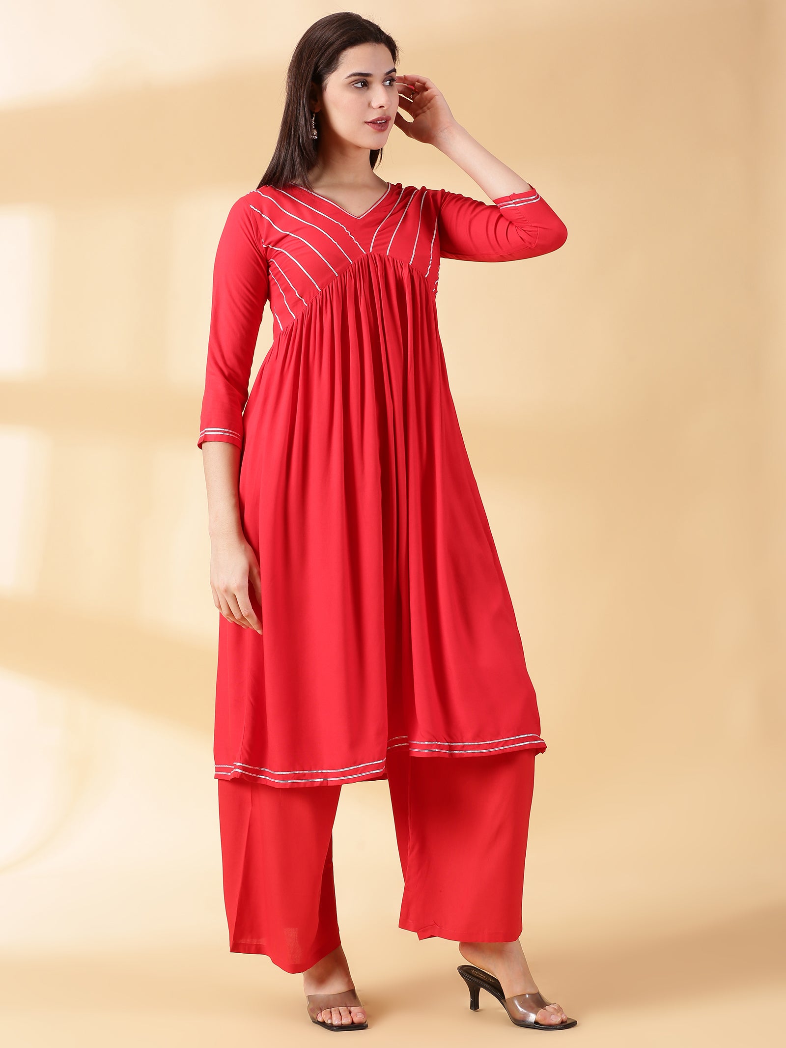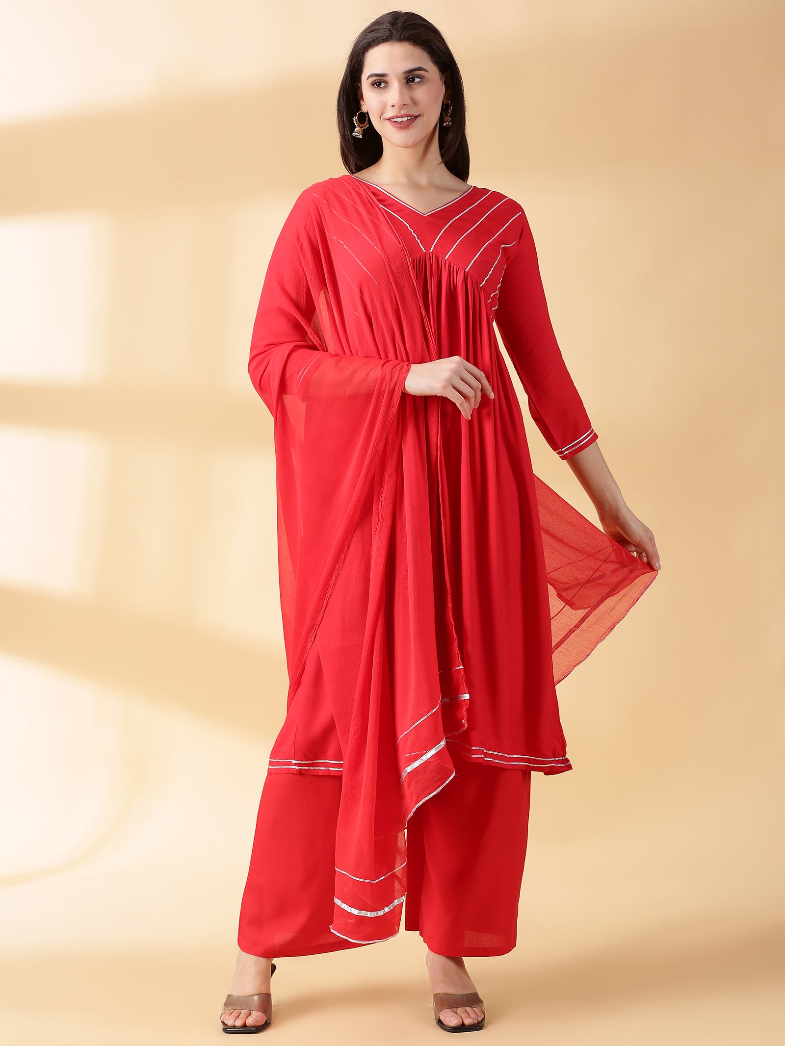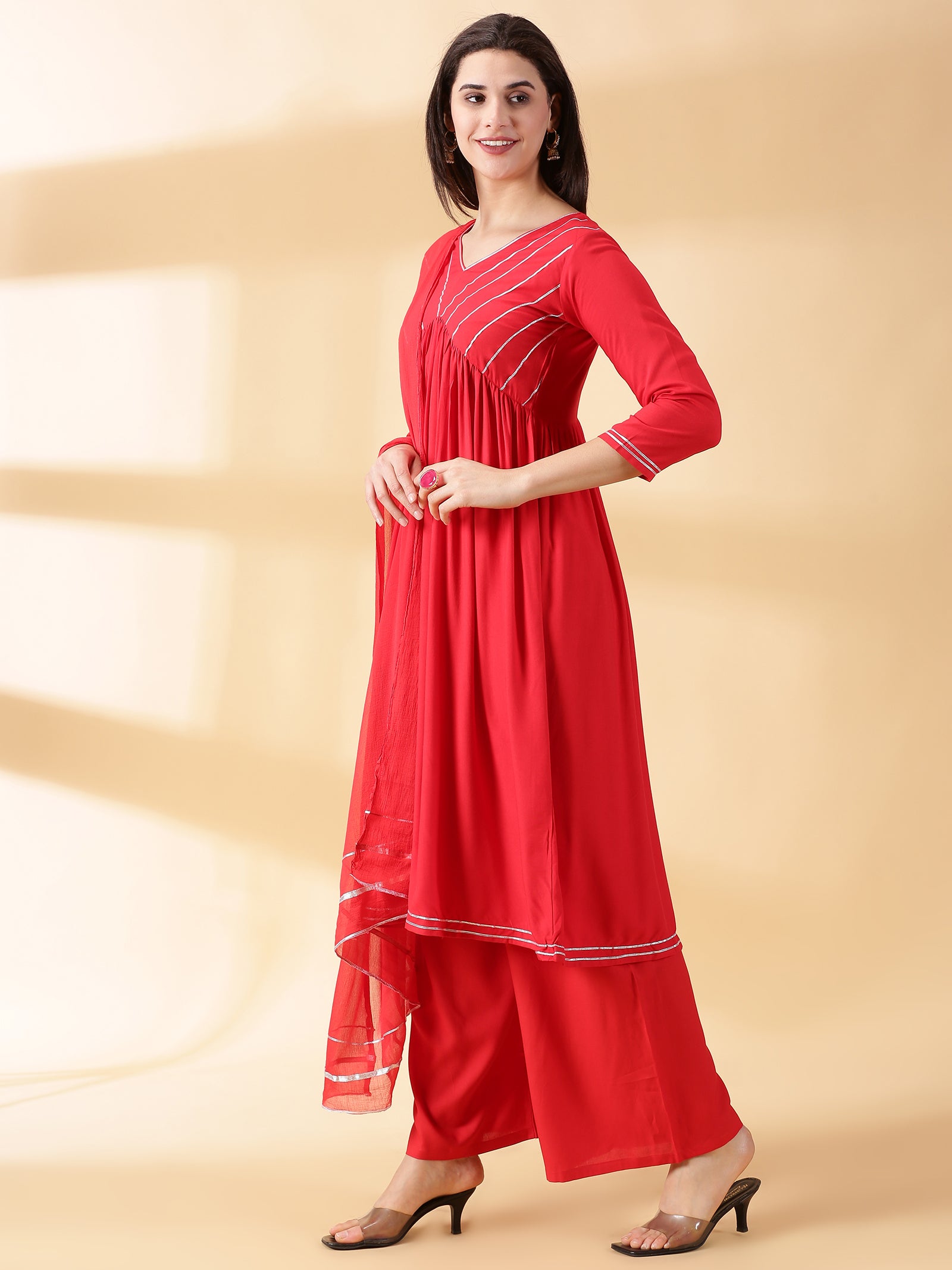 Our 3 piece red reyon alia cut kurta set features .v-neckline and three quarter sleeves. Complemented with palazzos with a partially elasticated waistband and dupatta. Adorned with gota patti detailing, this style is perfect for casual outings.