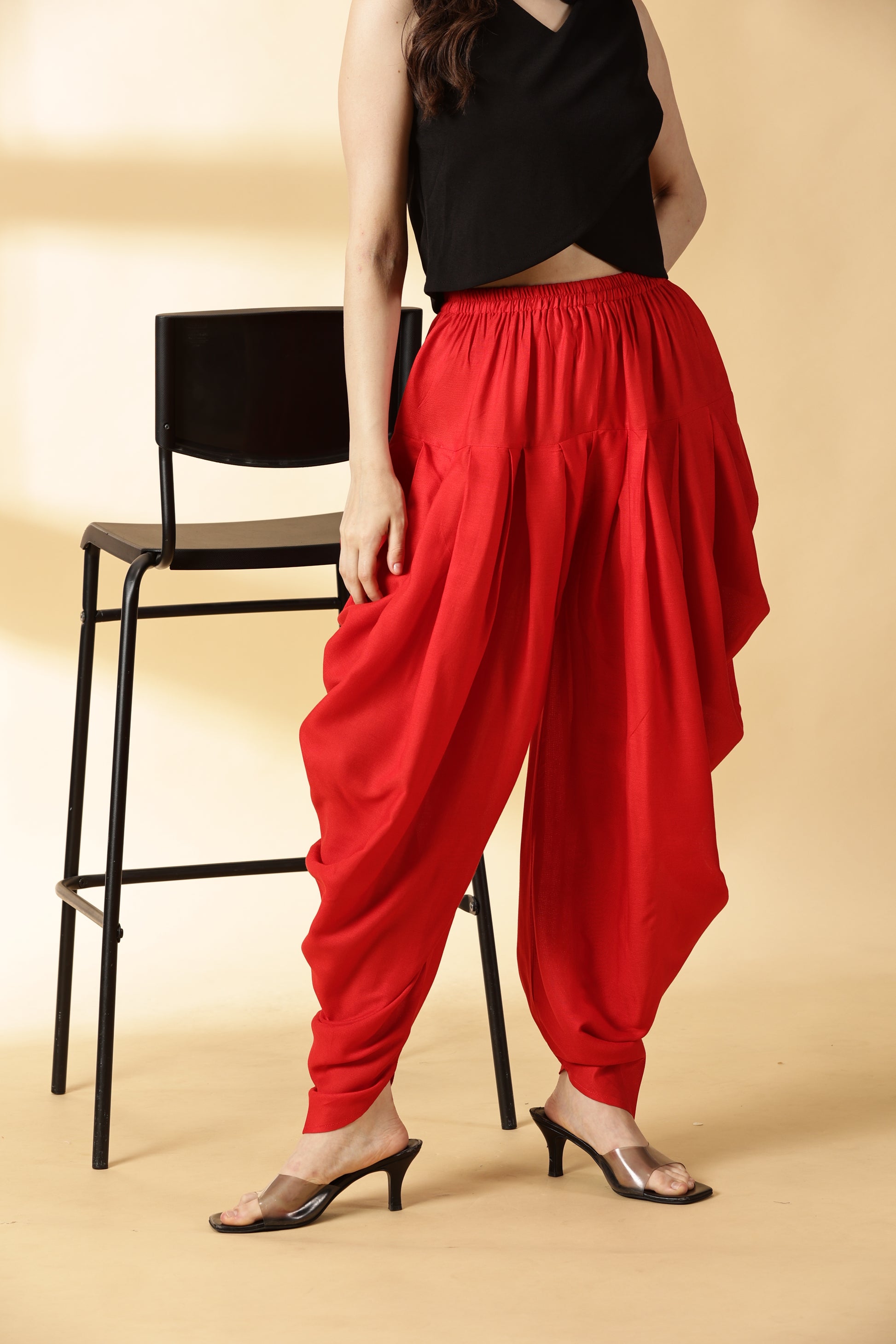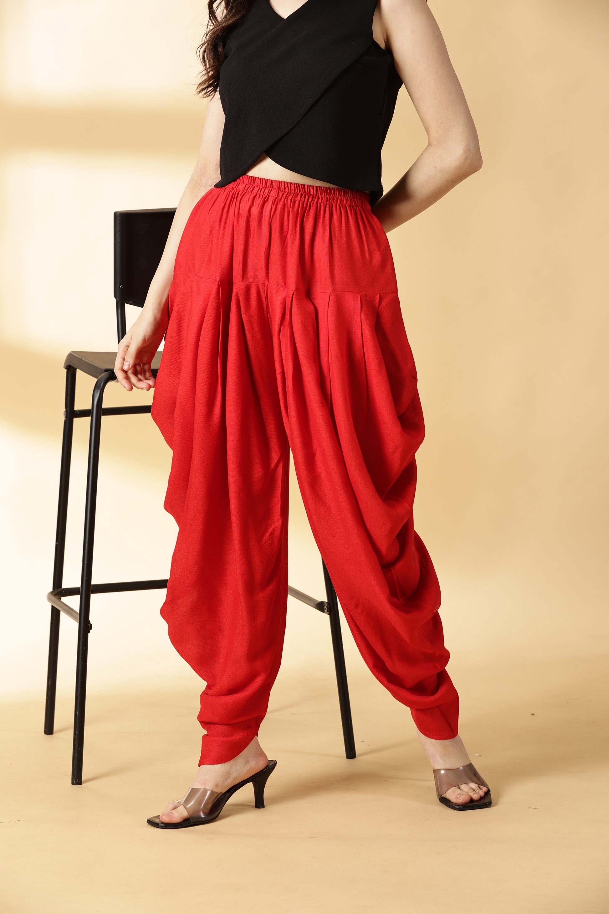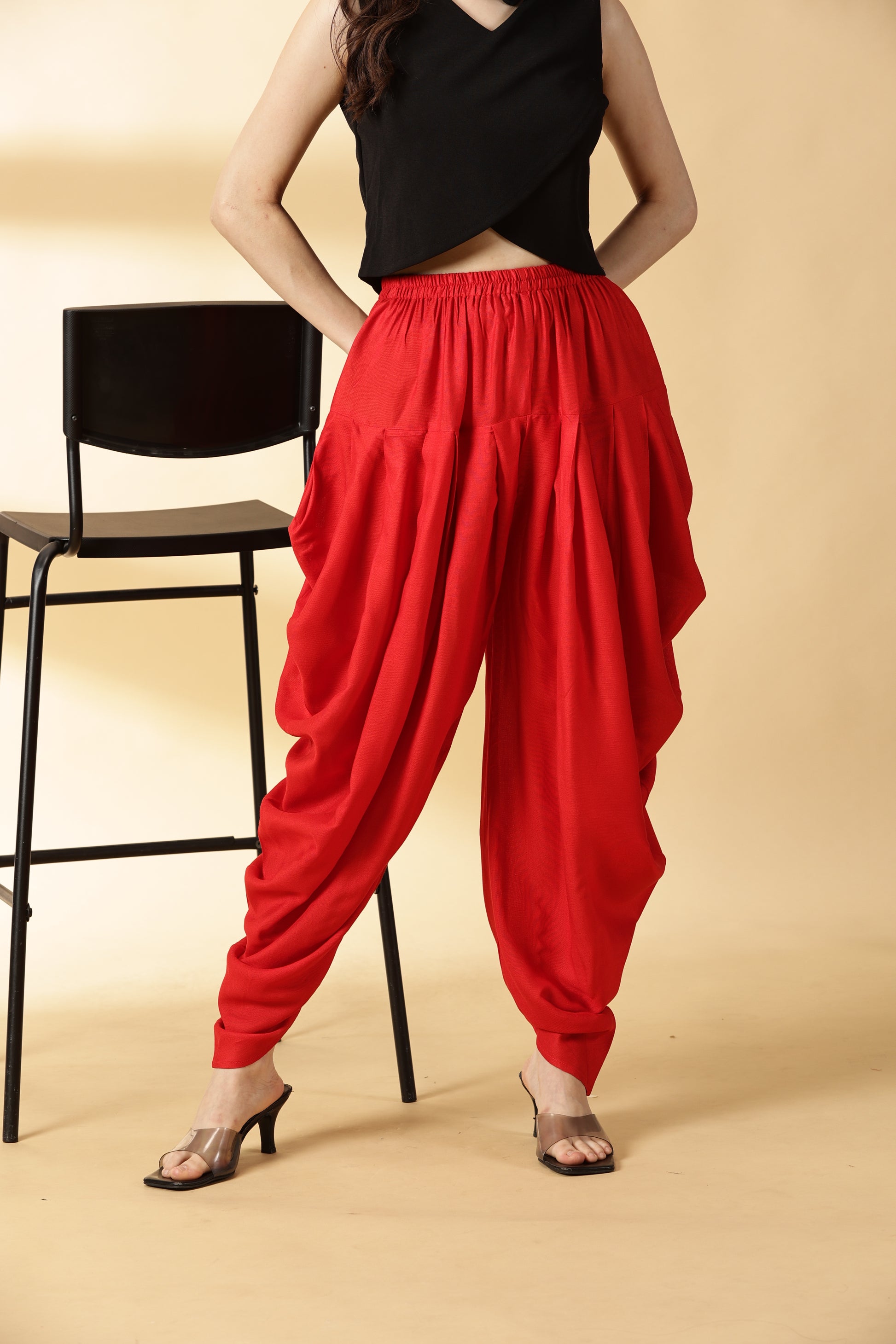 Incredibly stylish and comfortable,dhoti perfect bottom wear, especially during the summer season.carfted out of reyon fabric these red pleated dhoti bottom hem regular fit, and elasticated waist provides the utmost comfort.