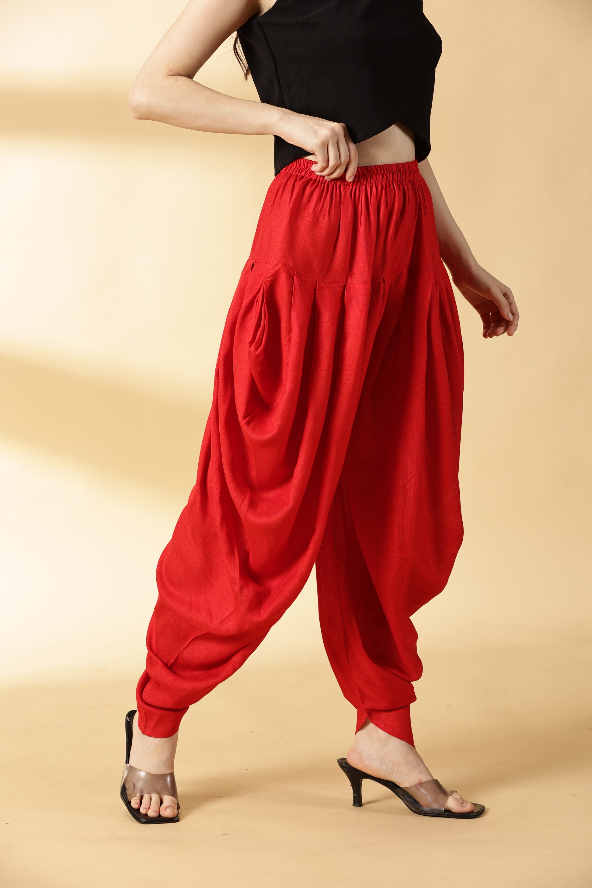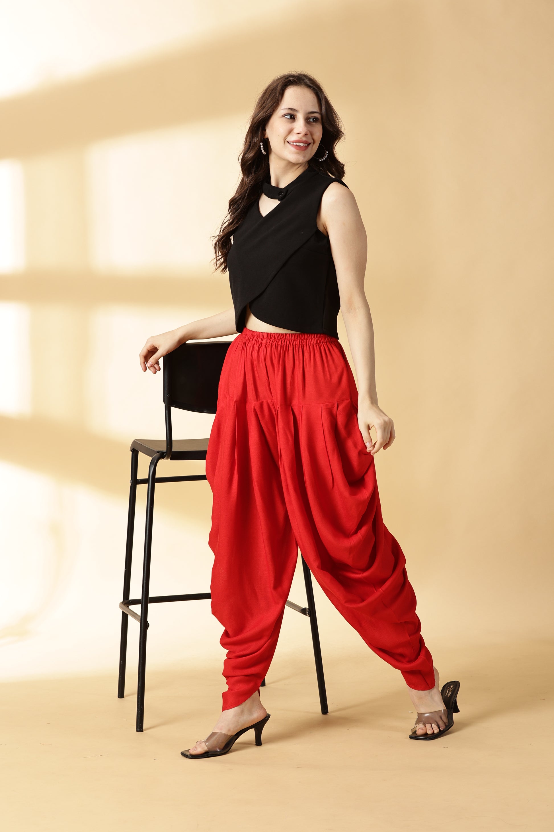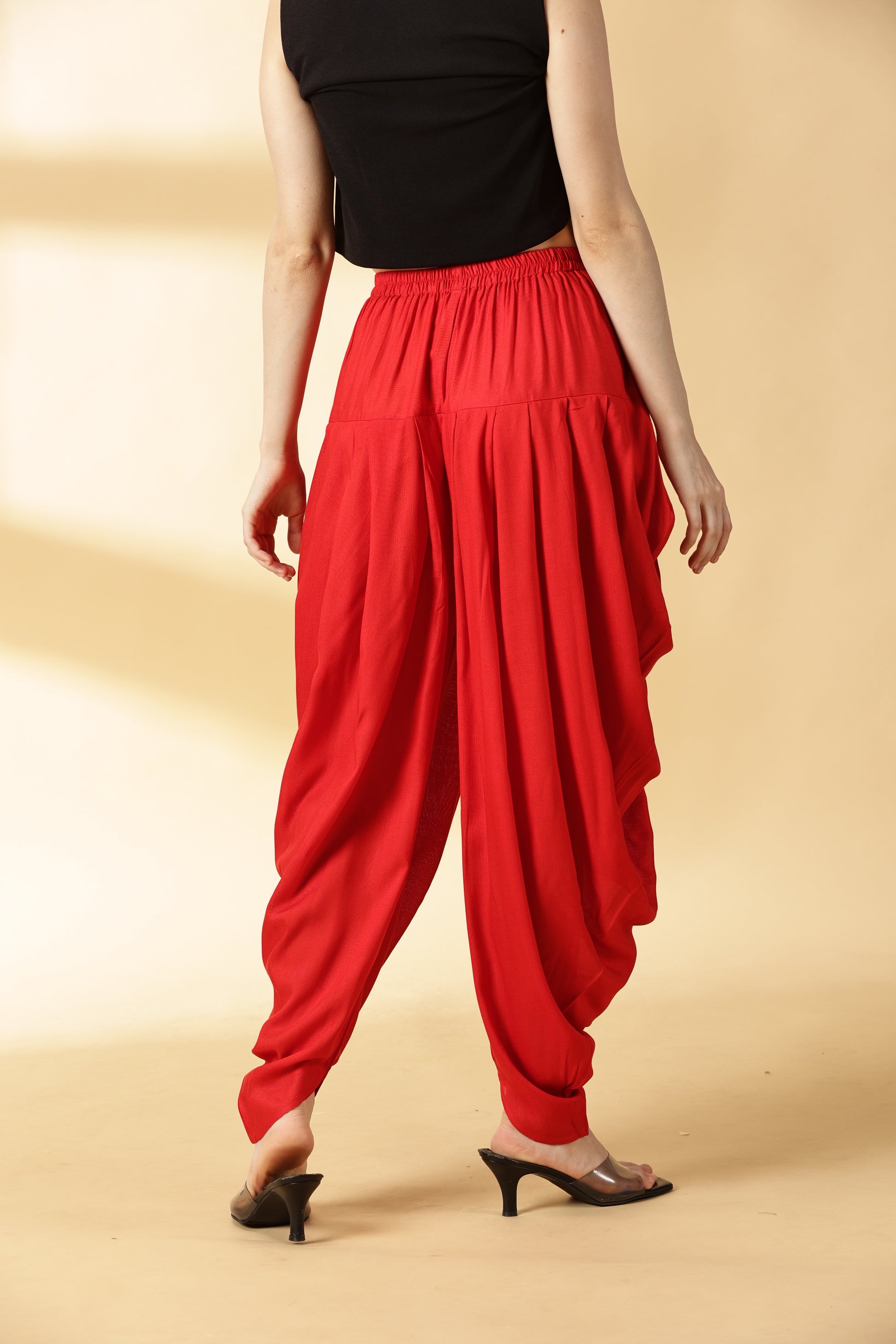 Incredibly stylish and comfortable,dhoti perfect bottom wear, especially during the summer season.carfted out of reyon fabric these red pleated dhoti bottom hem regular fit, and elasticated waist provides the utmost comfort.