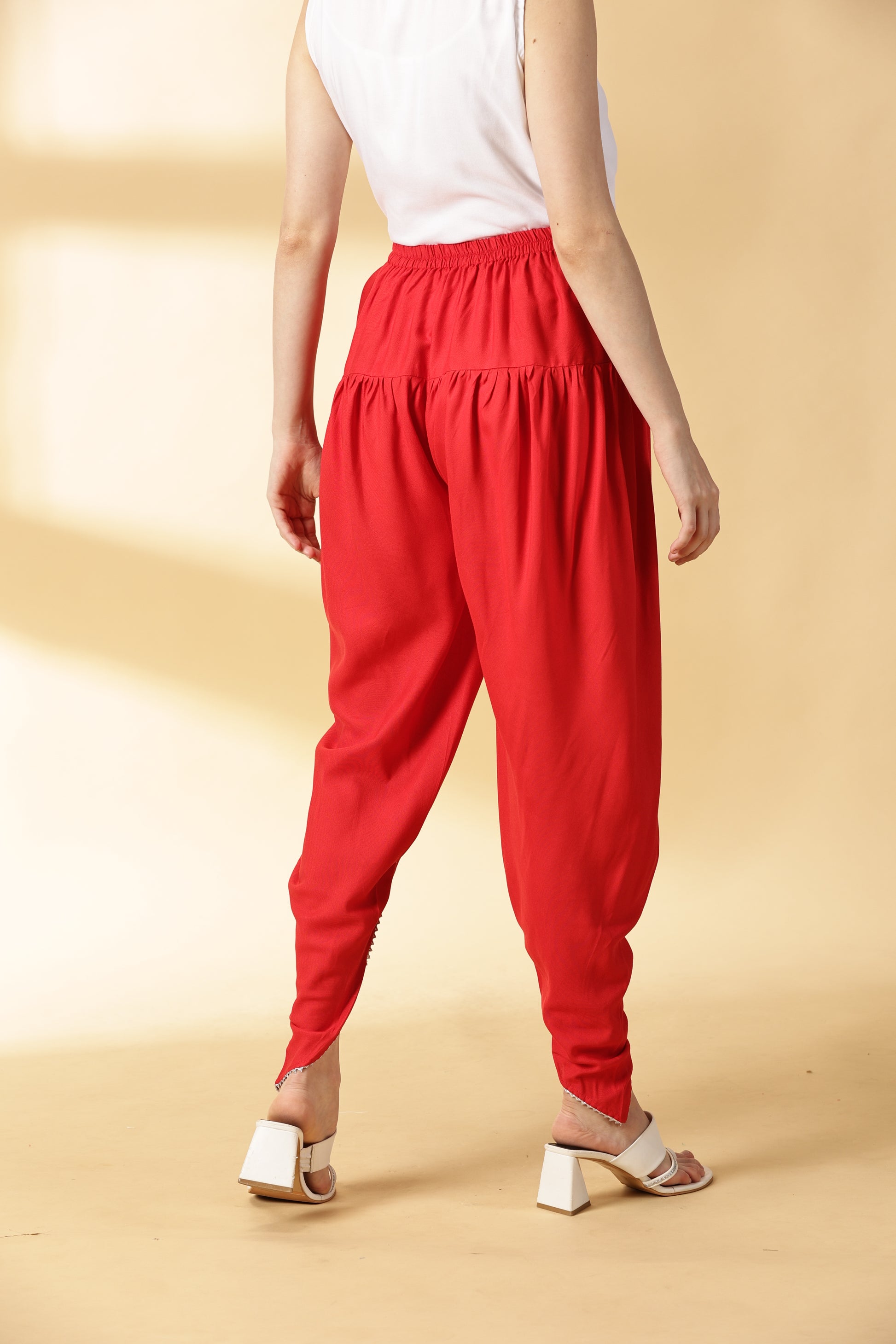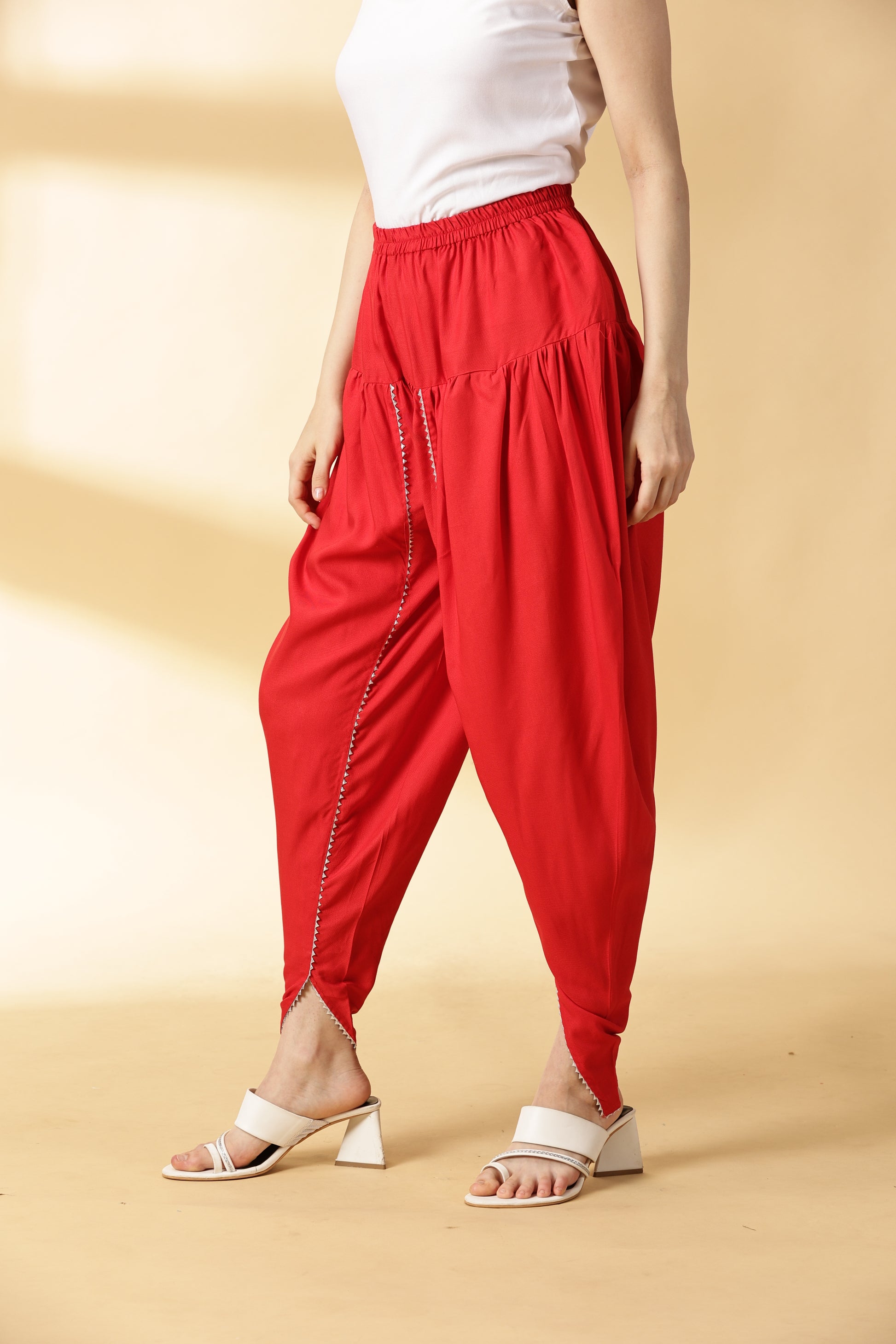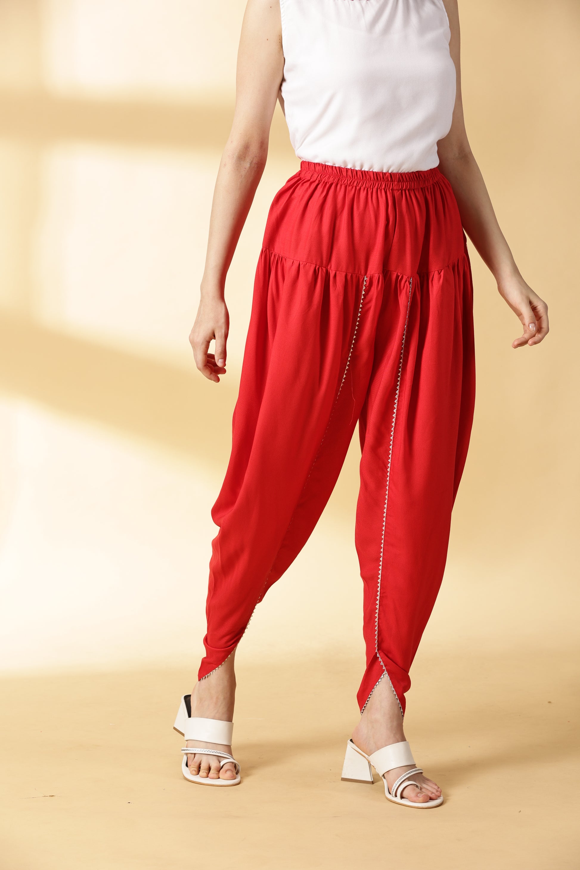 Incredibly stylish and comfortable, dhoti is perfect bottom wear, especially during the summer season carfted out of reyon fabric, these red pleated dhoti bottom hems, regular fit, and elasticated waist provide the utmost comfort.