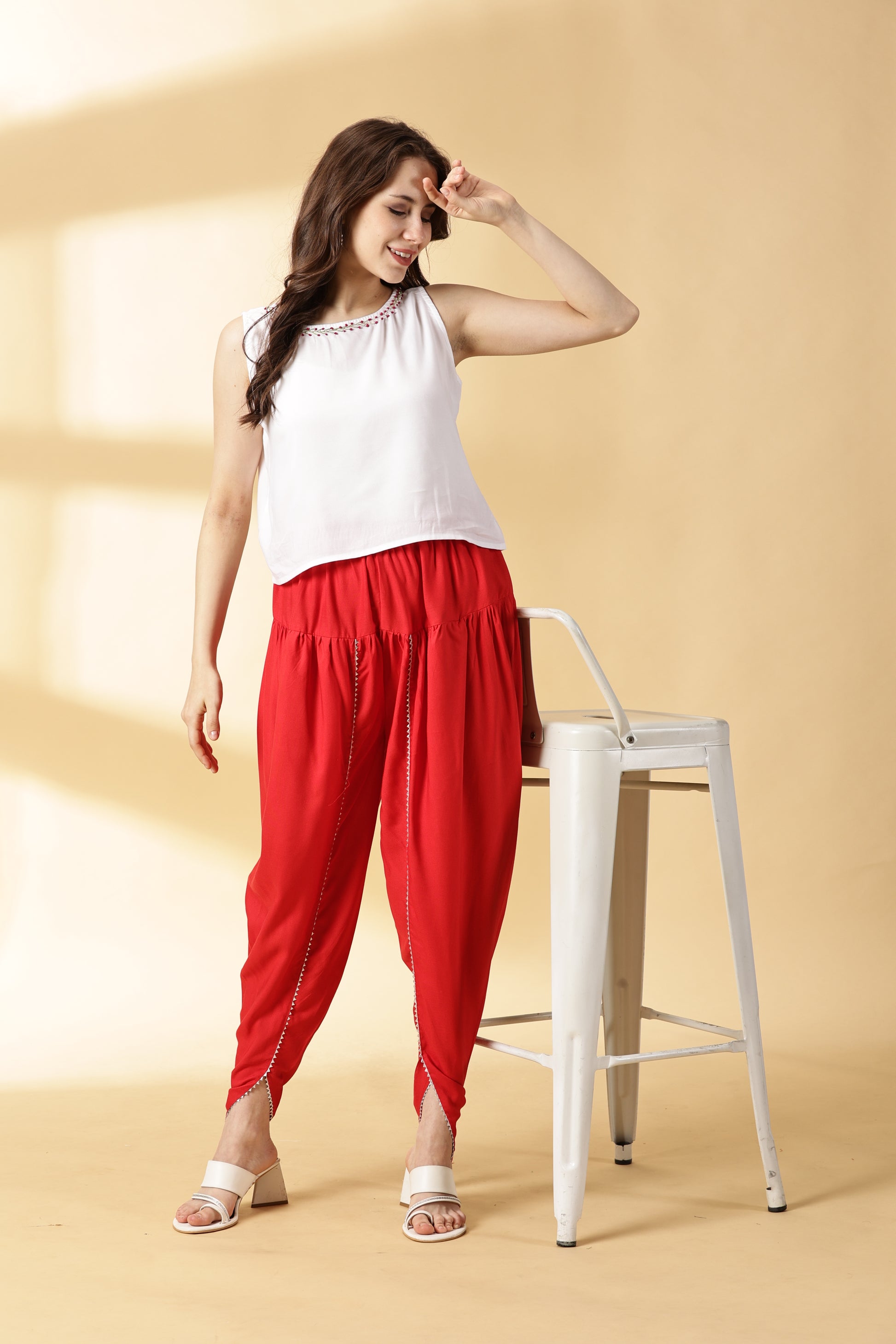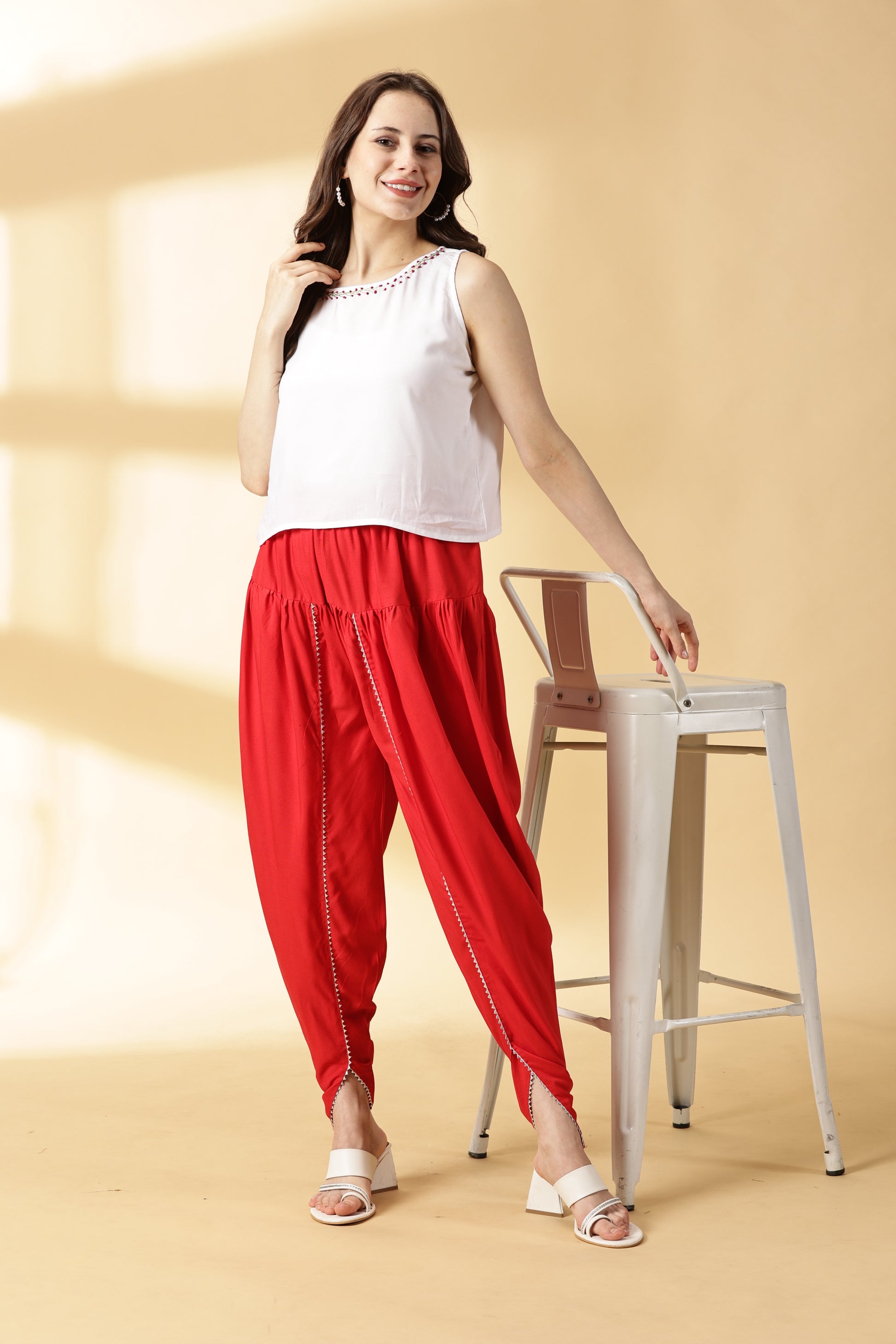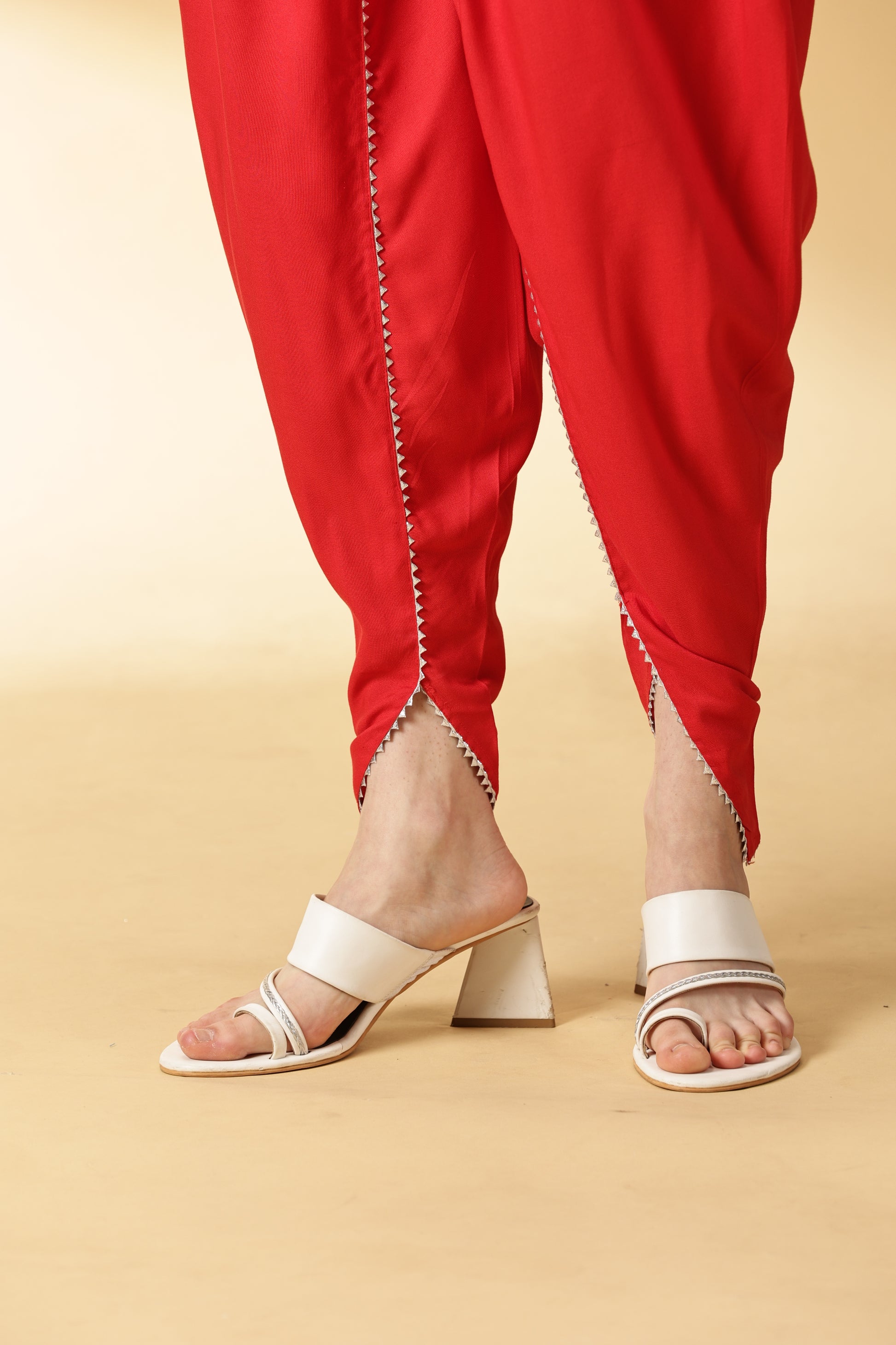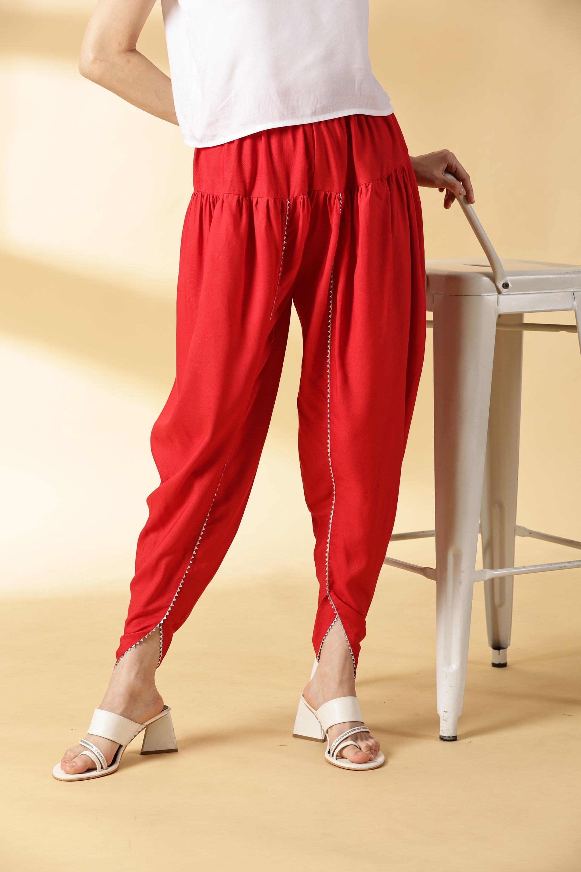Incredibly stylish and comfortable, dhoti is perfect bottom wear, especially during the summer season carfted out of reyon fabric, these red pleated dhoti bottom hems, regular fit, and elasticated waist provide the utmost comfort.