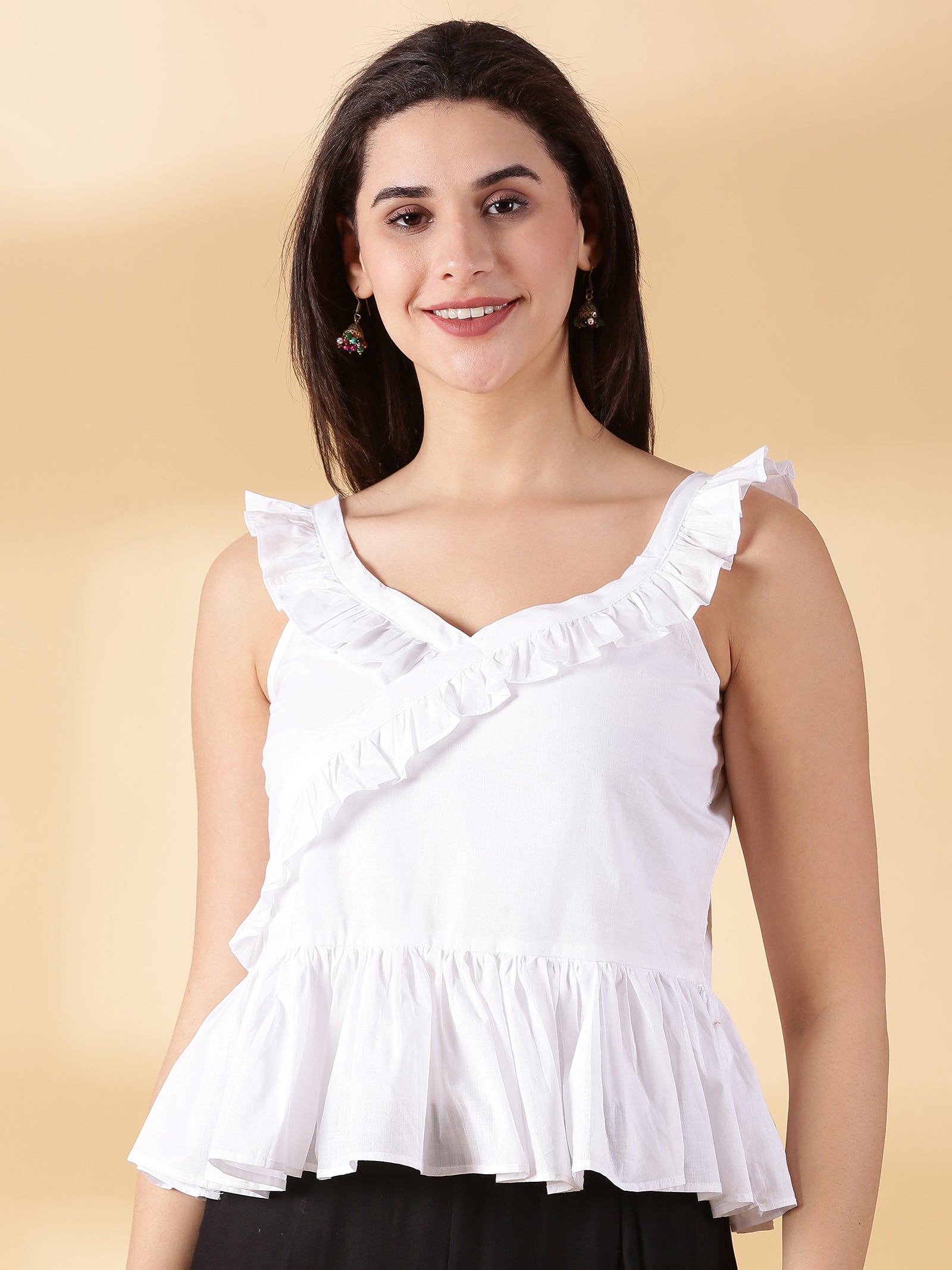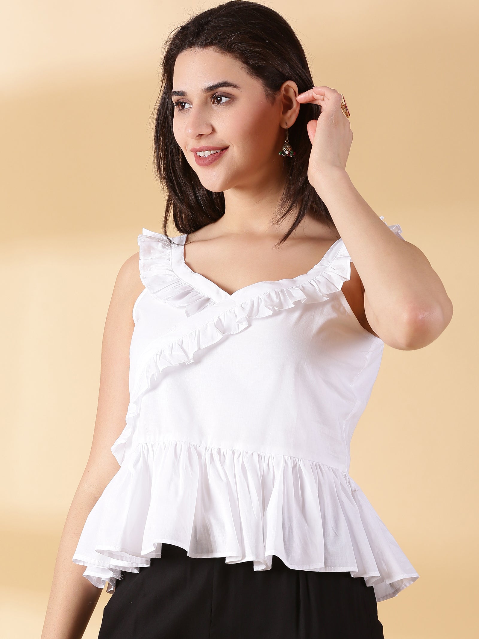 Our white solid cotton ruffled top crafted in soft cotton fabric features anotched neckline, sleeveless and stright hemline. Adorned with gilded, this graceful style isideal for casual outings.
