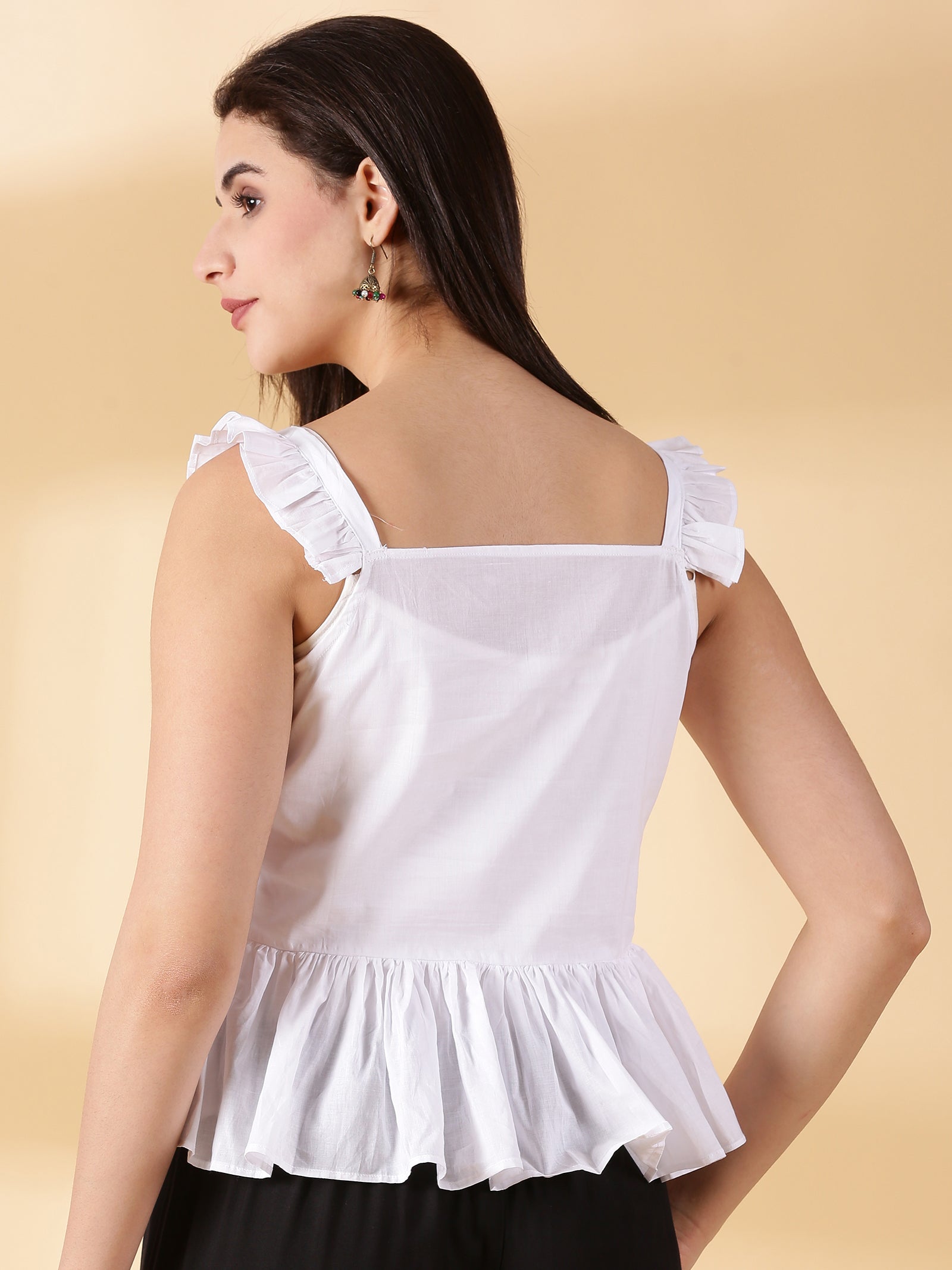 Simran The White Cotton Ruffled Top is soft and fits well.