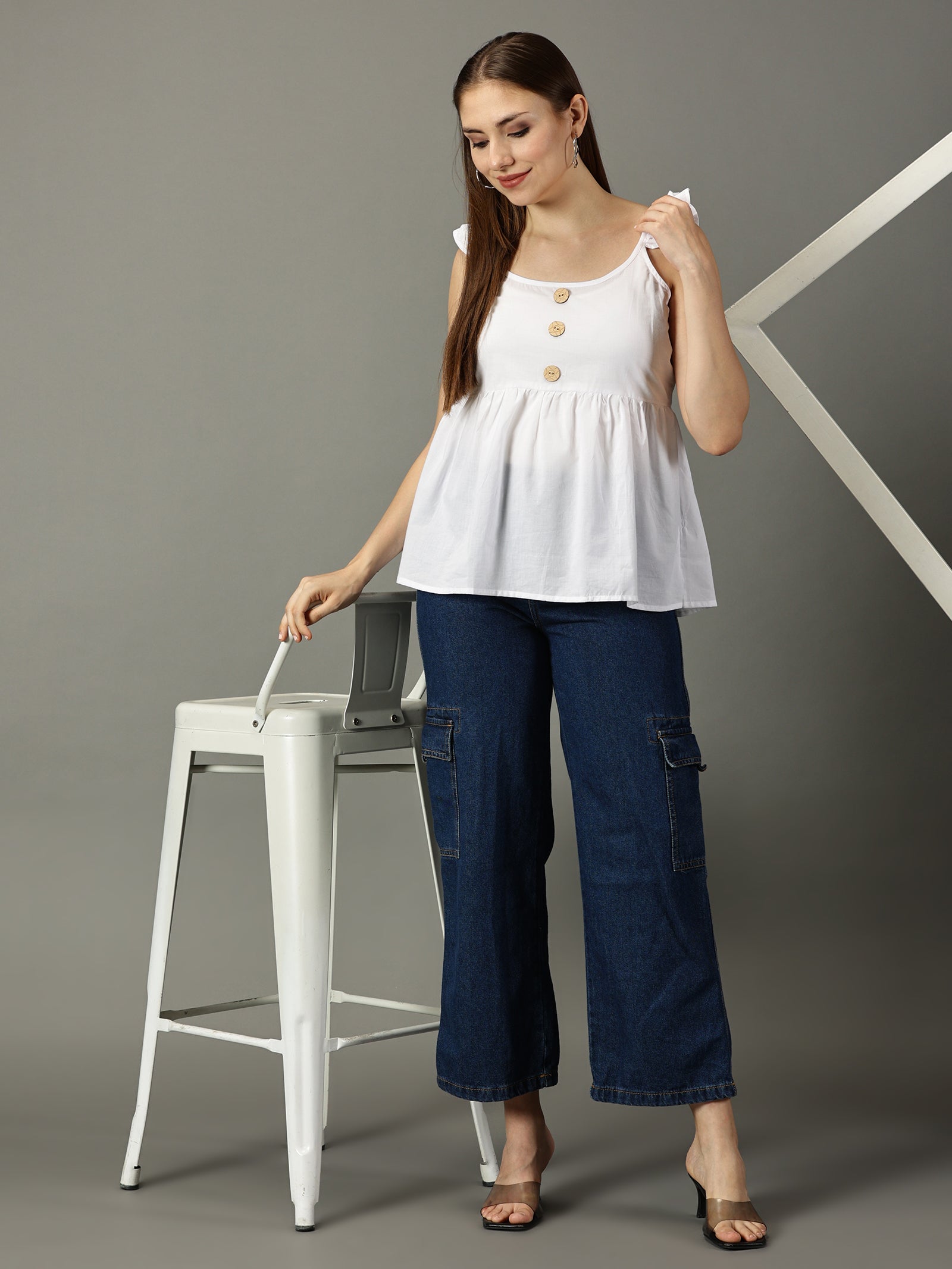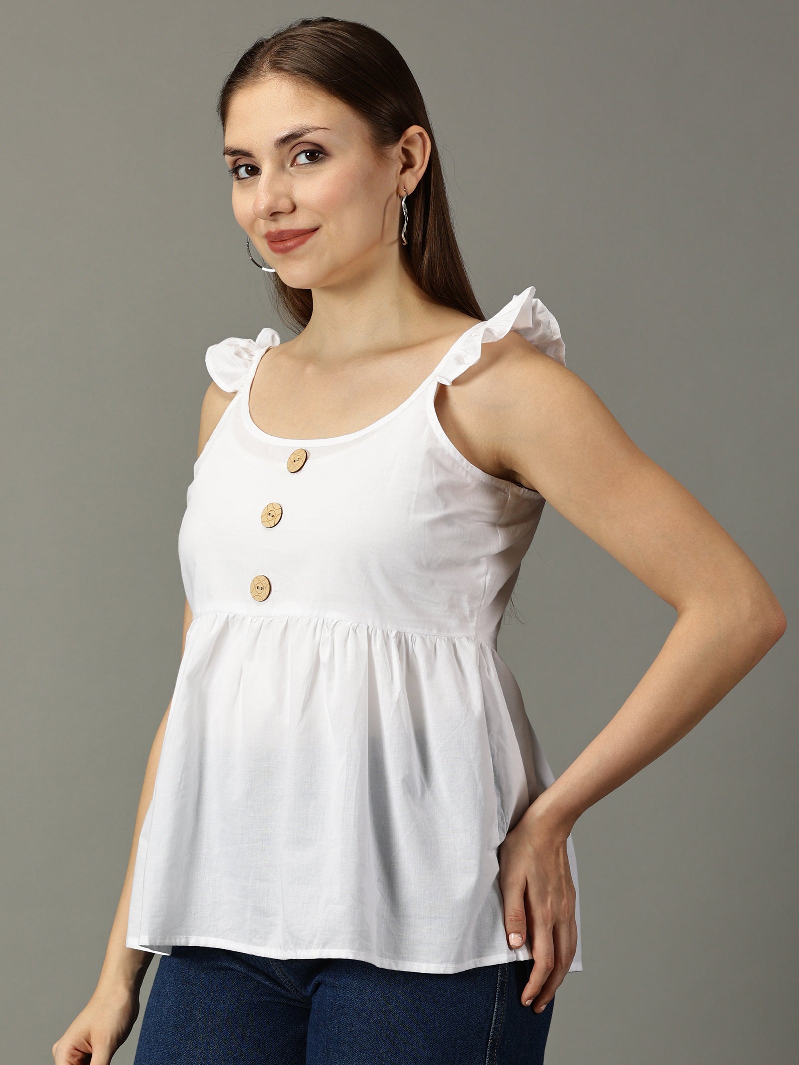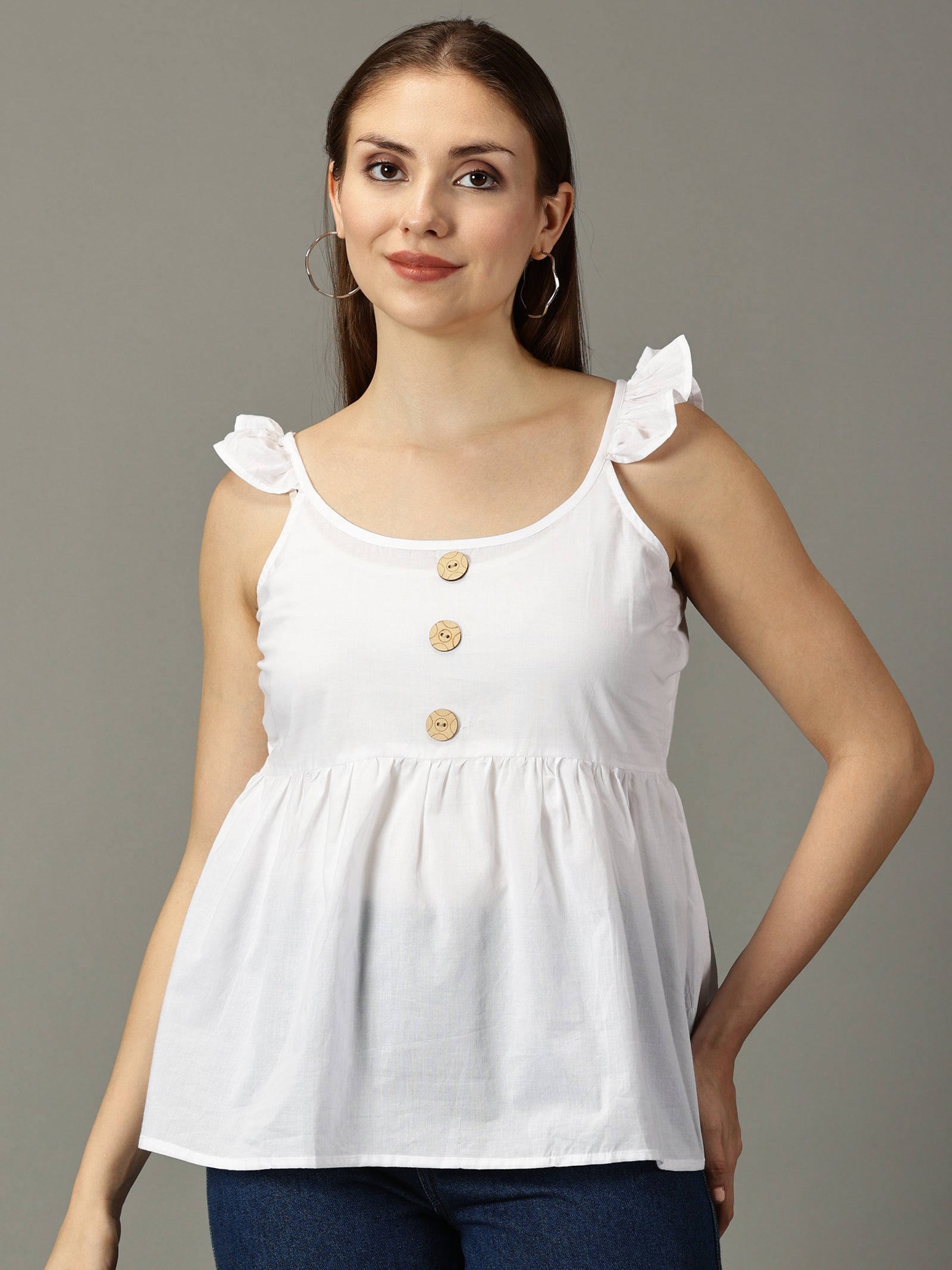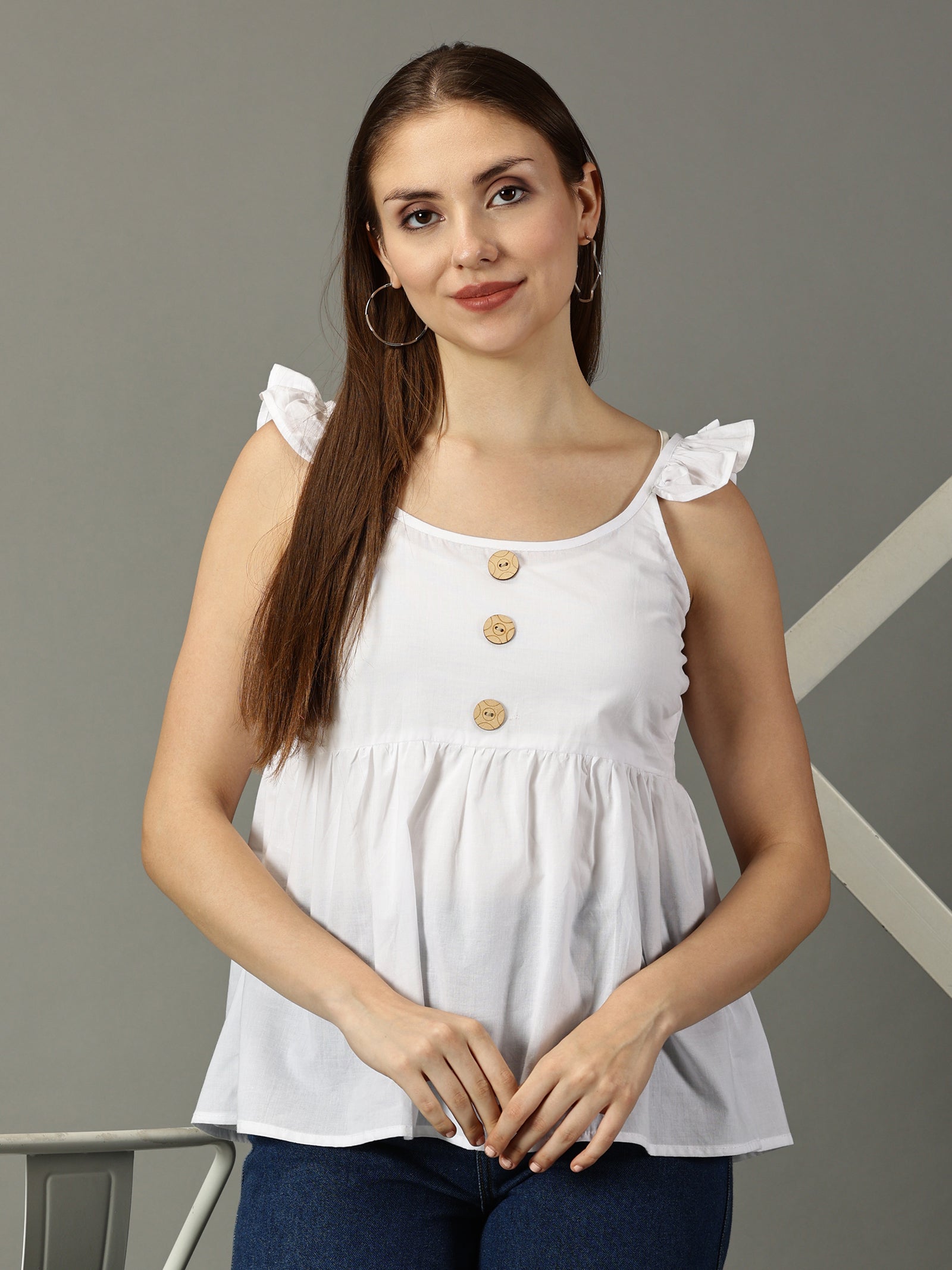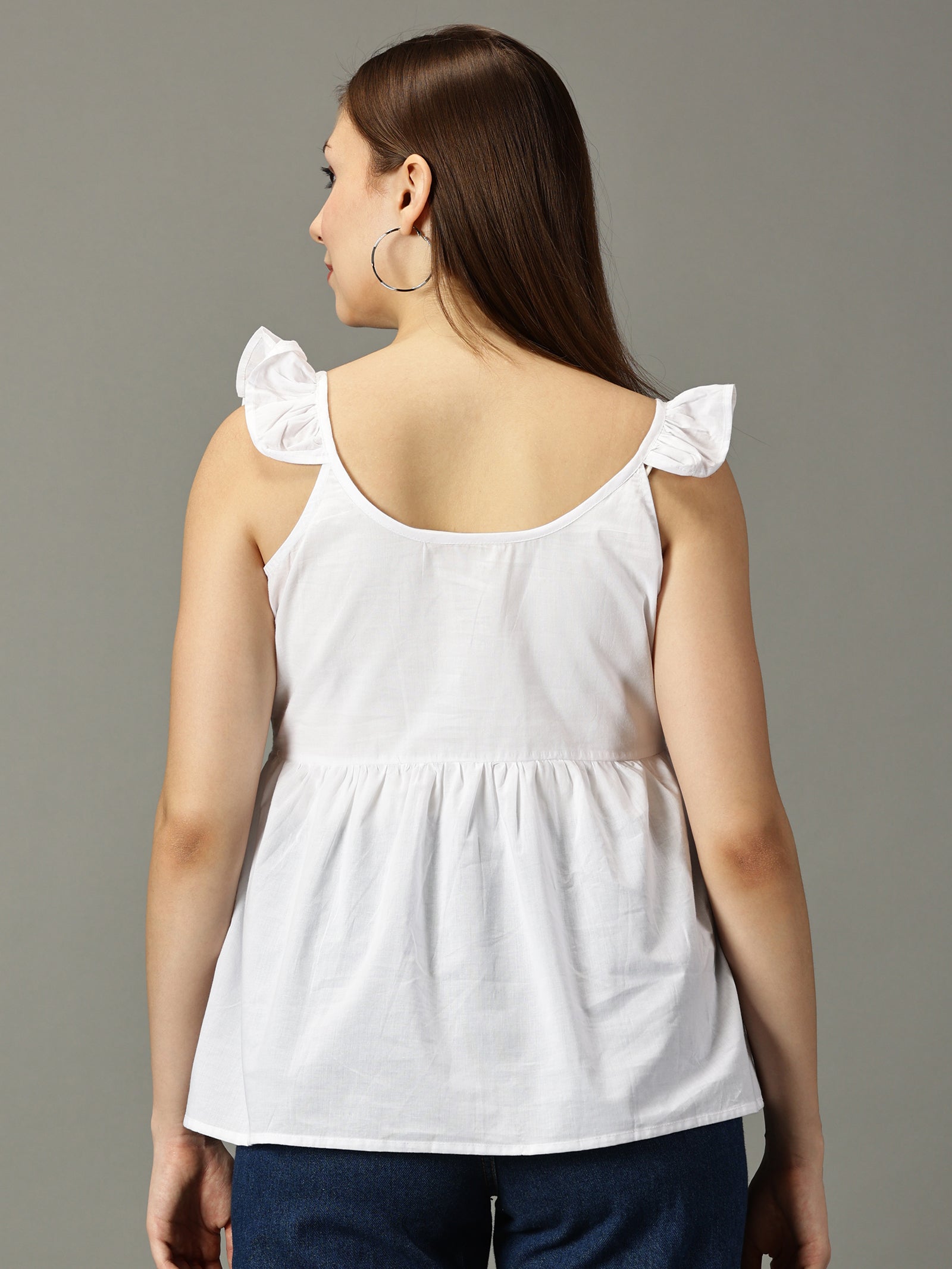 Our white solid cotton ruffled top crafted in soft cotton fabric features anotched neckline, sleeveless and stright hemline. Adorned with gilded, this graceful style isideal for casual outings.
