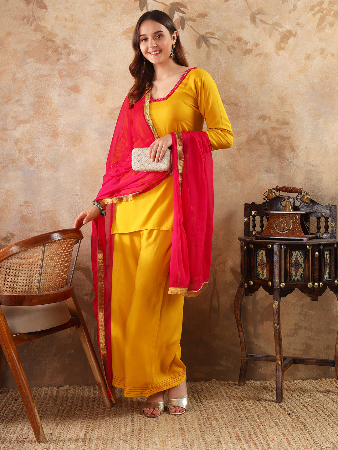 our 3-piece modal straight kurta set . Crafted in a yellow color , this suit set features a short-length stylish tiered kurta with straight palazzo and chiffon dupatta detailing with gotapatti.