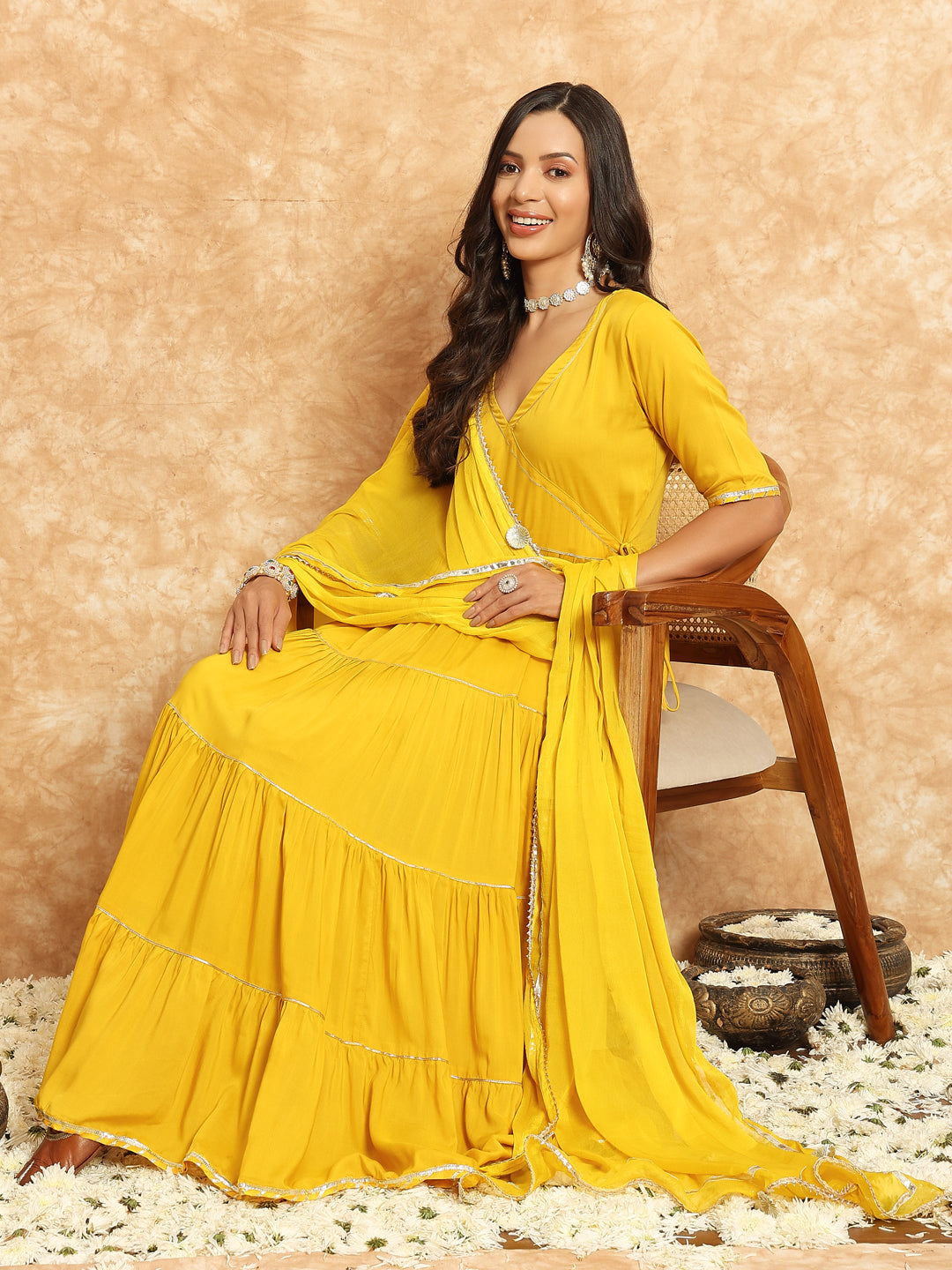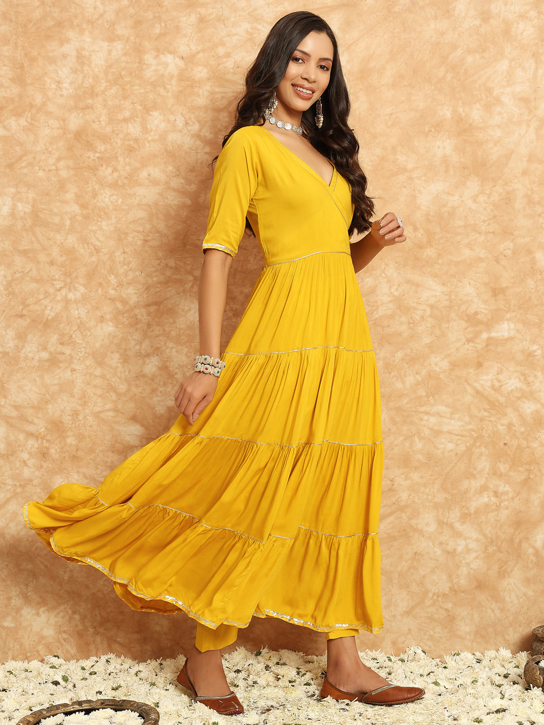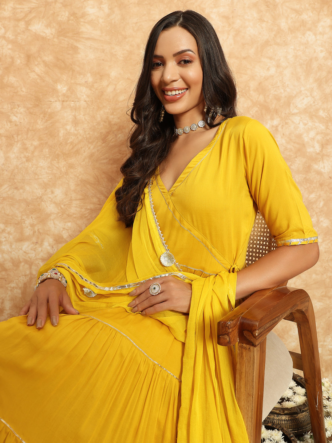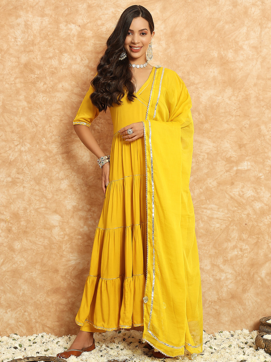 our 3-piece modal Angrakha kurta set . Crafted in a bright yellow, this suit set features a full-length stylish tiered kurta with straight pants and chiffon dupatta.