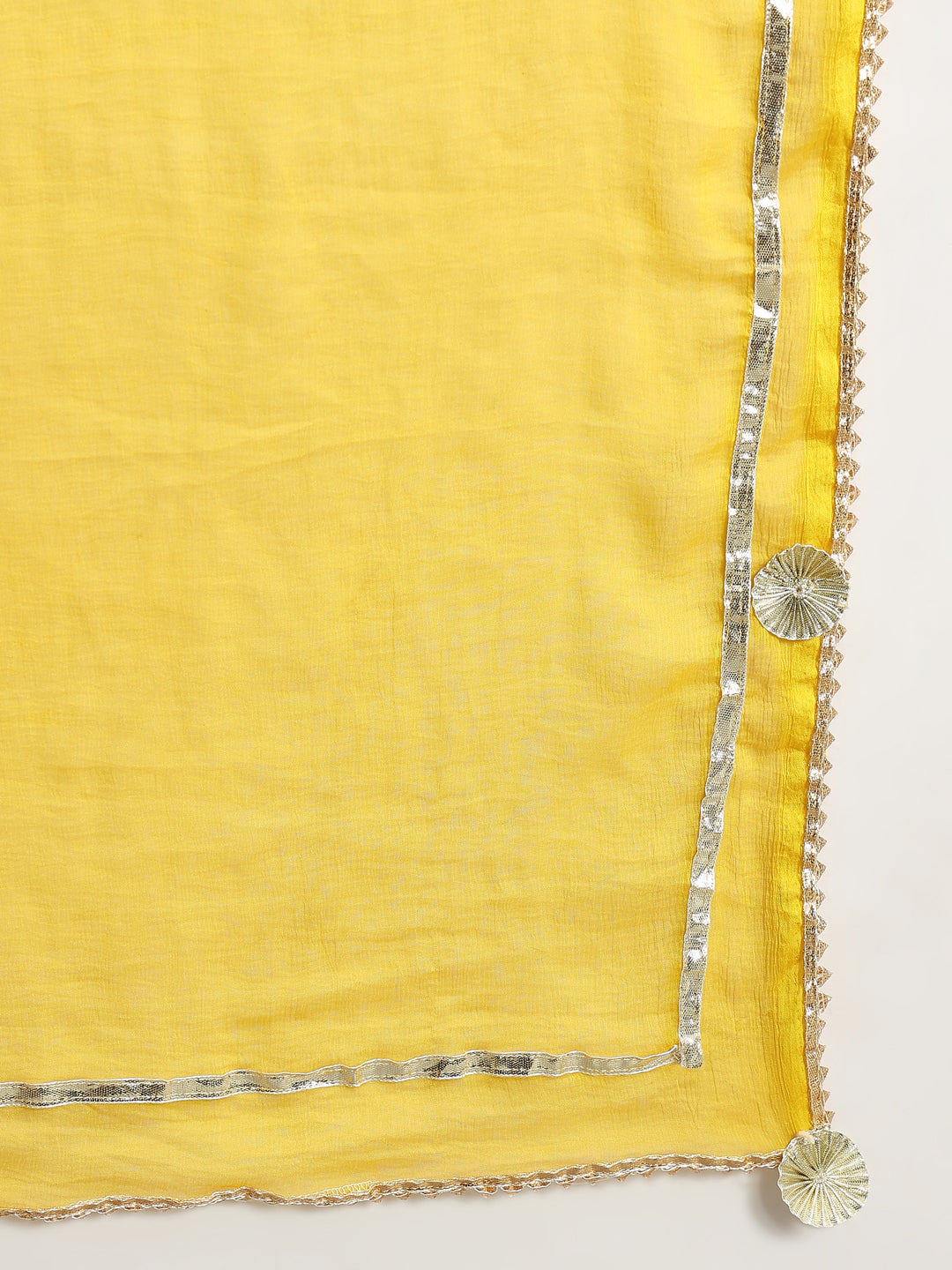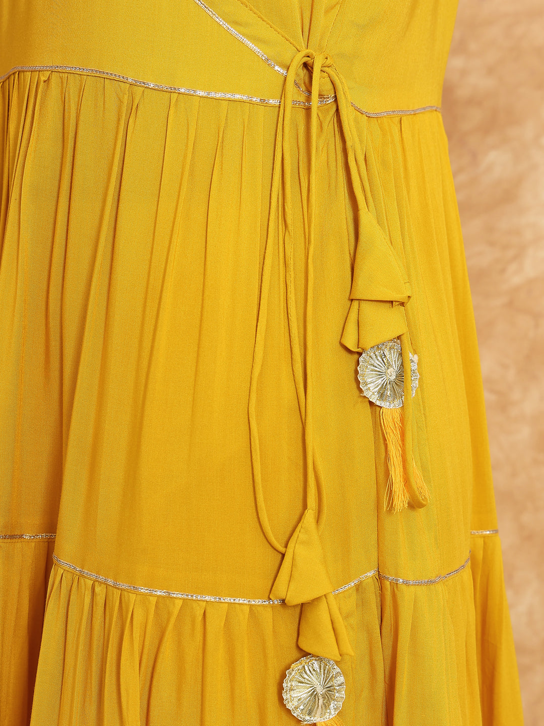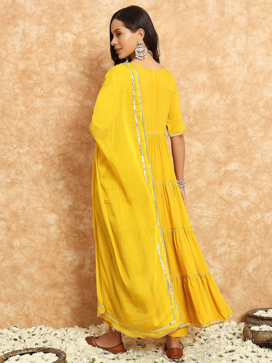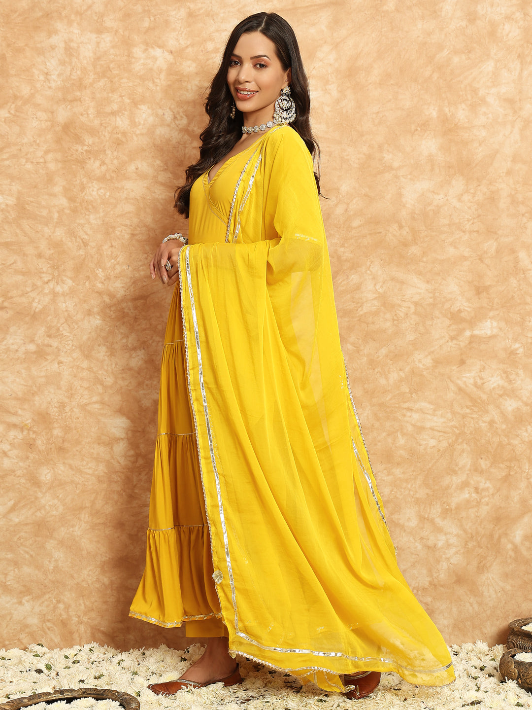 our 3-piece modal Angrakha kurta set . Crafted in a bright yellow, this suit set features a full-length stylish tiered kurta with straight pants and chiffon dupatta.